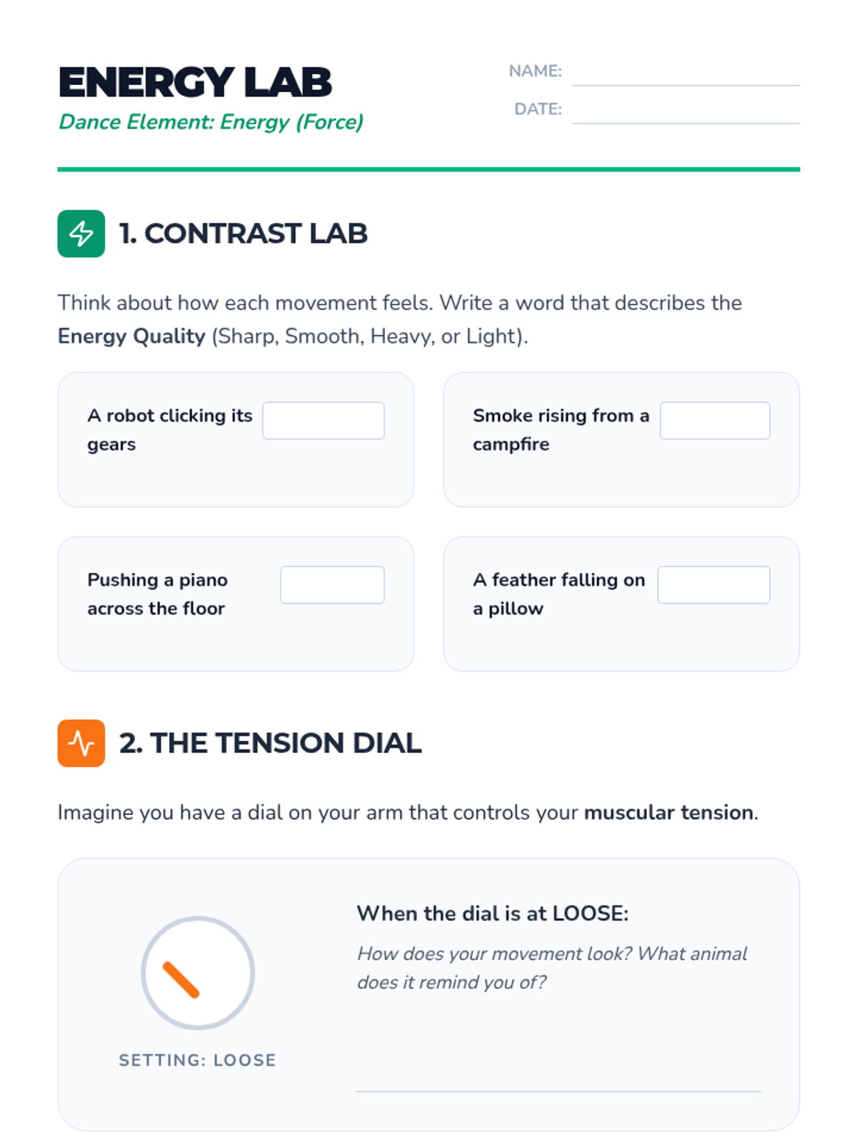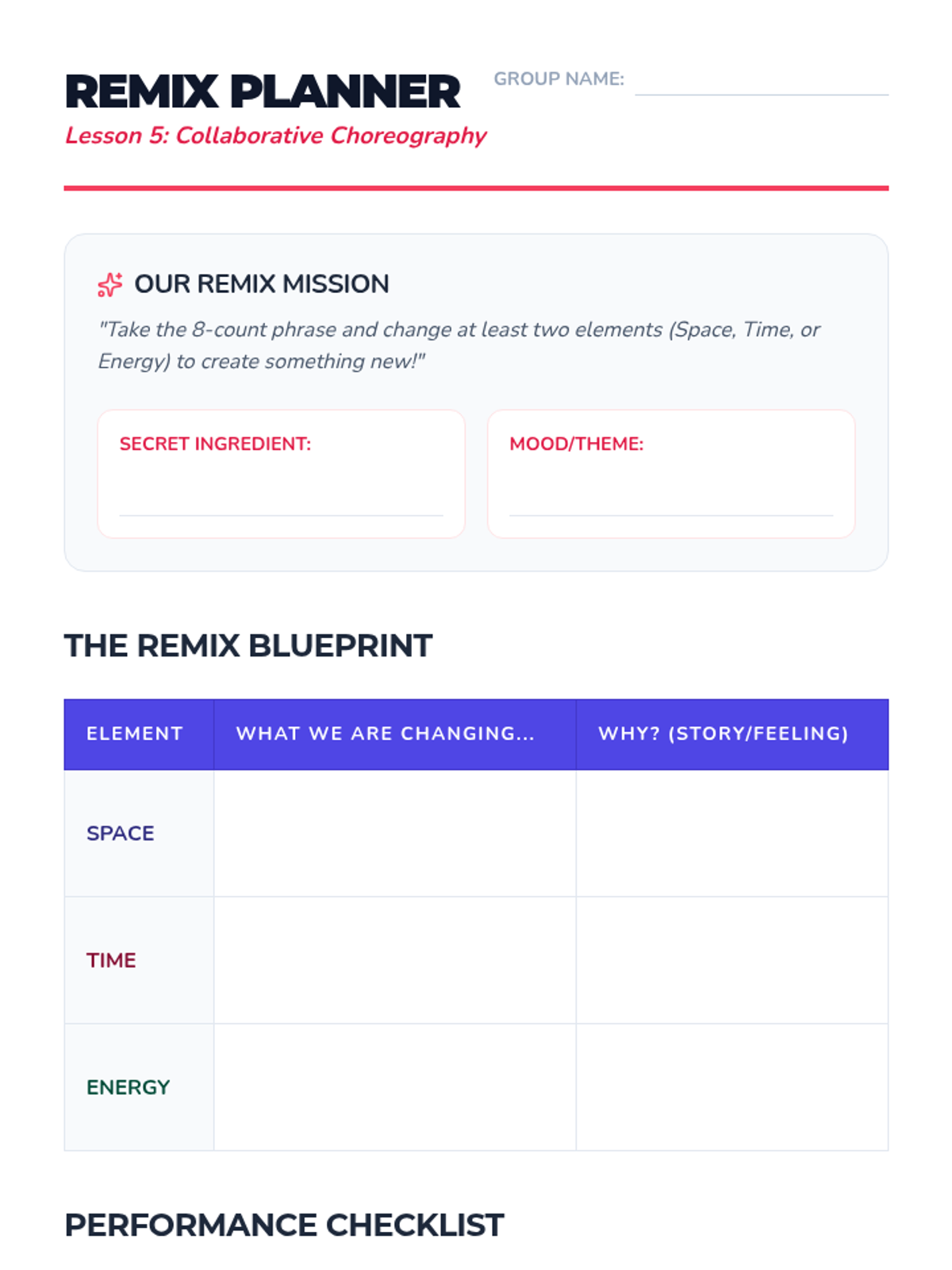 A comprehensive 5-lesson sequence for 4th graders exploring the foundational elements of dance: Space, Time, and Energy. Students progress from basic spatial awareness to collaborative choreography, learning how movement choices express meaning.