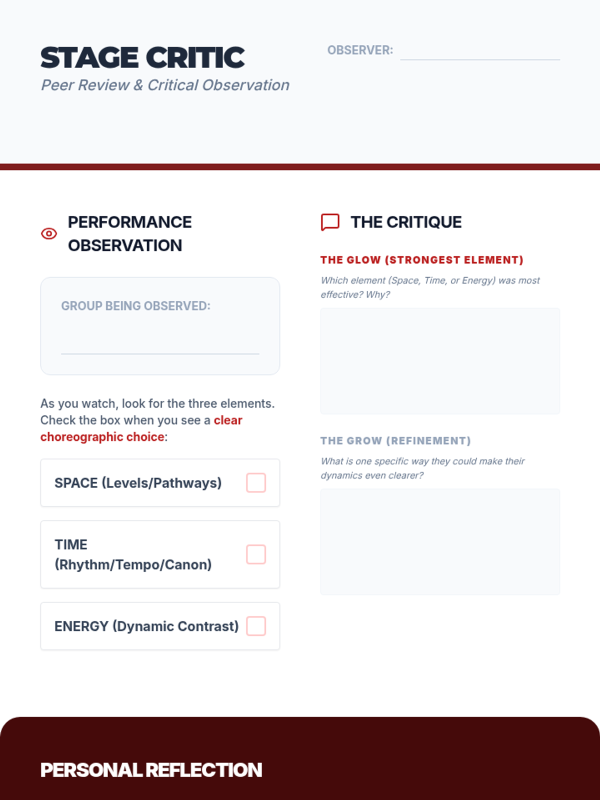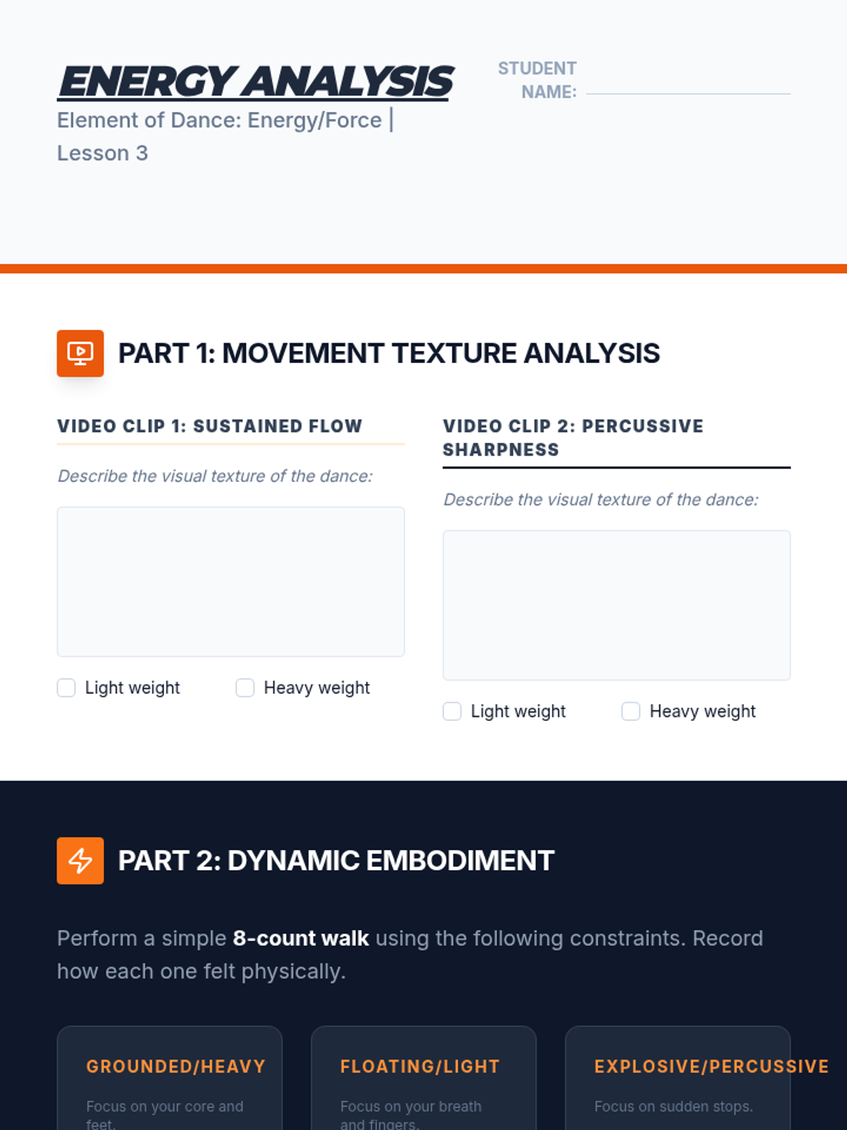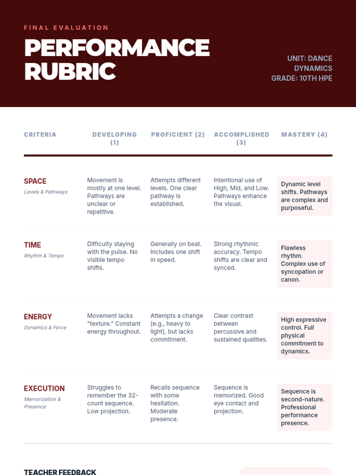 A comprehensive 10th-grade dance unit exploring the fundamental elements of choreography: Space, Time, and Energy. Students progress from basic spatial awareness to complex synthesis and performance, developing both physical skill and critical analysis.