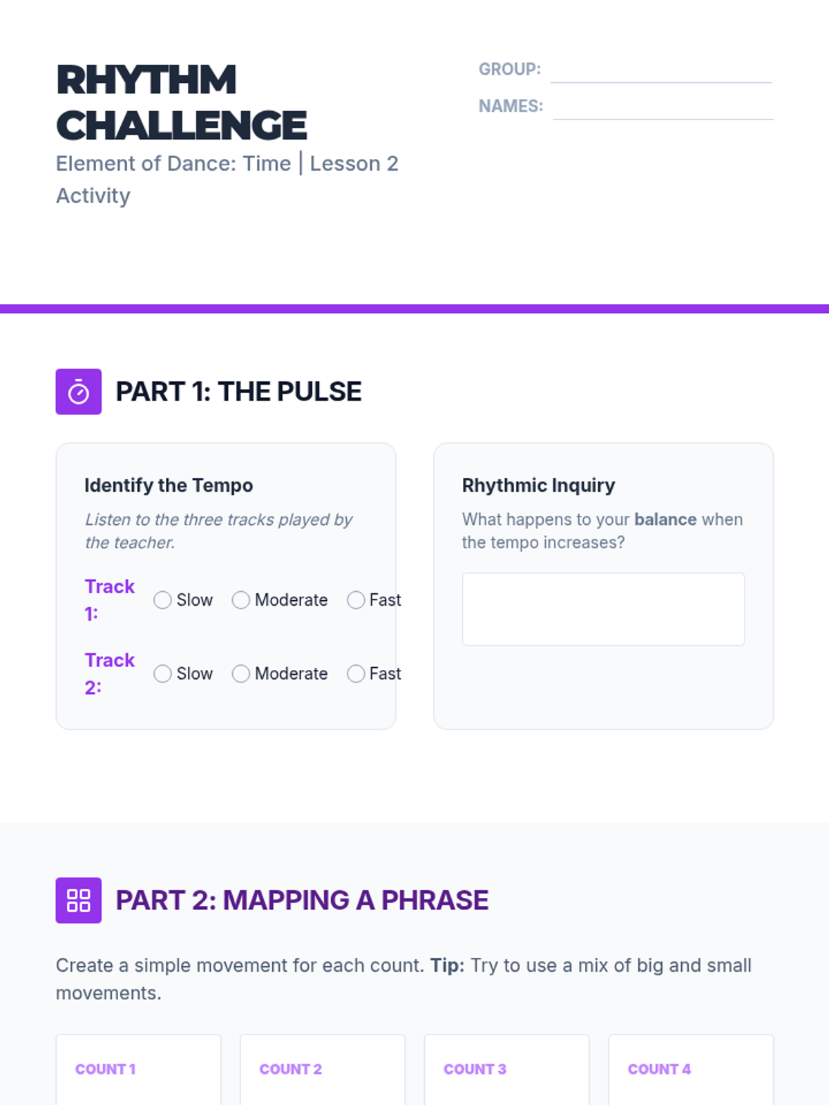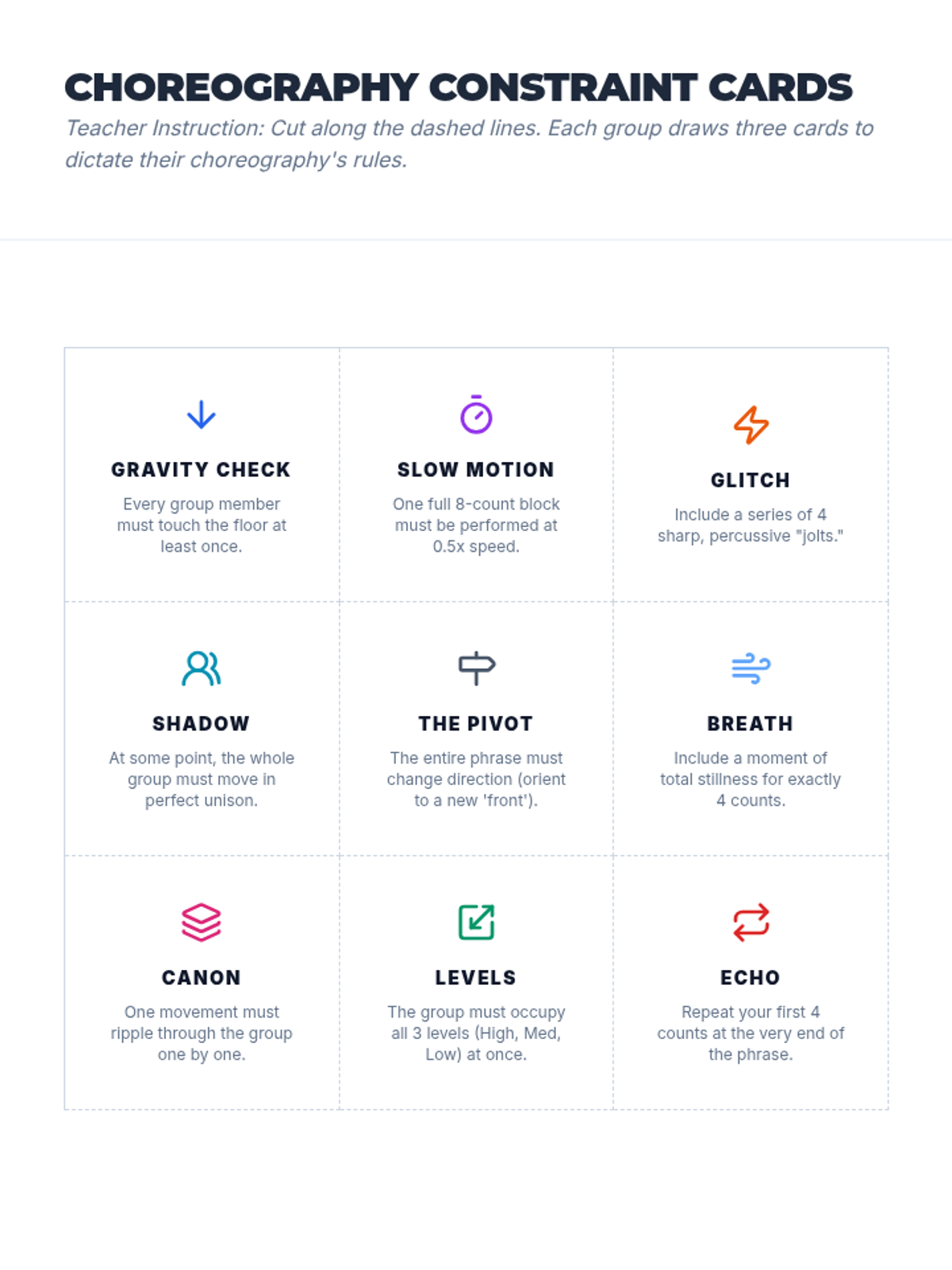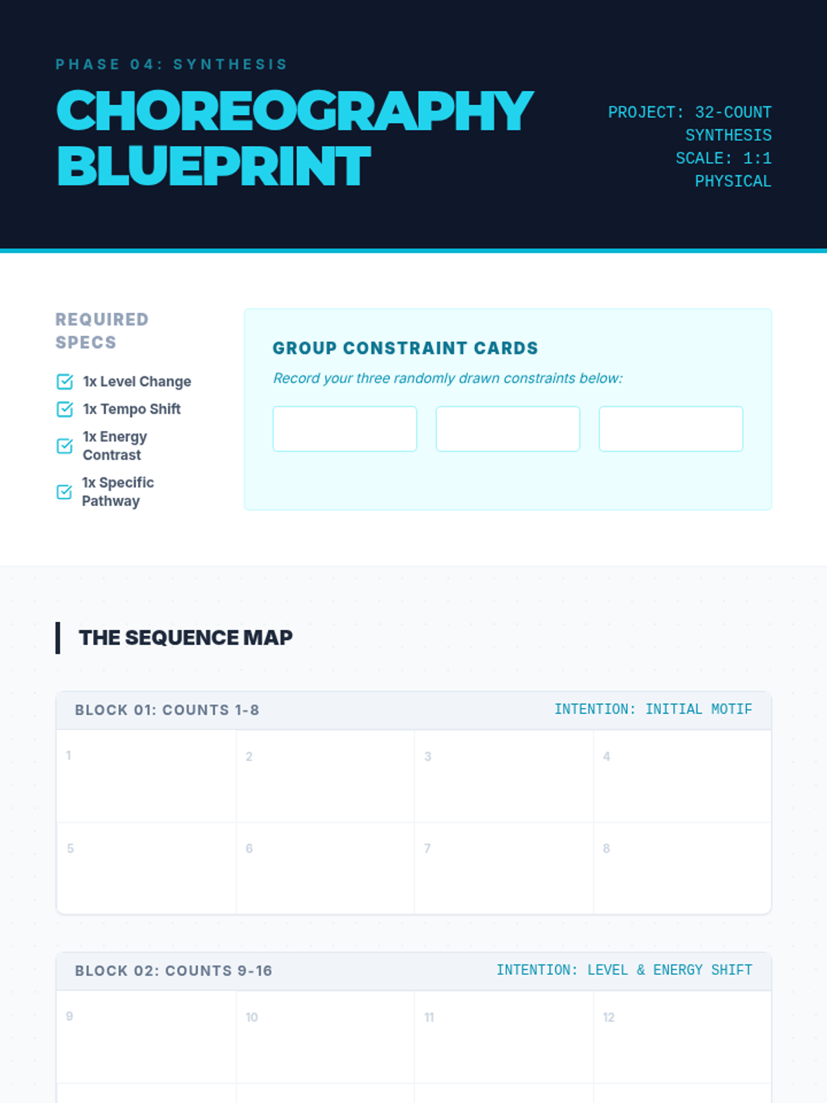 A comprehensive 10th-grade dance unit exploring the fundamental elements of choreography: Space, Time, and Energy. Students progress from basic spatial awareness to complex synthesis and performance, developing both physical skill and critical analysis.