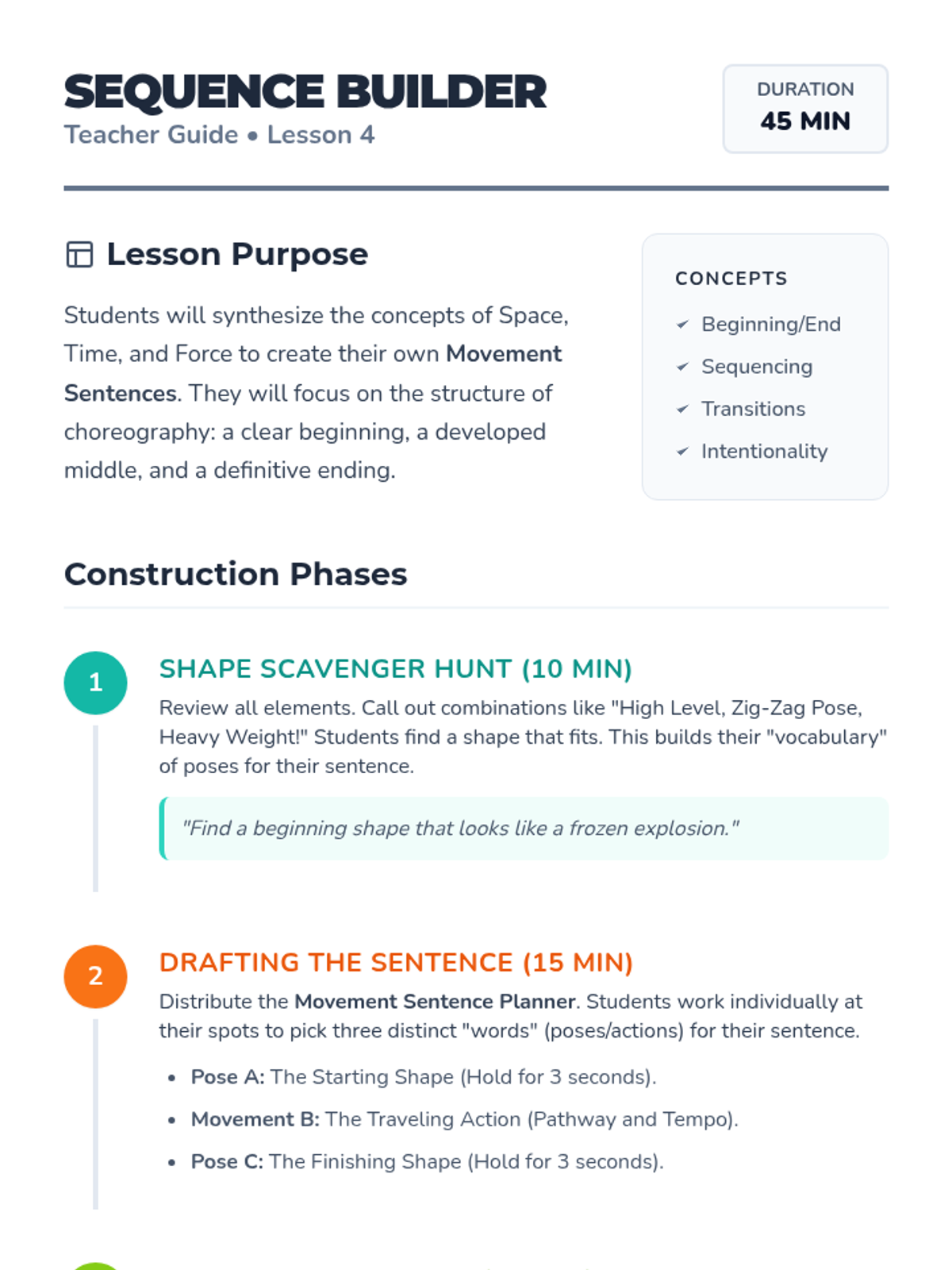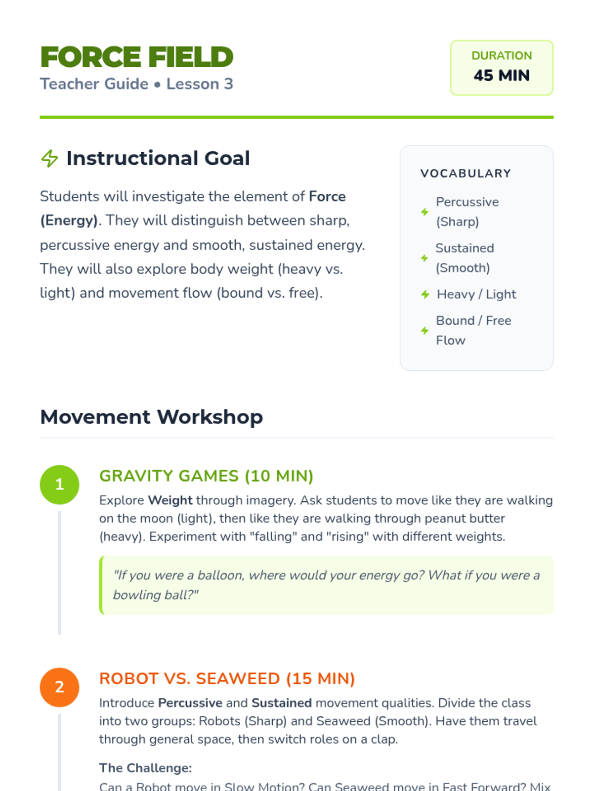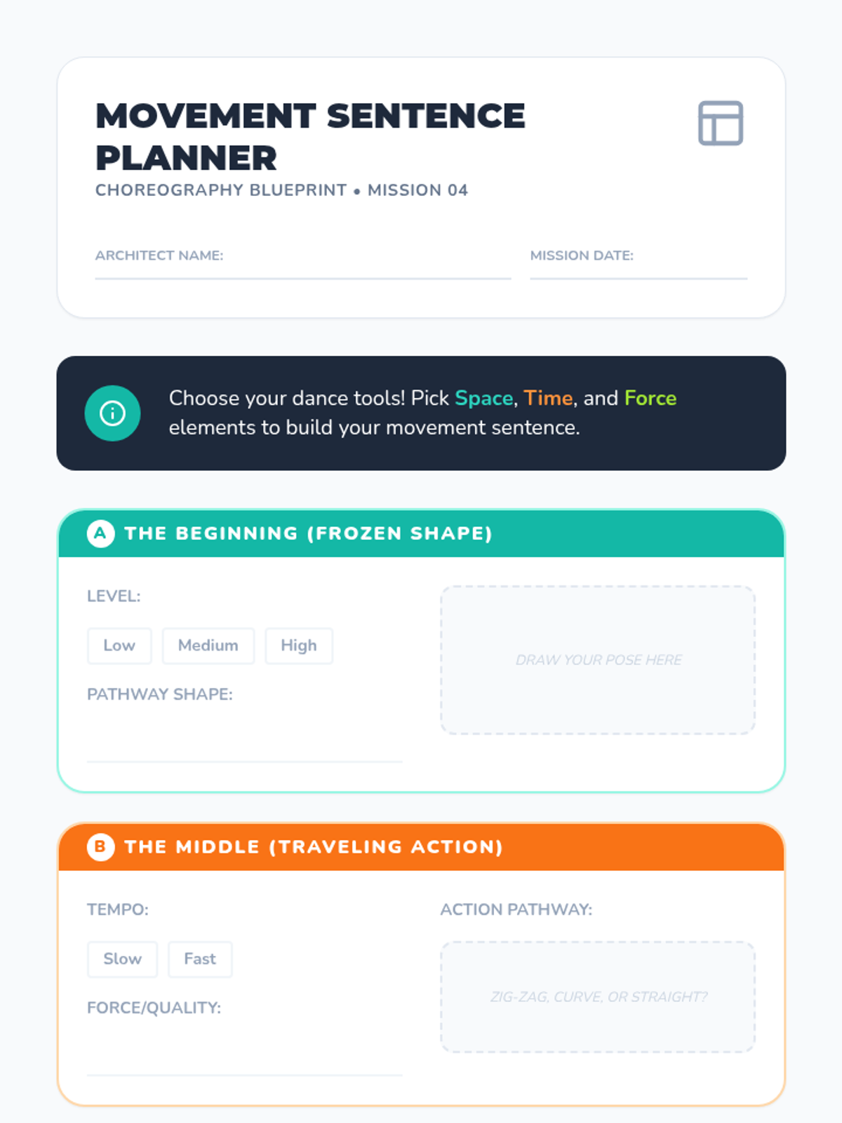 Students investigate the three primary building blocks of dance: space, time, and force through guided workshops and improvisation. The journey progresses from isolated explorations of levels and pathways to combining these dynamics into expressive movement sentences.