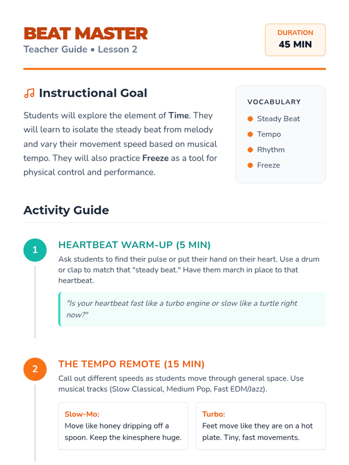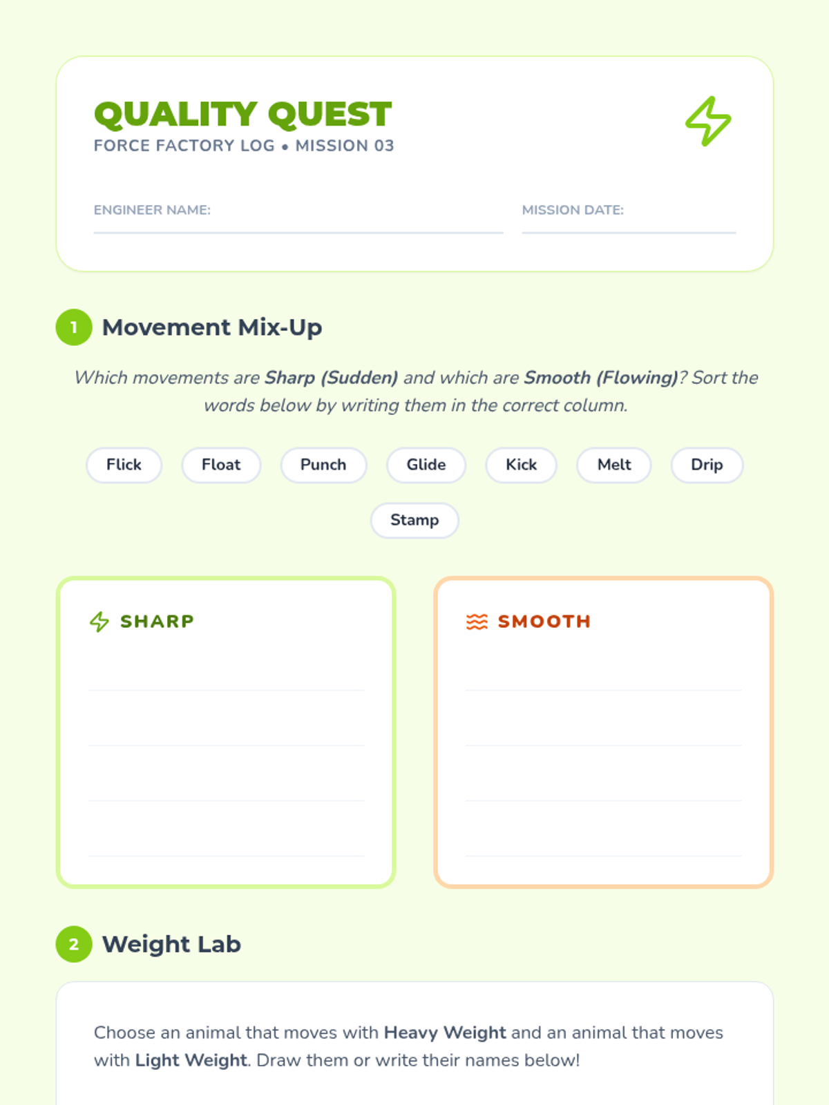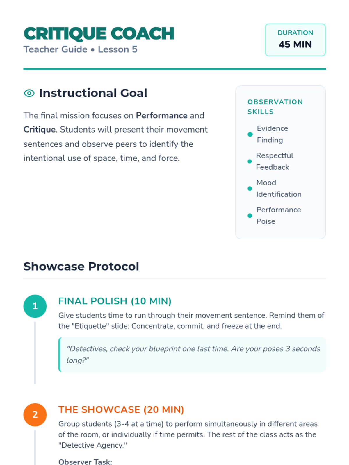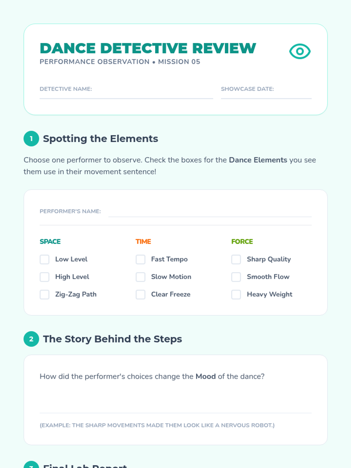Students investigate the three primary building blocks of dance: space, time, and force through guided workshops and improvisation. The journey progresses from isolated explorations of levels and pathways to combining these dynamics into expressive movement sentences.