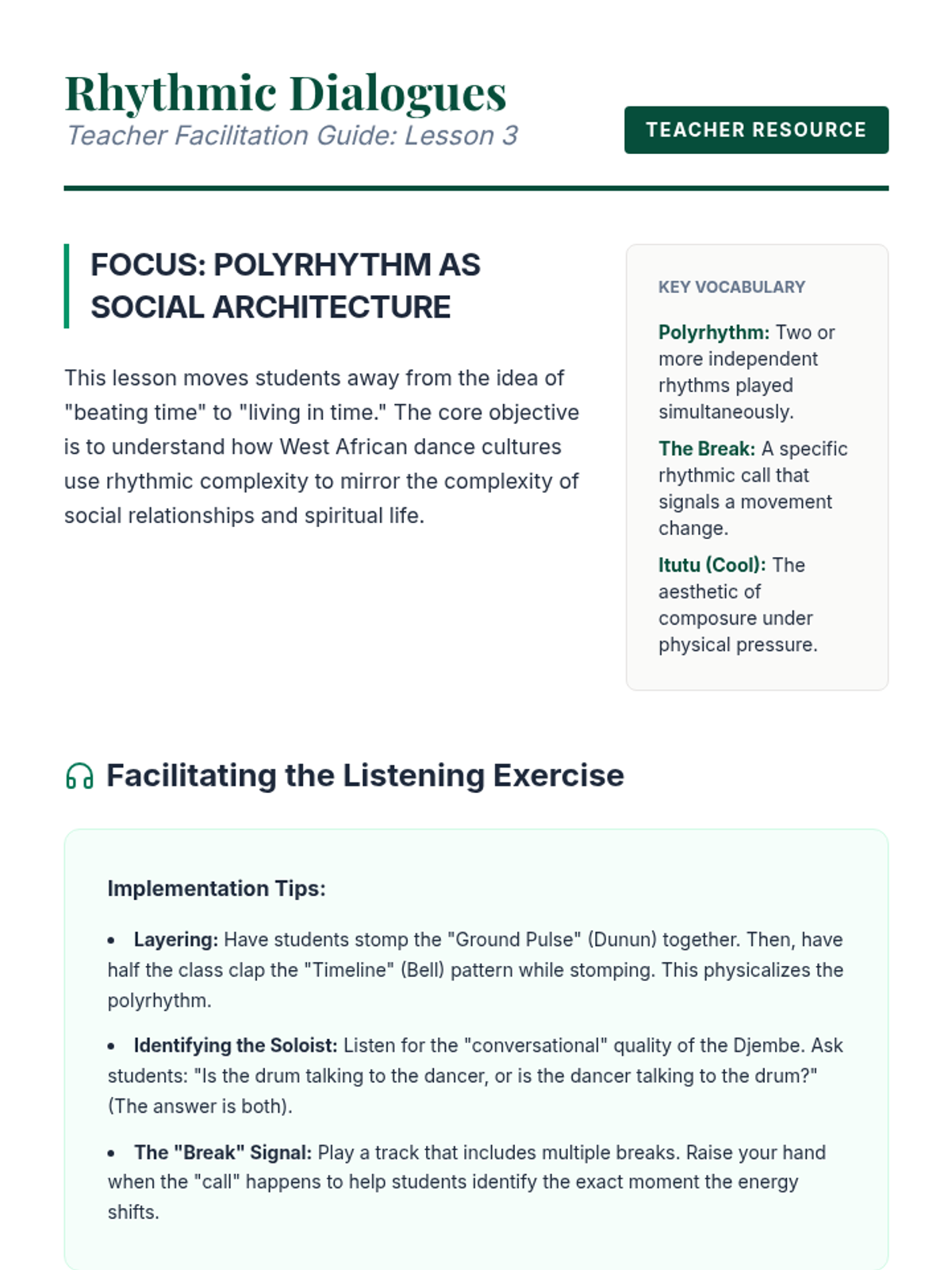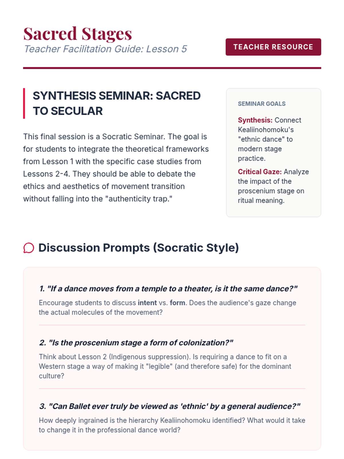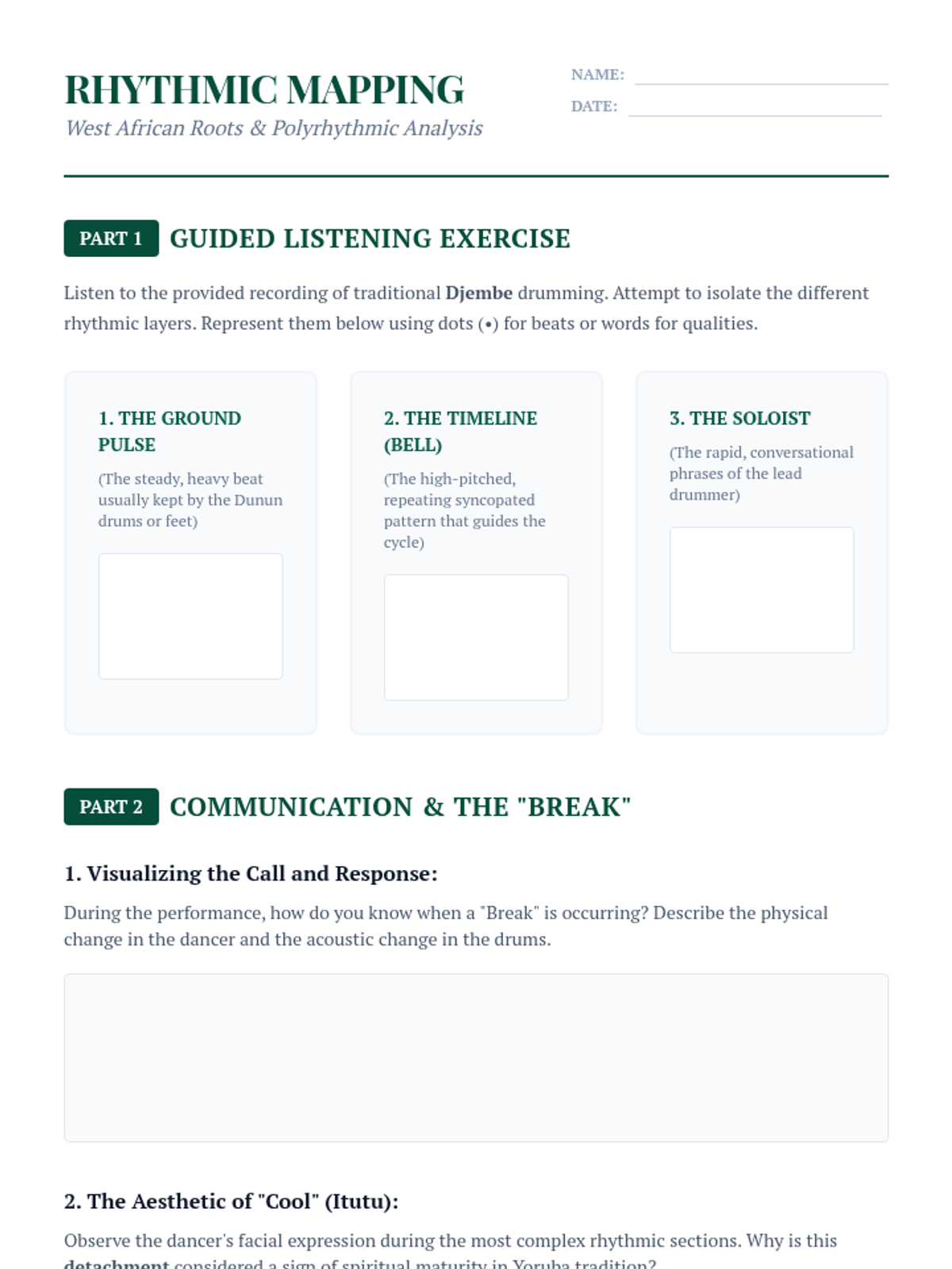 This sequence introduces undergraduate students to the anthropological frameworks used to study dance in its ritual and social contexts. Students explore the function of movement in religious, social, and healing practices across Indigenous American, West African, and Ancient Greek traditions, culminating in an analysis of how sacred dances transition to secular stages.