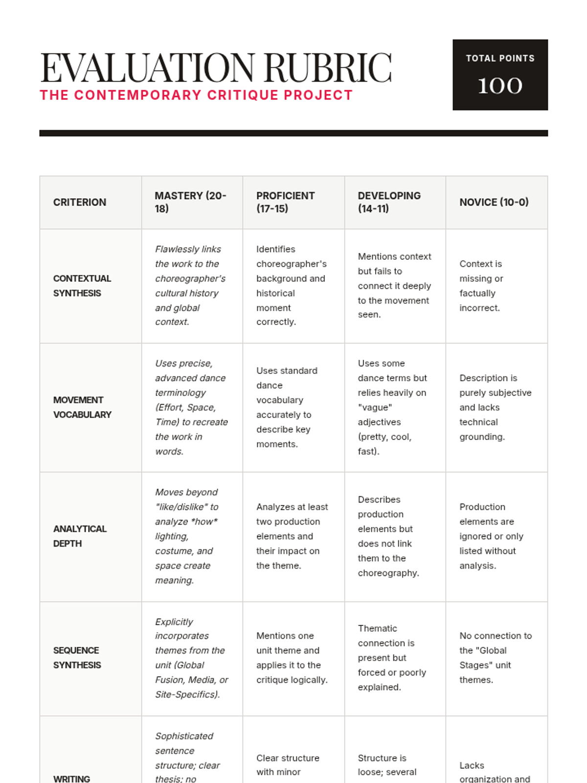 An 11th-grade dance history sequence exploring how globalization, technology, and site-specific performance redefine contemporary dance. Students analyze hybrid identities, digital media's impact on choreography, and the ethics of social media trends.