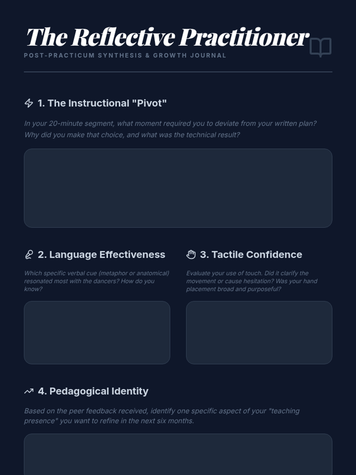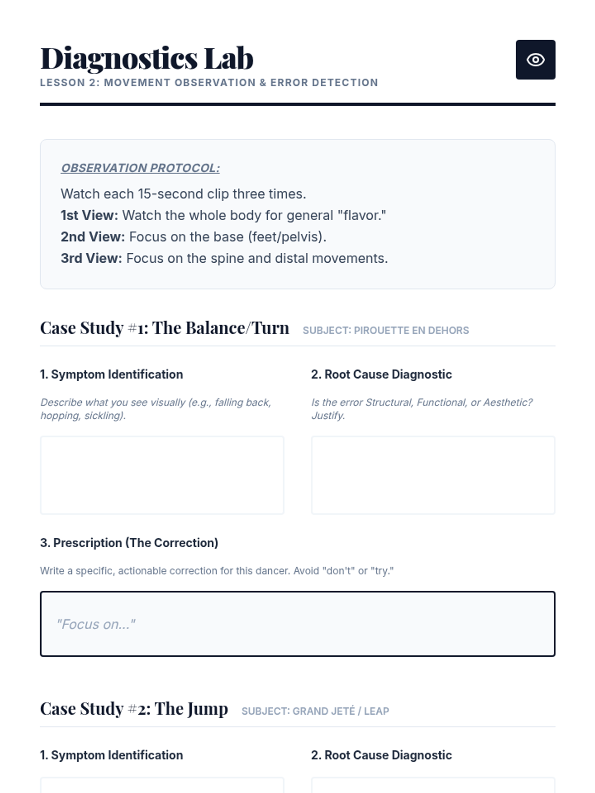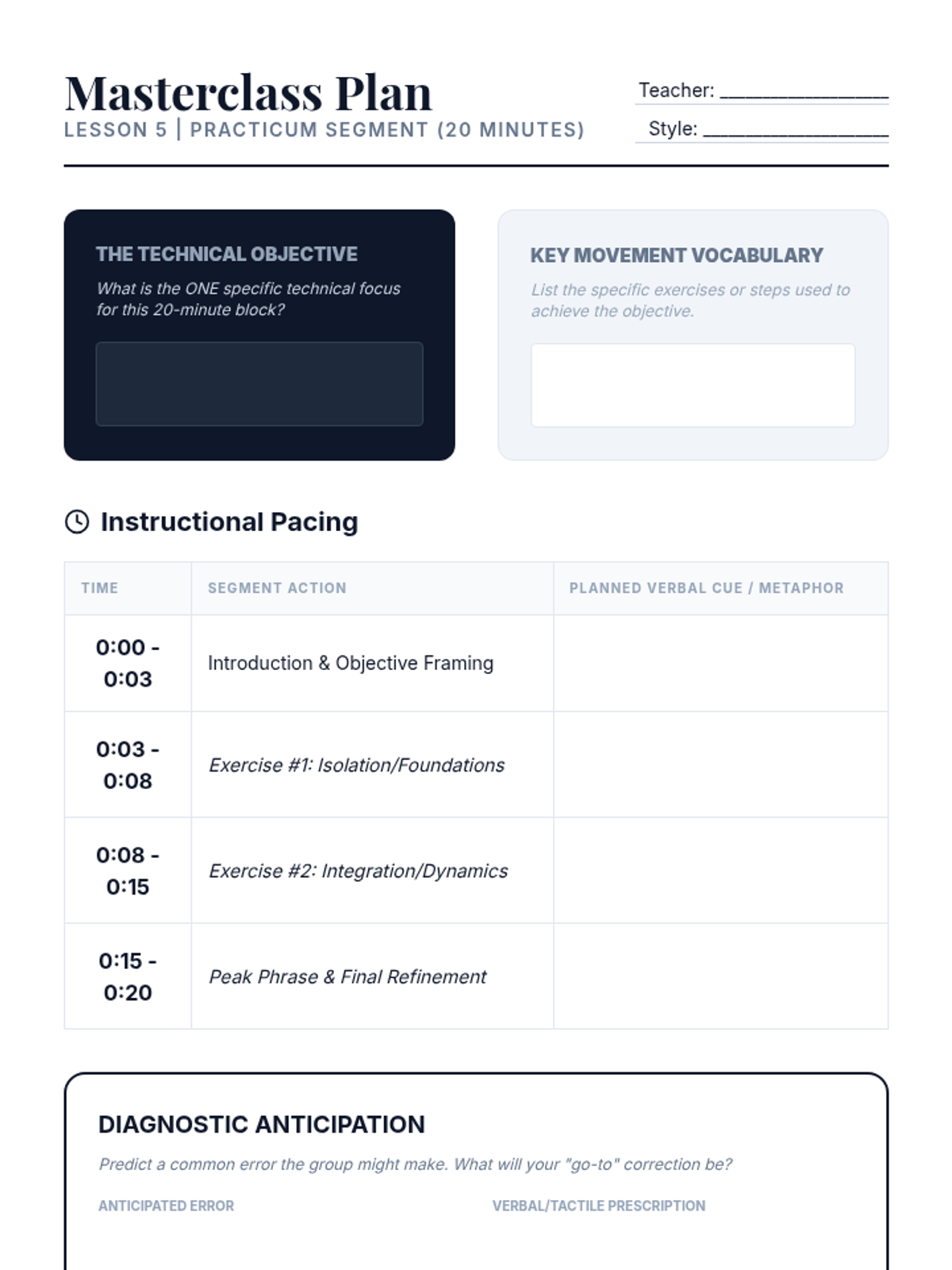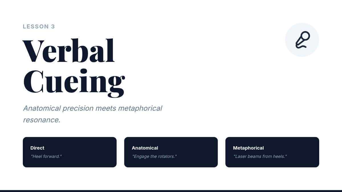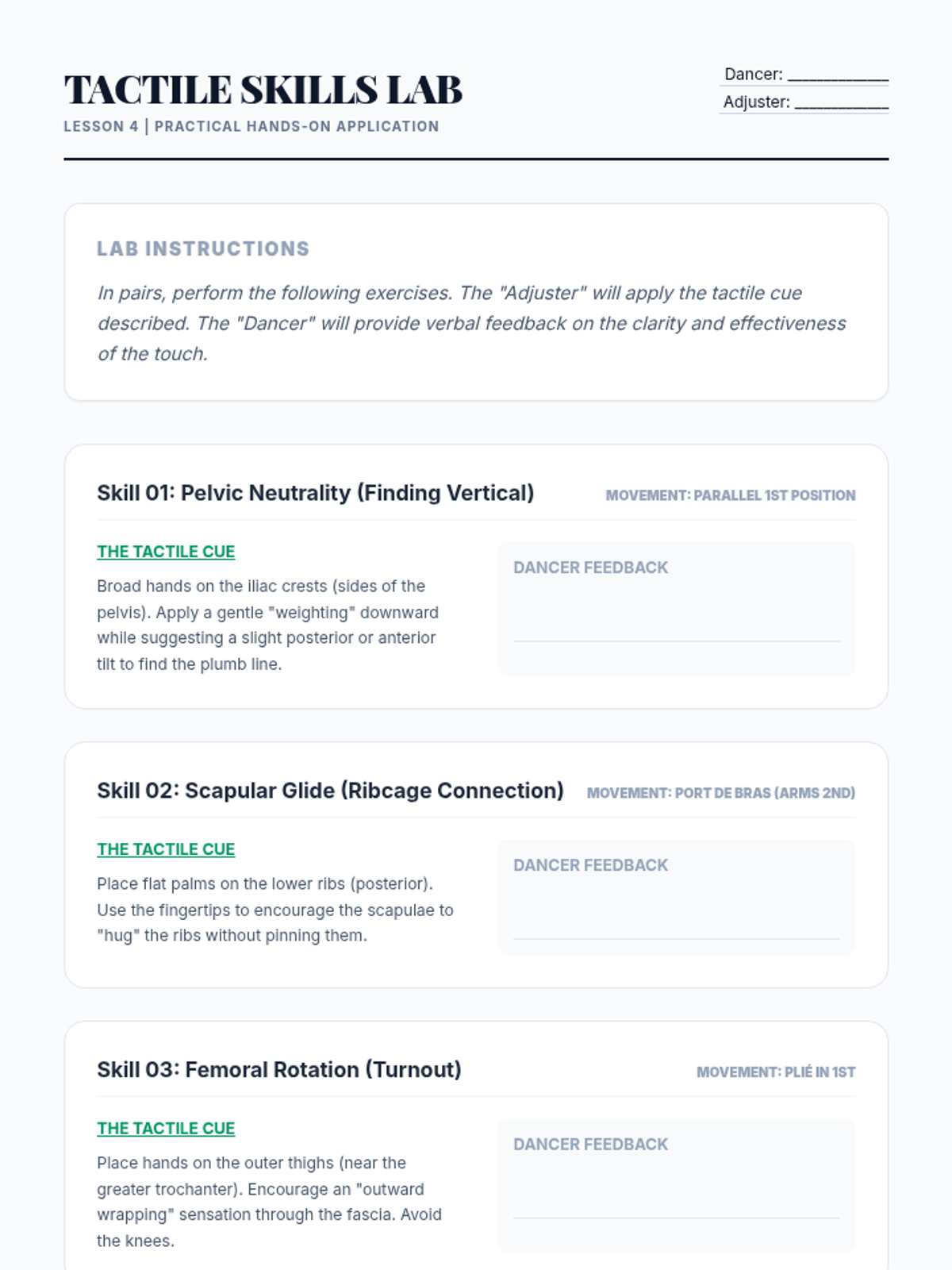 A comprehensive graduate-level sequence exploring the pedagogical architecture of dance technique. Students analyze curriculum logic, error detection, verbal cueing, and tactile adjustments, culminating in a practical teaching lab to refine their instructional mastery.