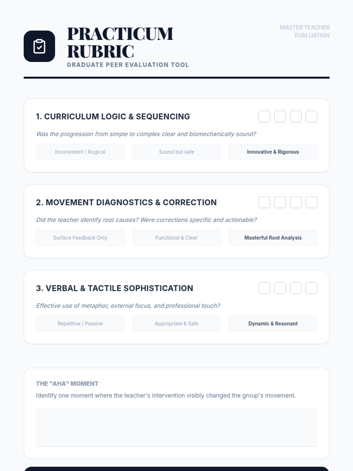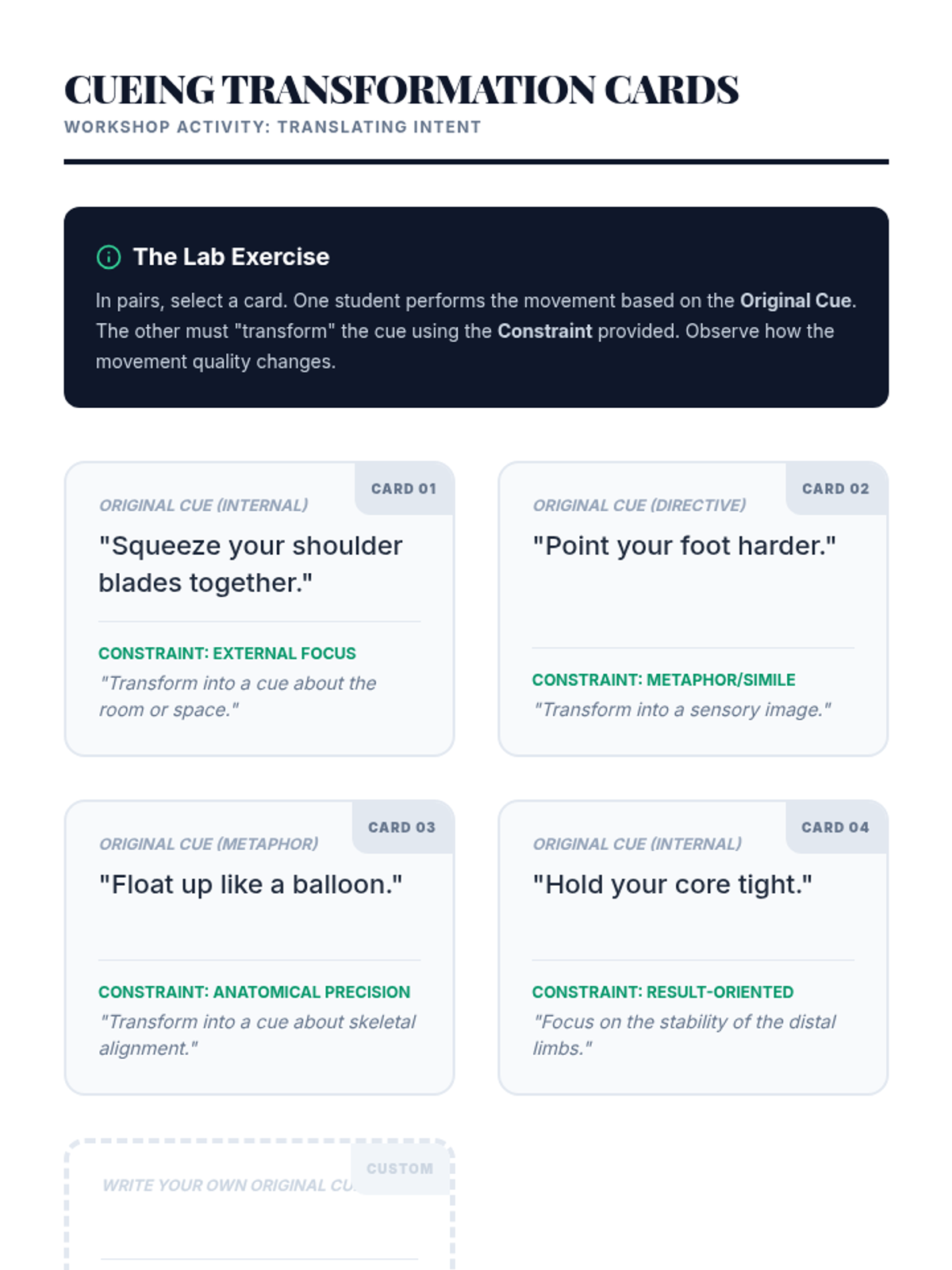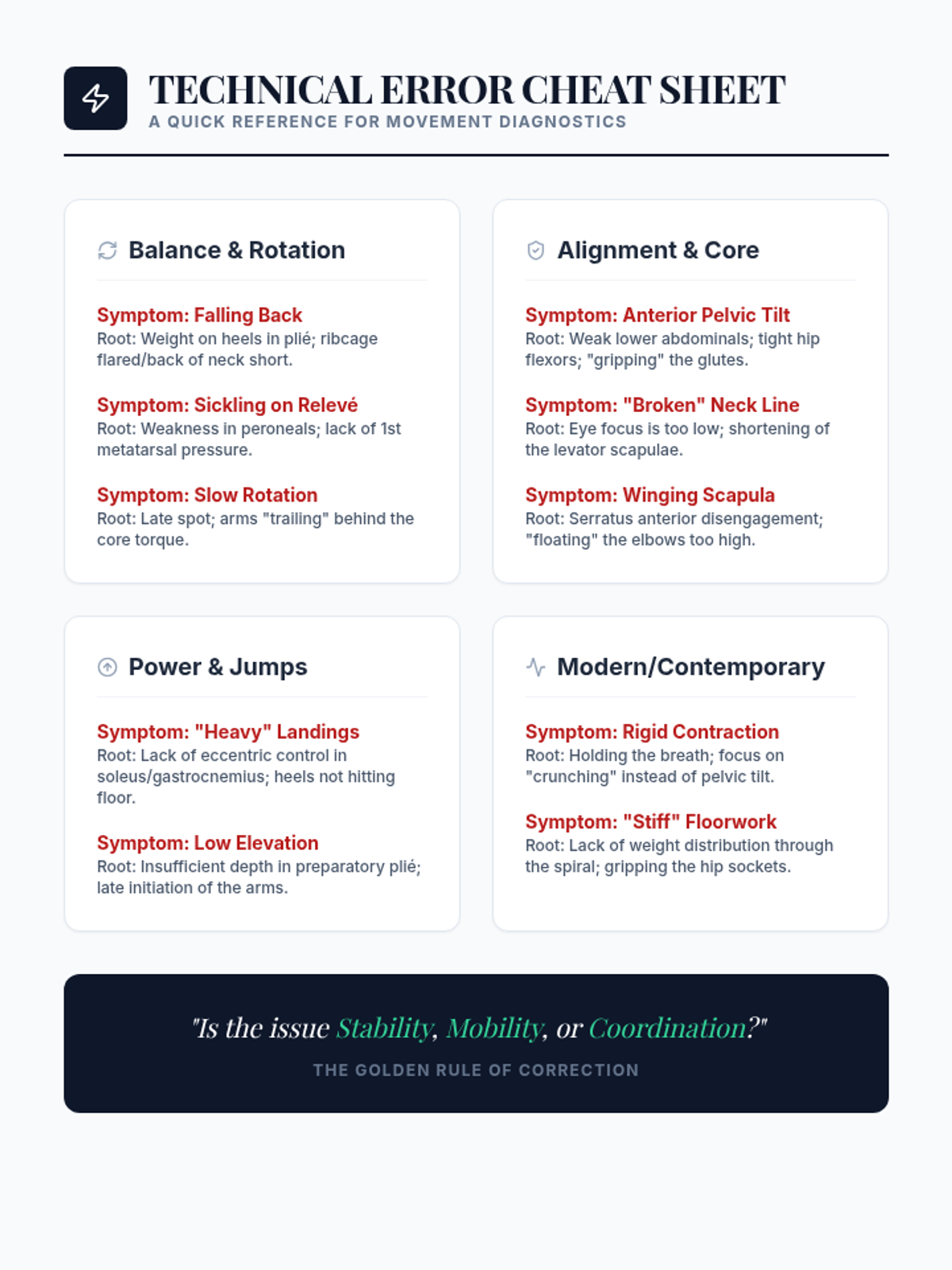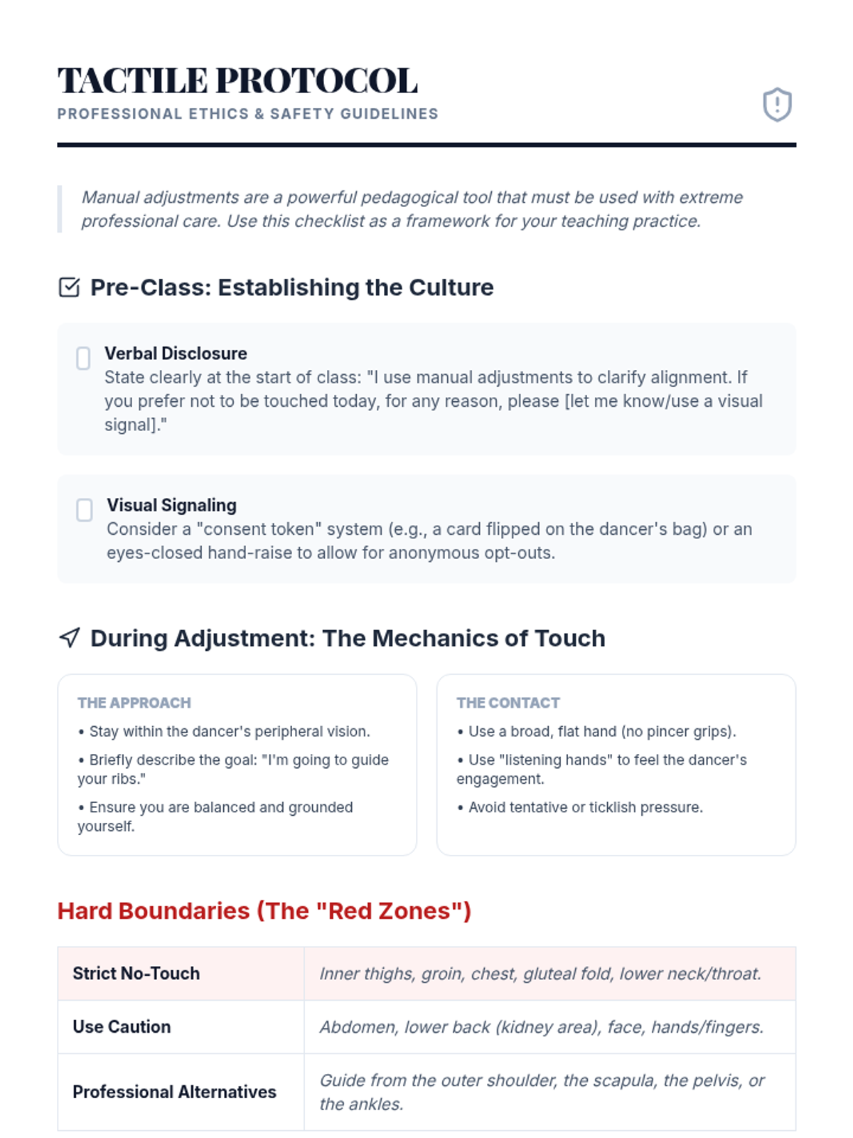 A comprehensive graduate-level sequence exploring the pedagogical architecture of dance technique. Students analyze curriculum logic, error detection, verbal cueing, and tactile adjustments, culminating in a practical teaching lab to refine their instructional mastery.