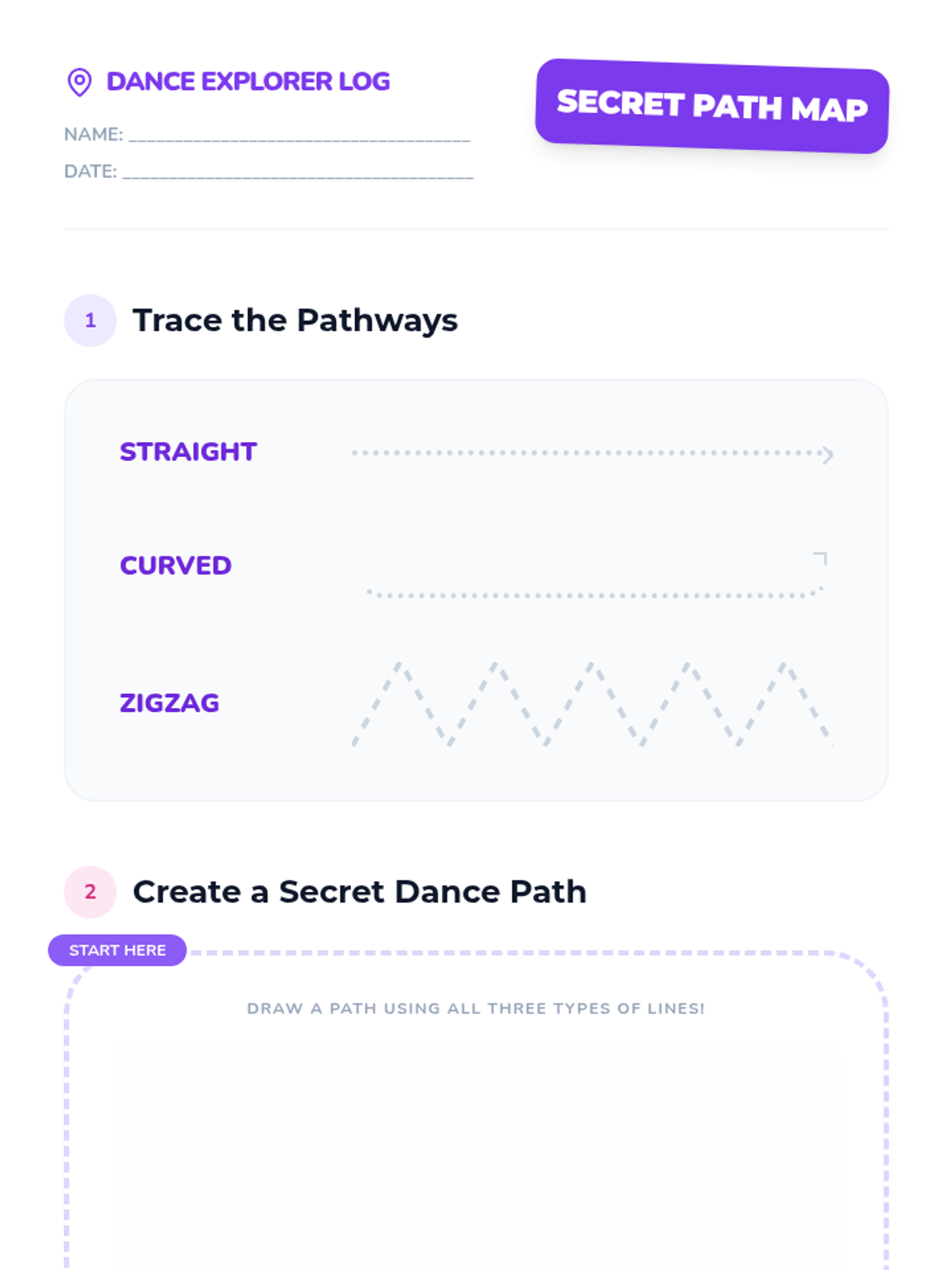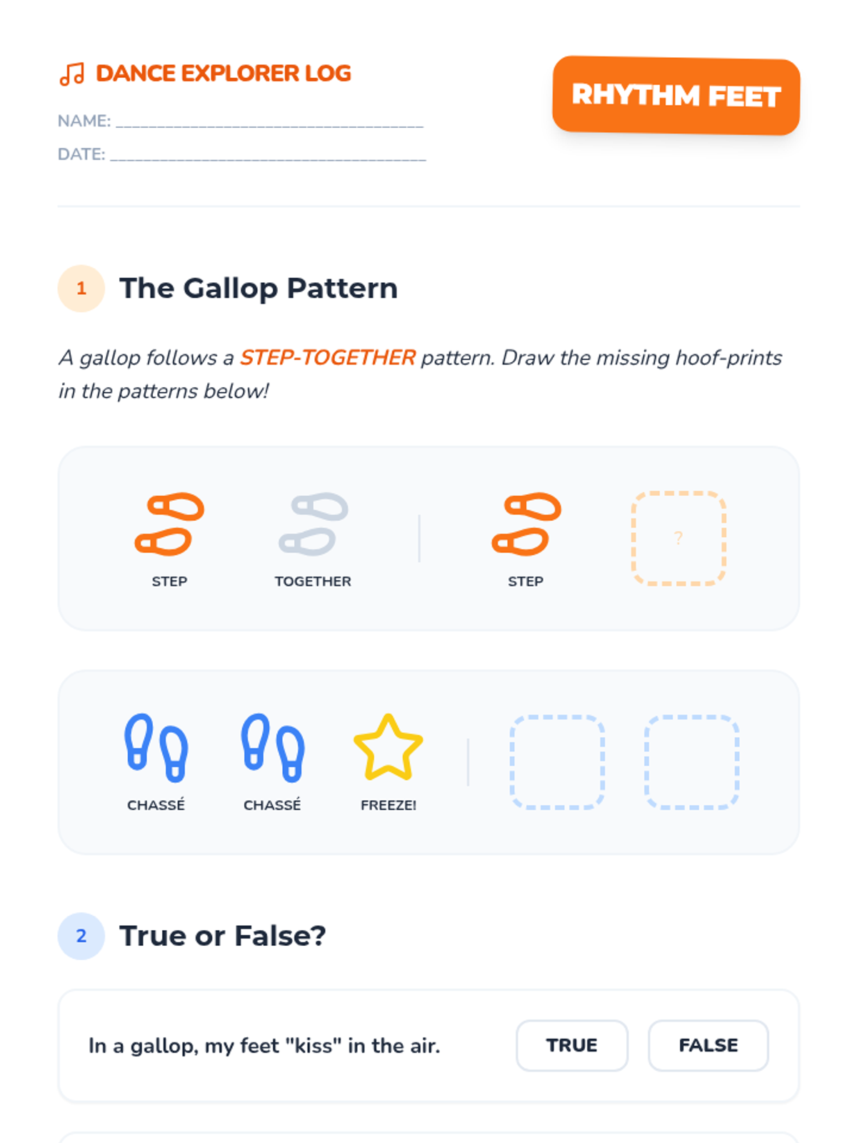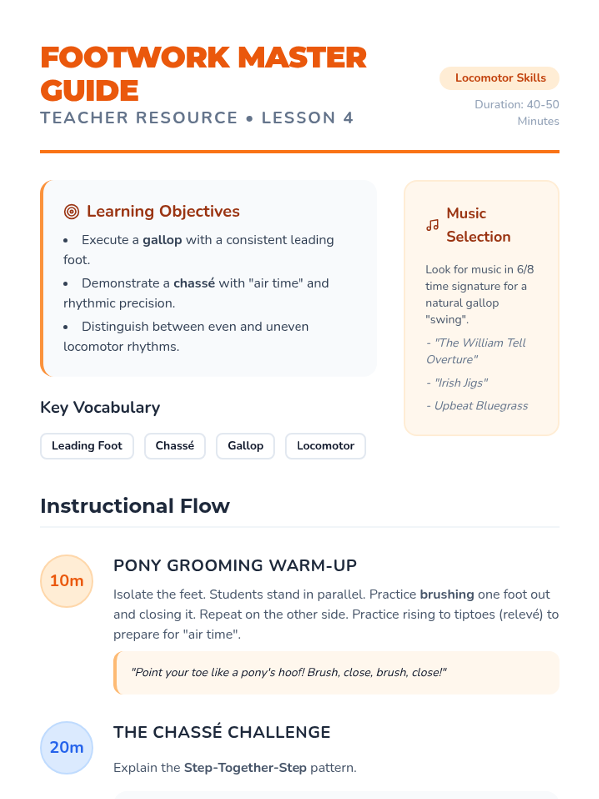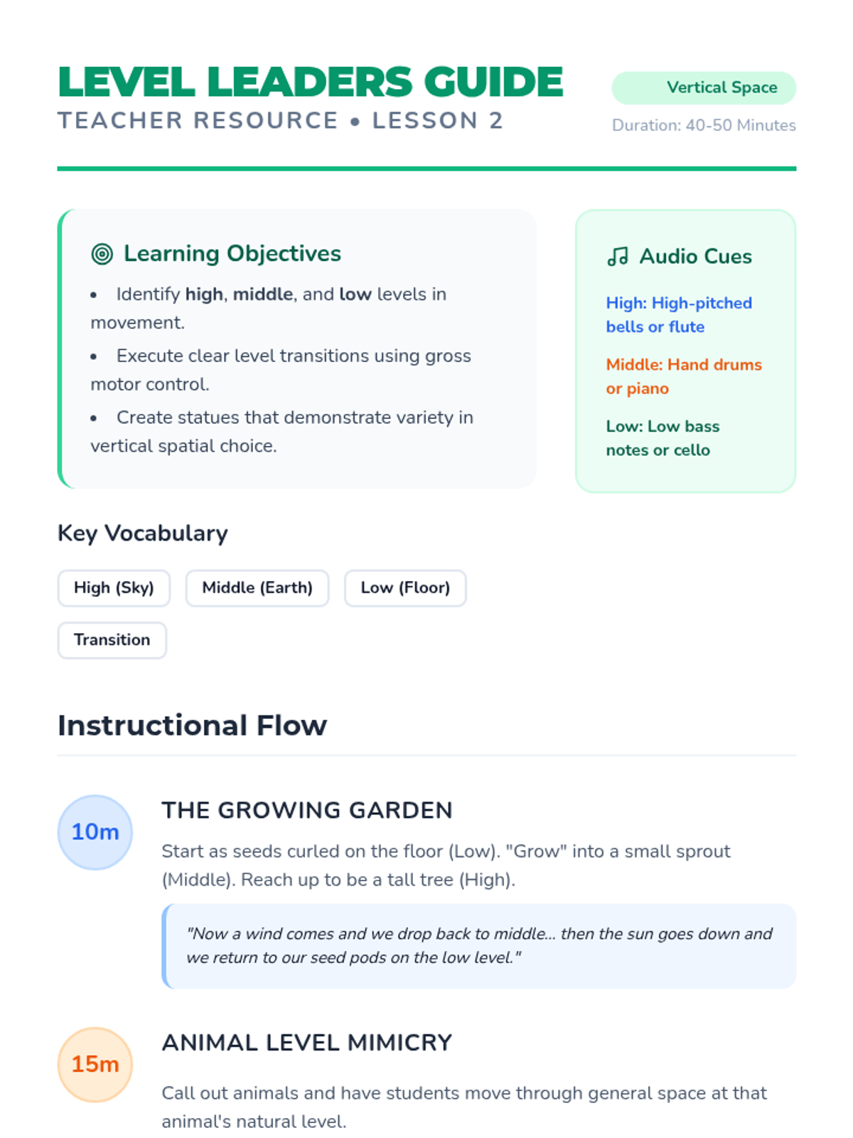A foundational dance sequence for 1st graders focusing on spatial awareness (personal vs. general space), levels (high, middle, low), pathways, and basic locomotor movements like galloping and chassé.