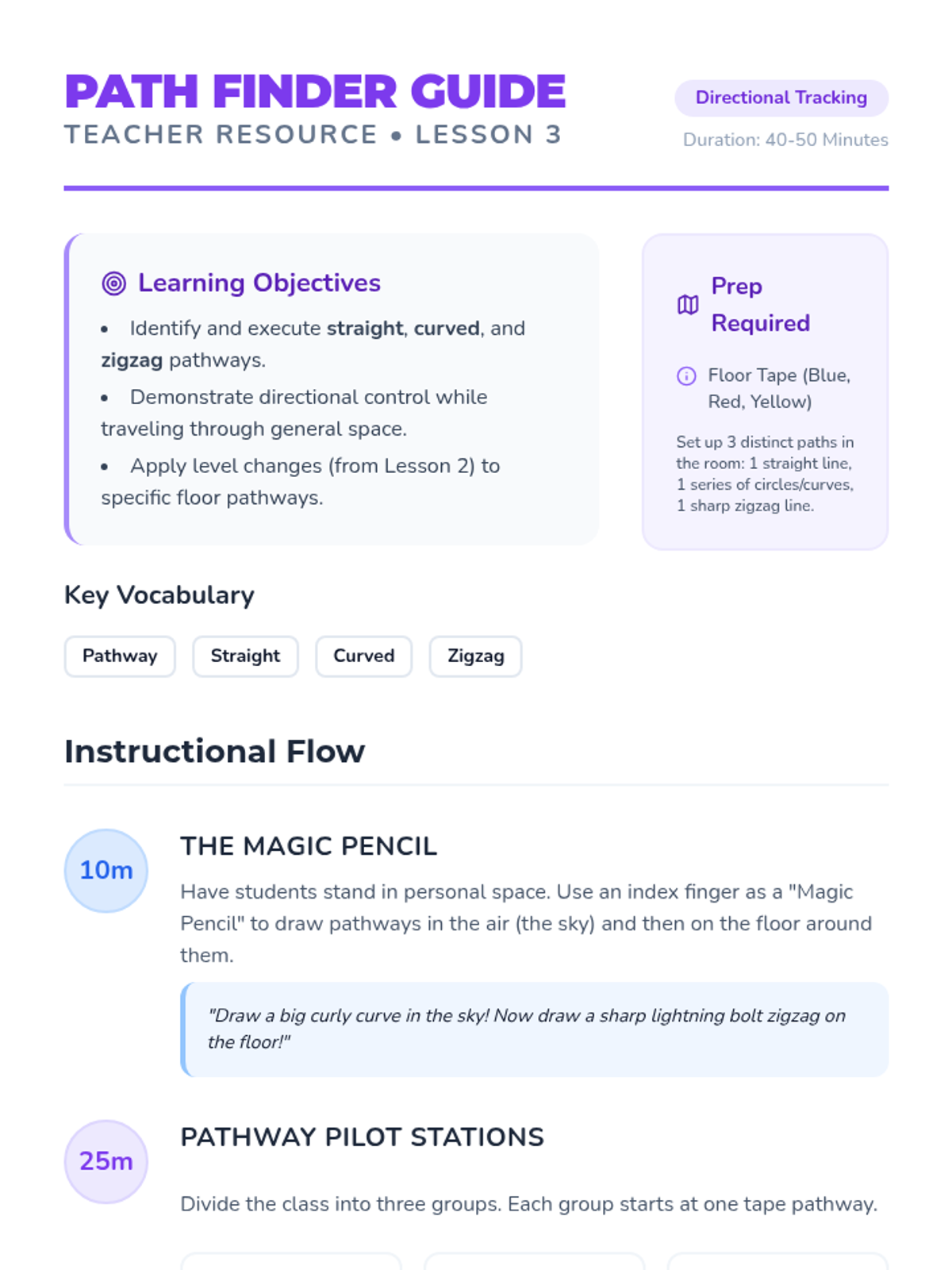 An adventure-themed physical education sequence for 1st graders focused on group problem-solving. Students roleplay as explorers navigating environmental hazards like shrinking islands and lava rivers to build collaboration and strategic thinking skills.