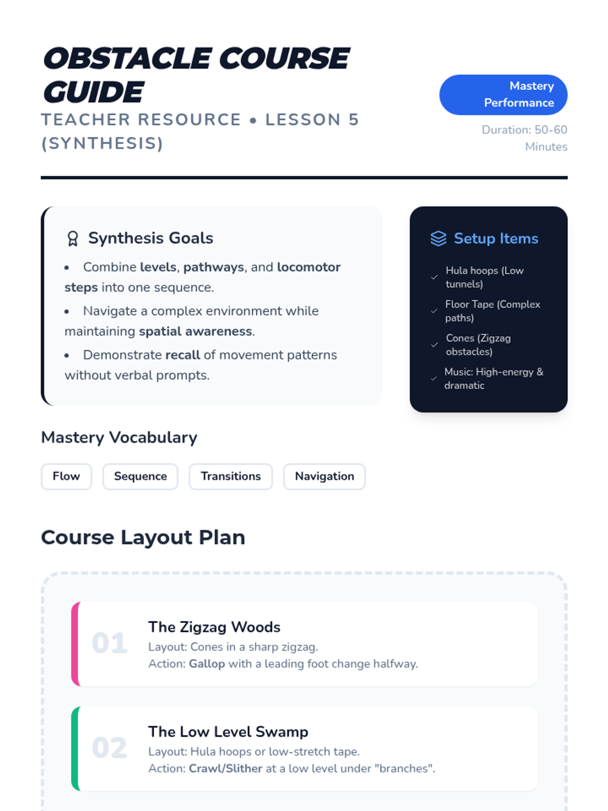 This sequence introduces first-grade students to active listening and clear communication in physical activities. Students progress from non-verbal cues to partner-based verbal guiding, culminating in collaborative group problem-solving challenges that rely on effective communication.