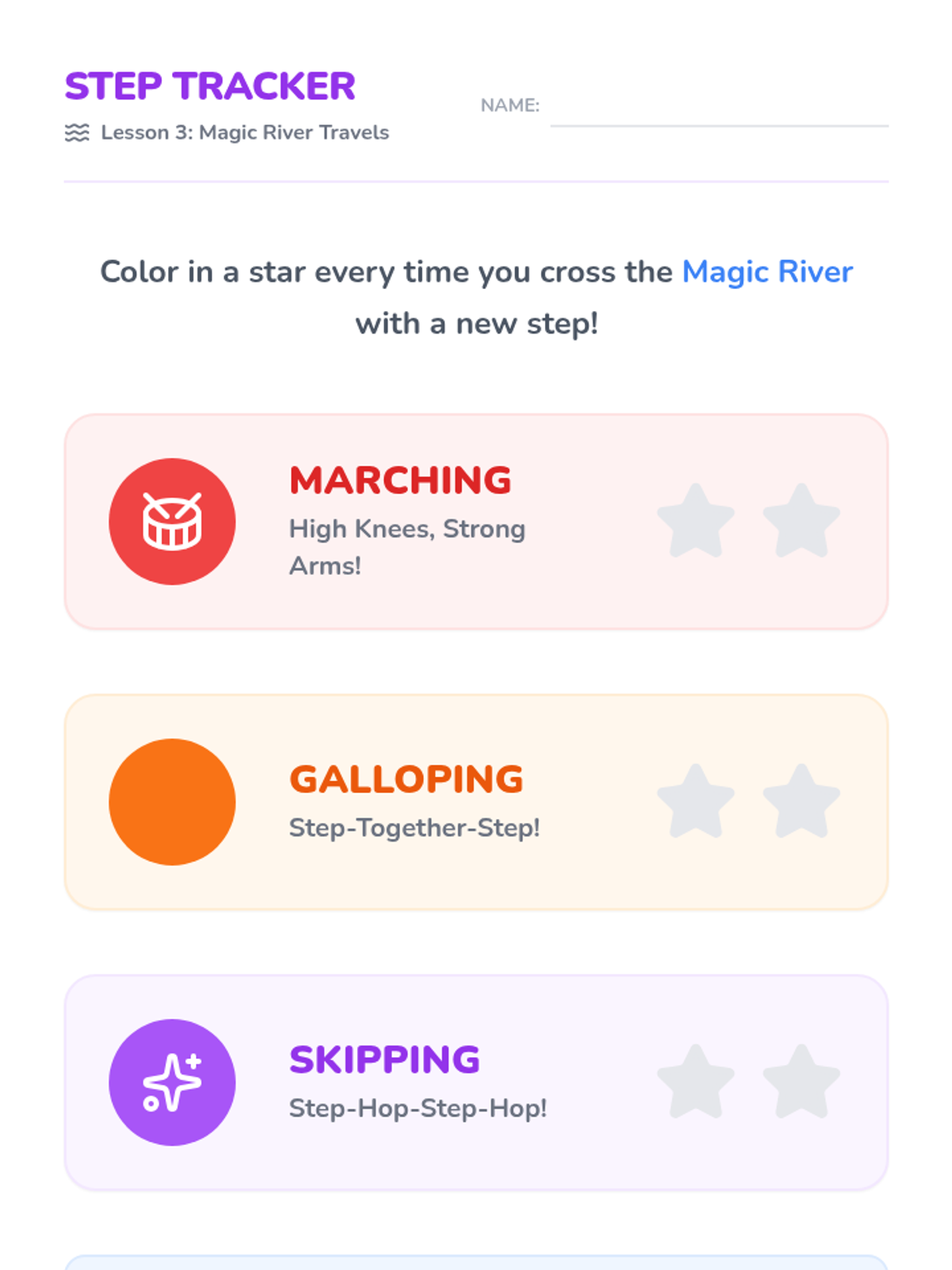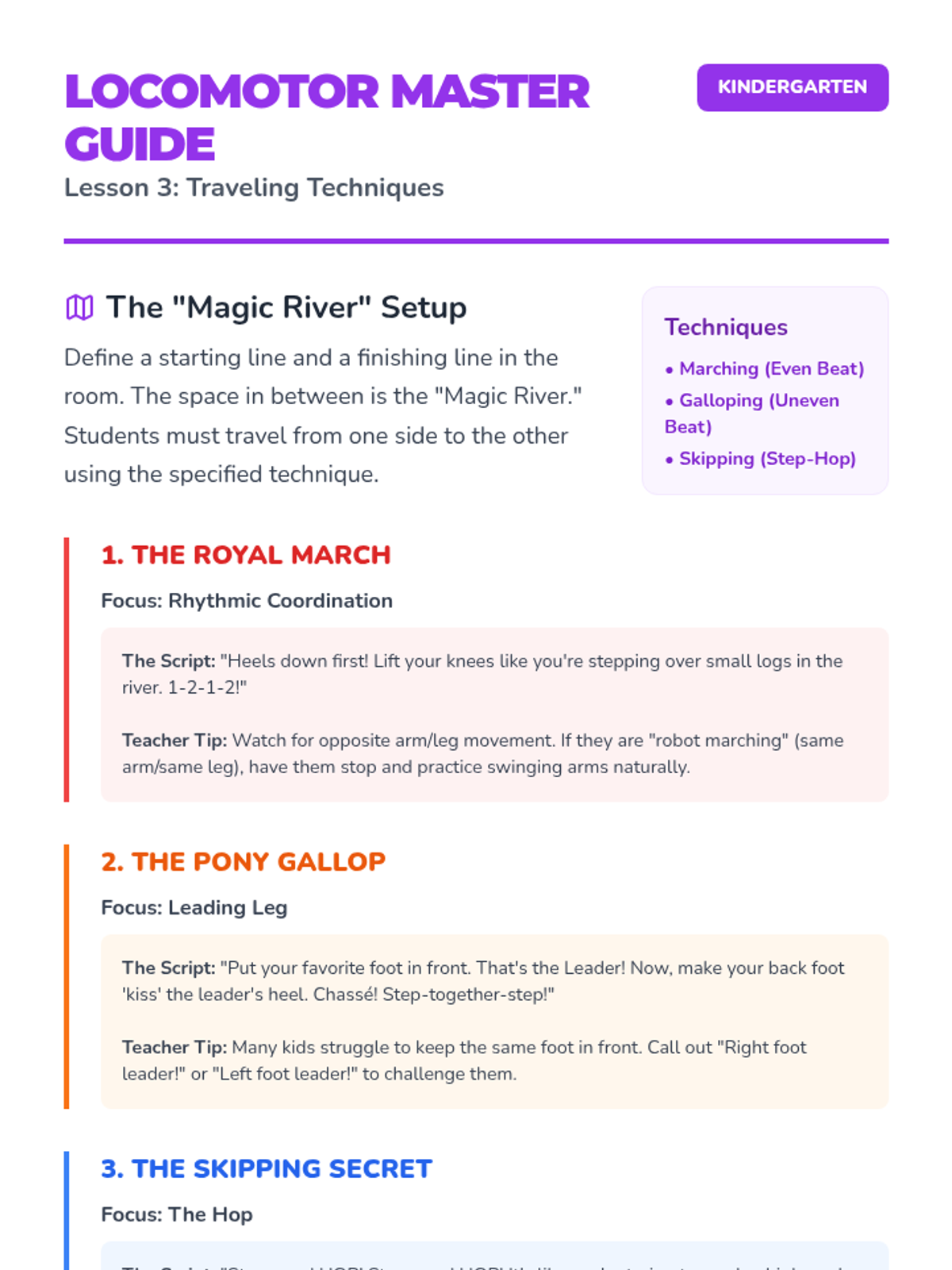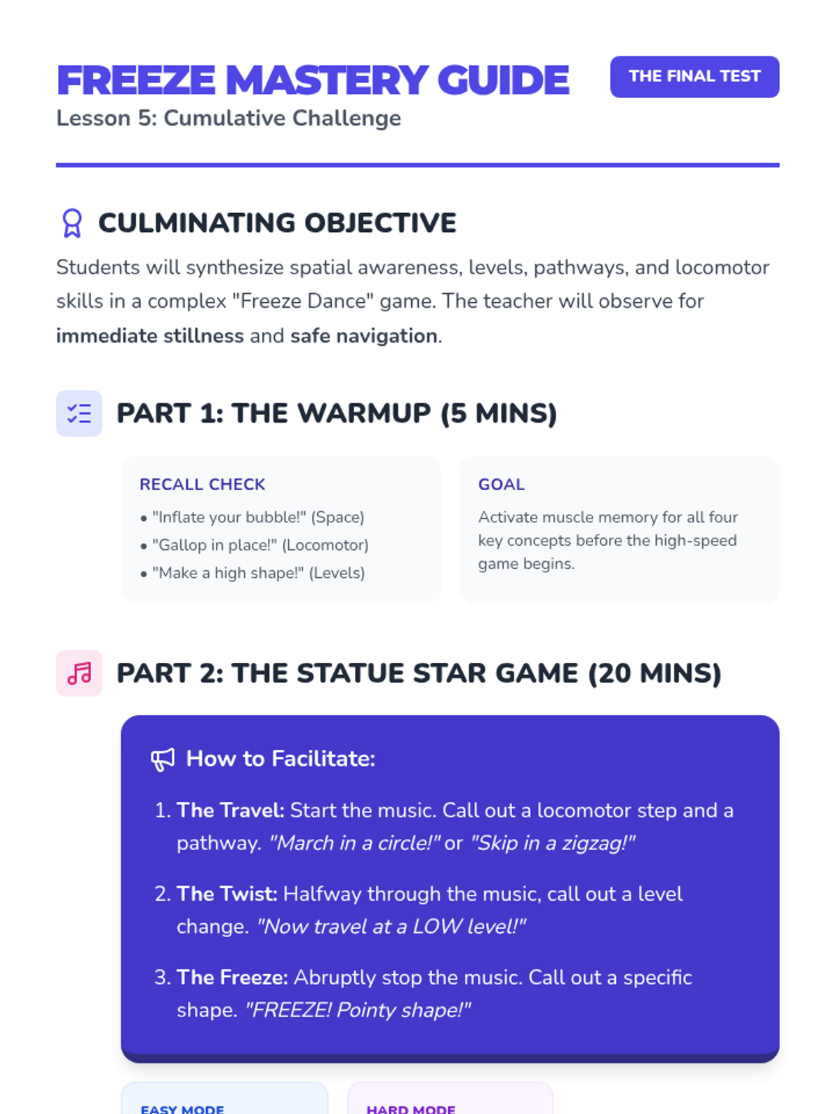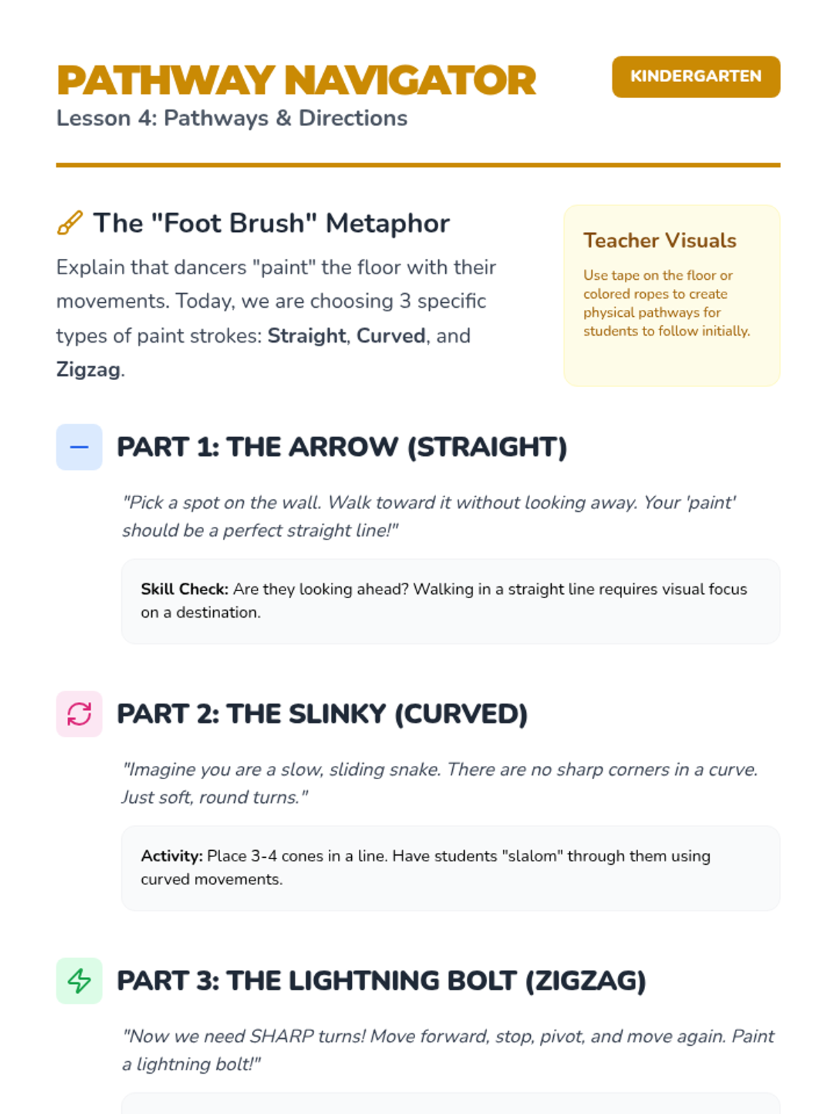 A foundational dance sequence for Kindergarteners focusing on personal space (kinesphere), levels, pathways, and locomotor movements like skipping and galloping. Students learn to move safely and creatively while developing body control and balance.