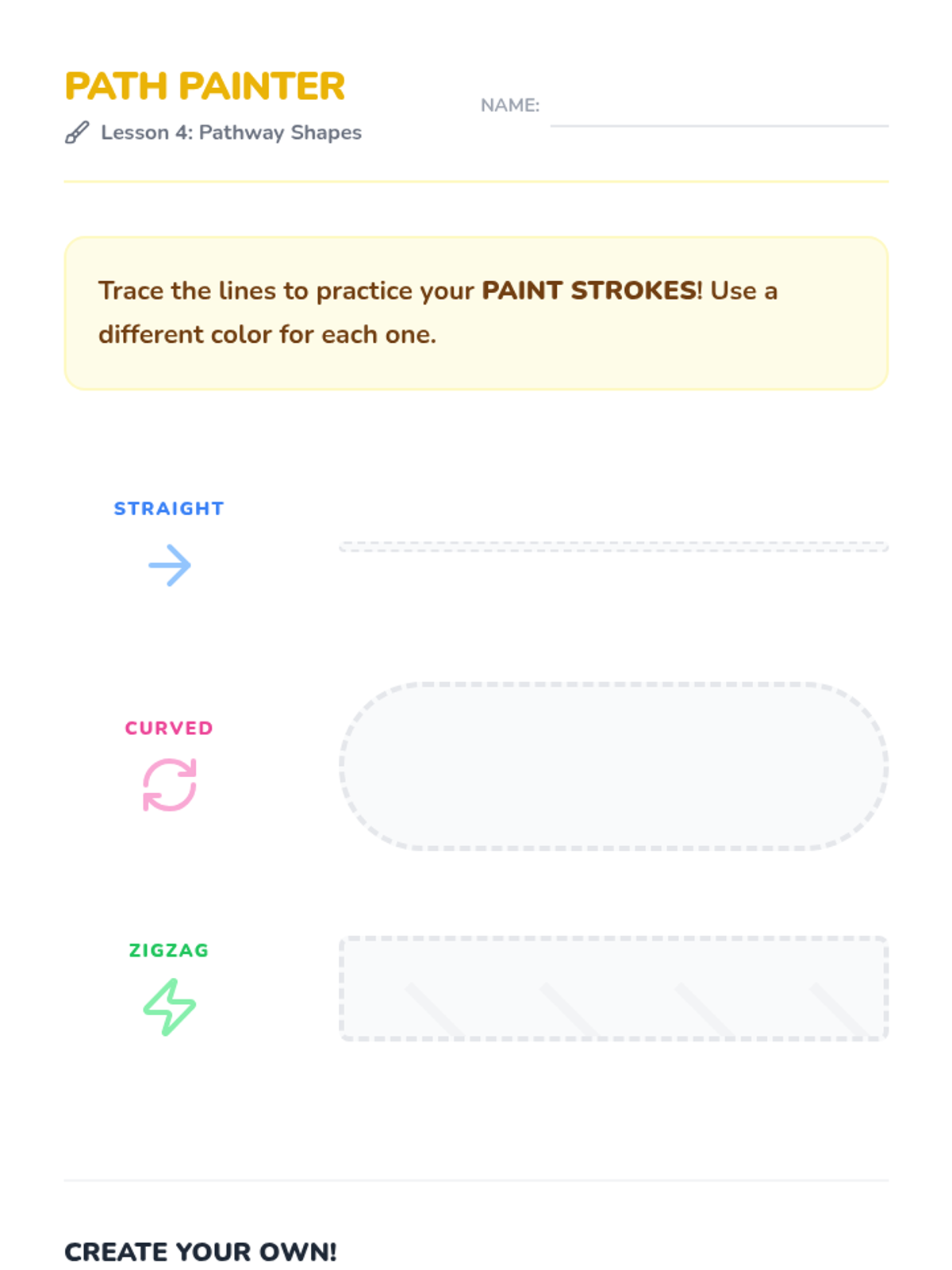 A Kindergarten sequence introducing stenciling, typography, and graphic layout. Students progress from basic negative space concepts to designing their own posters by combining text and images.