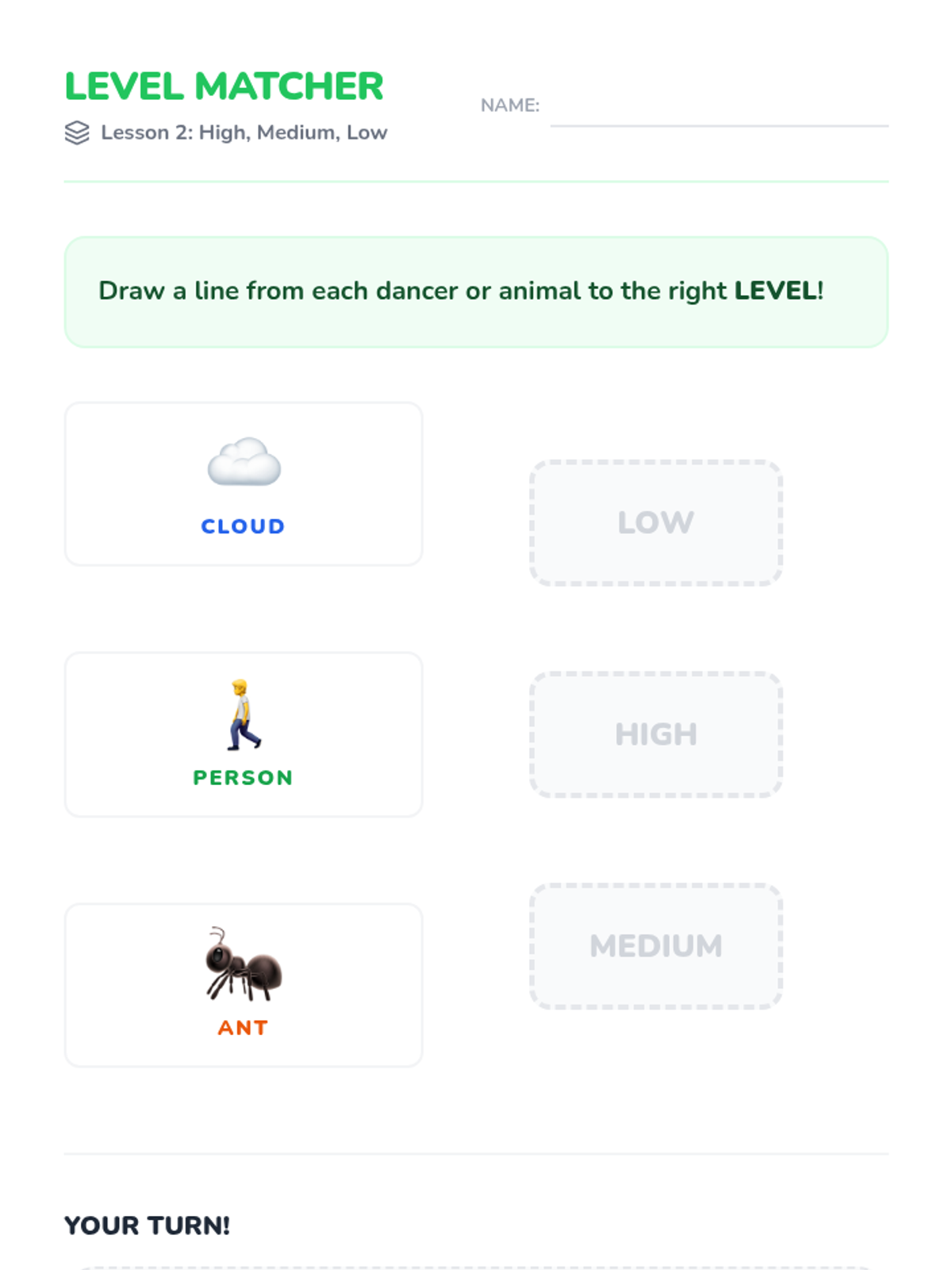 A foundational music sequence for Pre-K students exploring pitch discrimination, melodic contour, and the transition from sound to symbolic graphic notation. Through kinesthetic movement, vocal play, and creative drawing, students learn to visualize and perform high and low sounds.