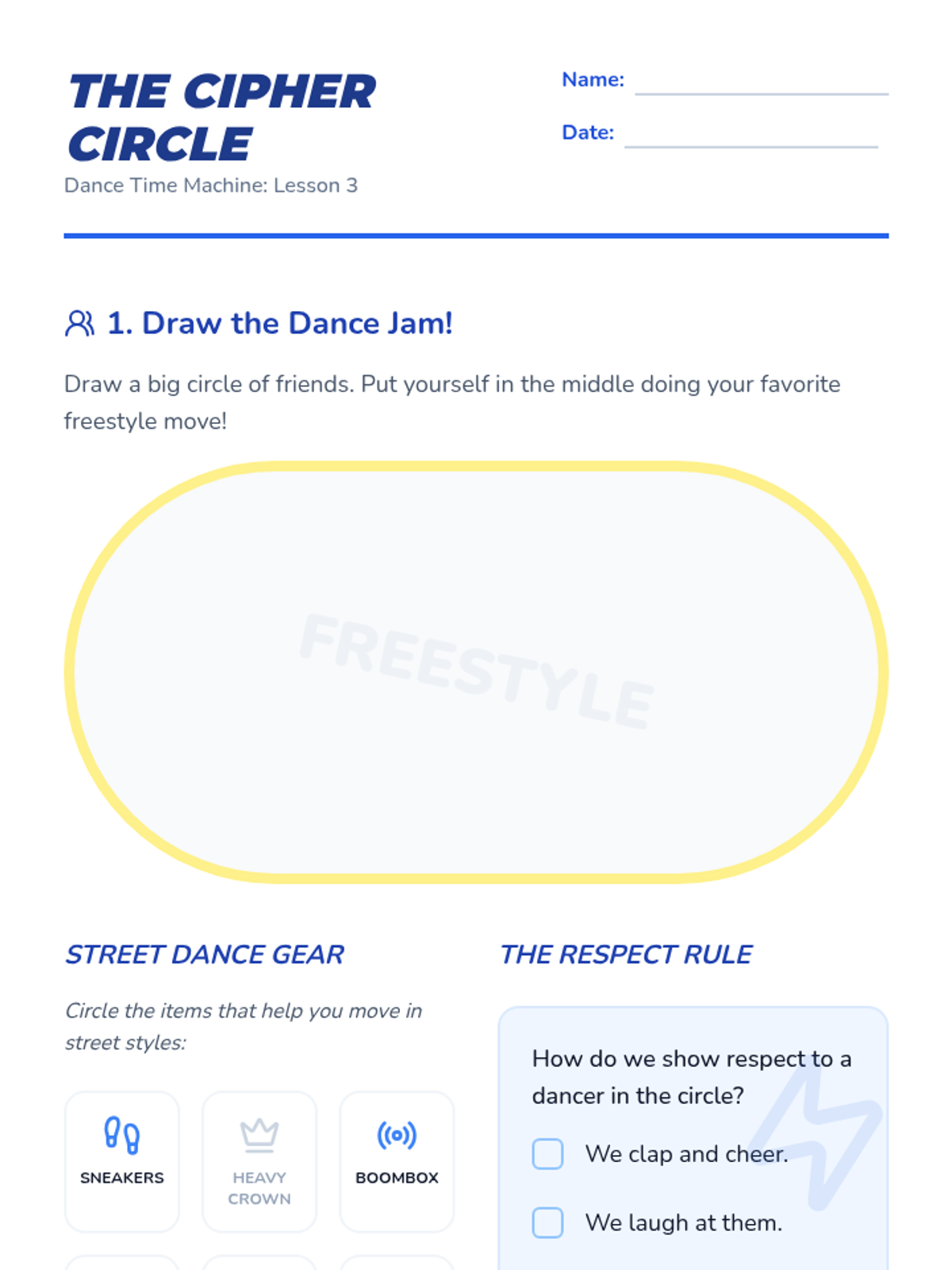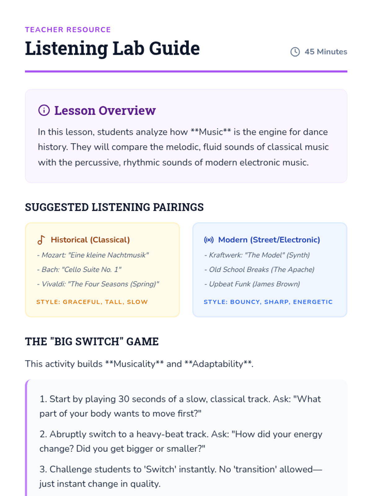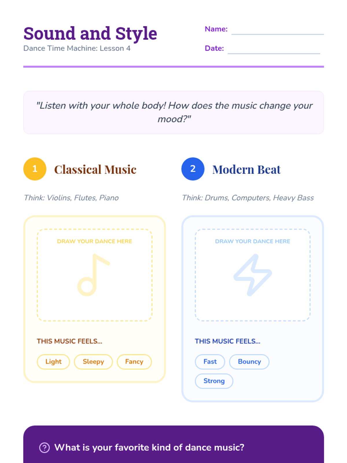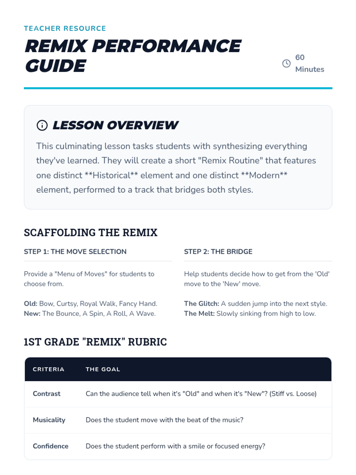 A comparative dance sequence for 1st graders exploring the evolution of movement from formal court dances to modern street styles. Students investigate how clothing, music, and social rules shape the way we move across different historical eras.