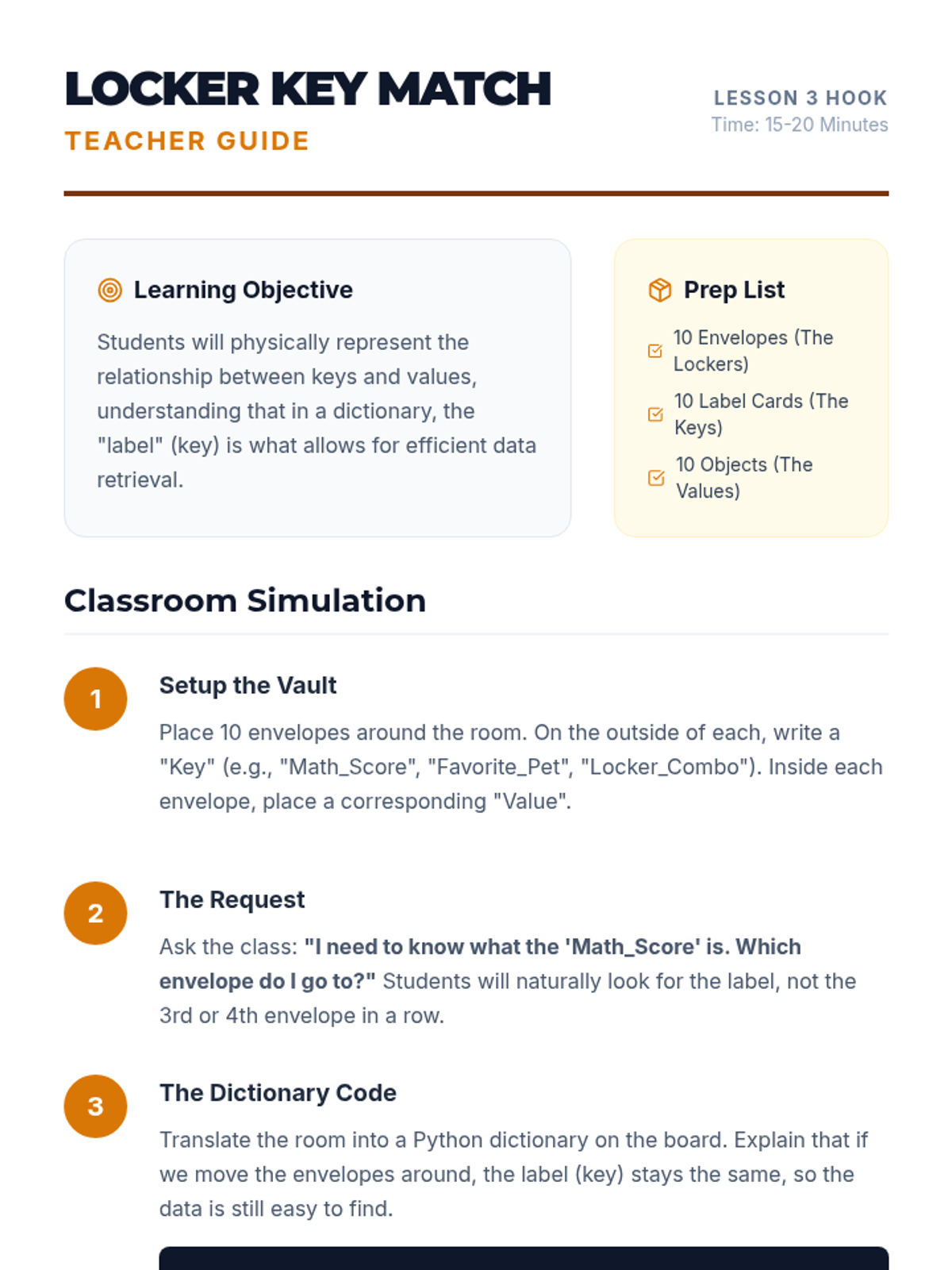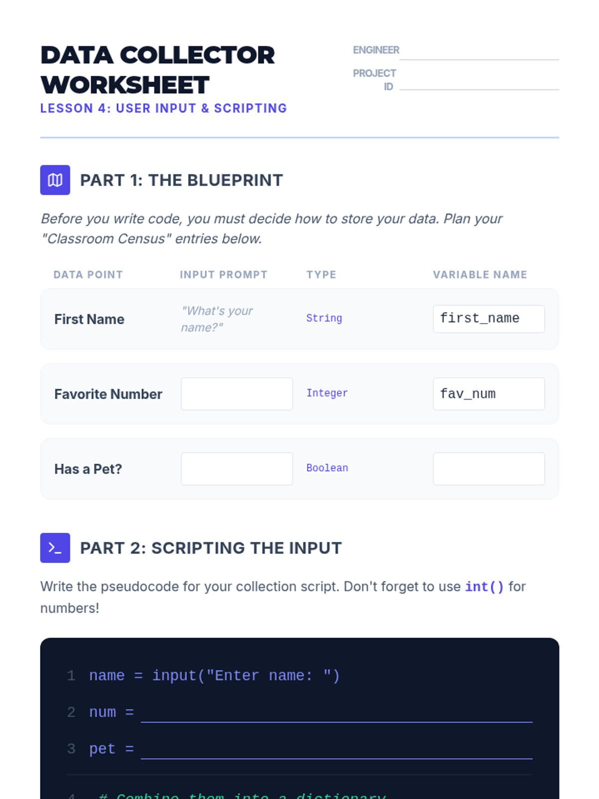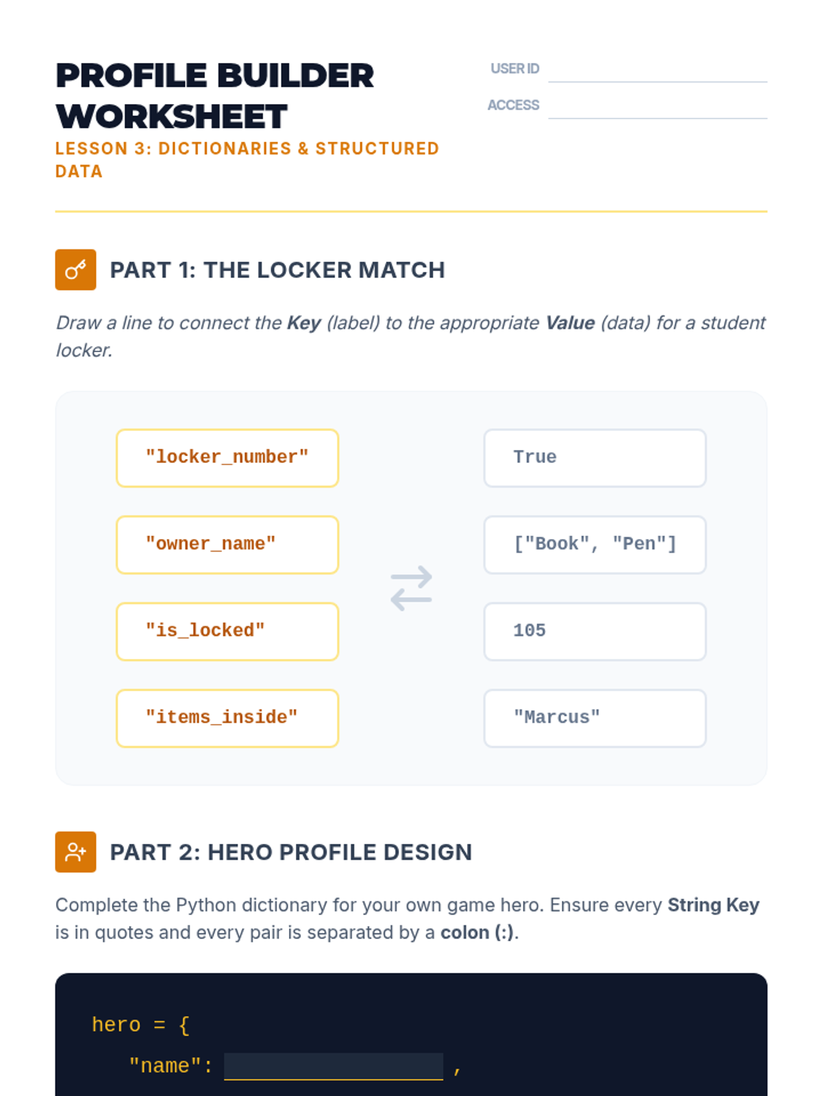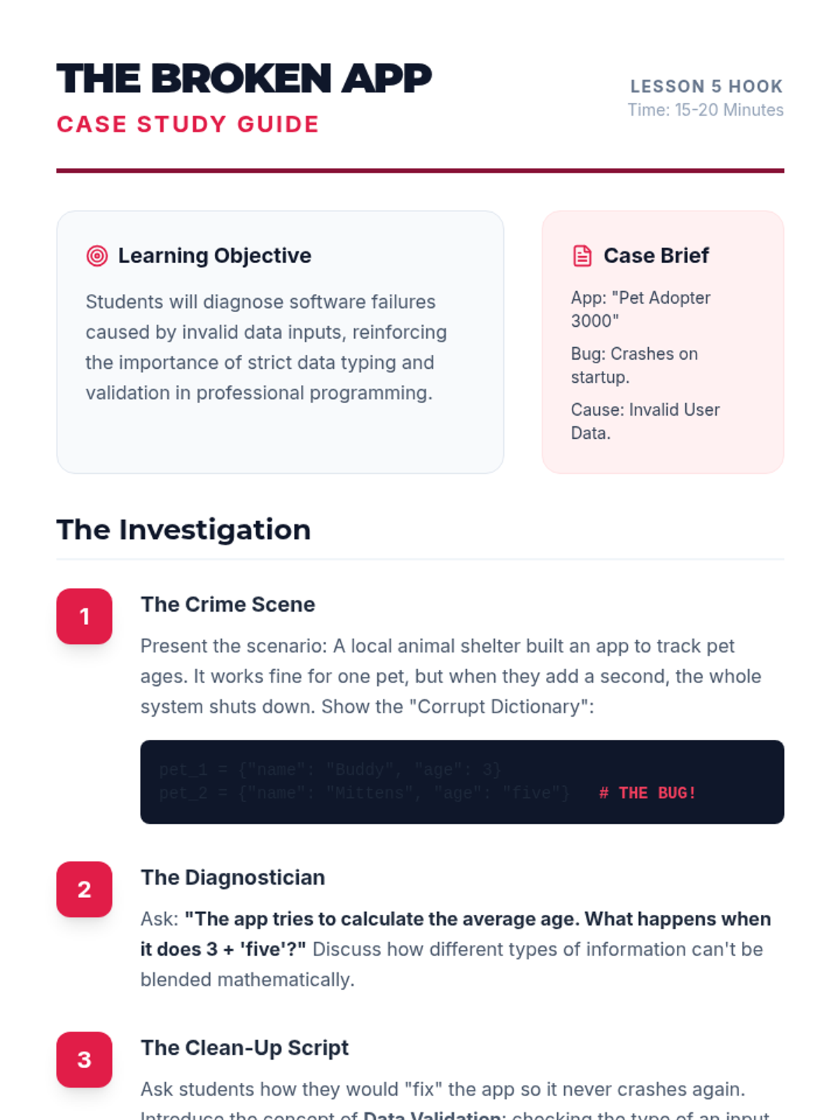 An introductory sequence for 6th-grade students on computer science data structures. Students explore data types, lists, dictionaries, user input, and data validation through inquiry-based activities and skill-building exercises.
