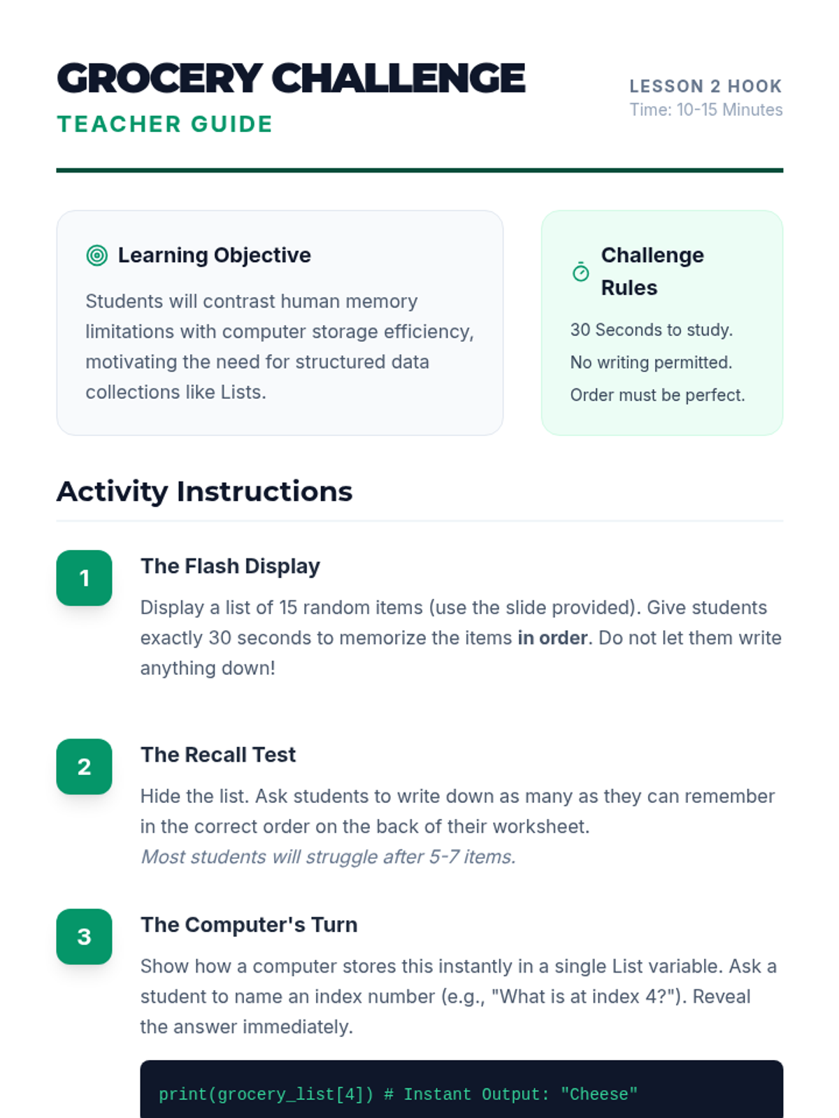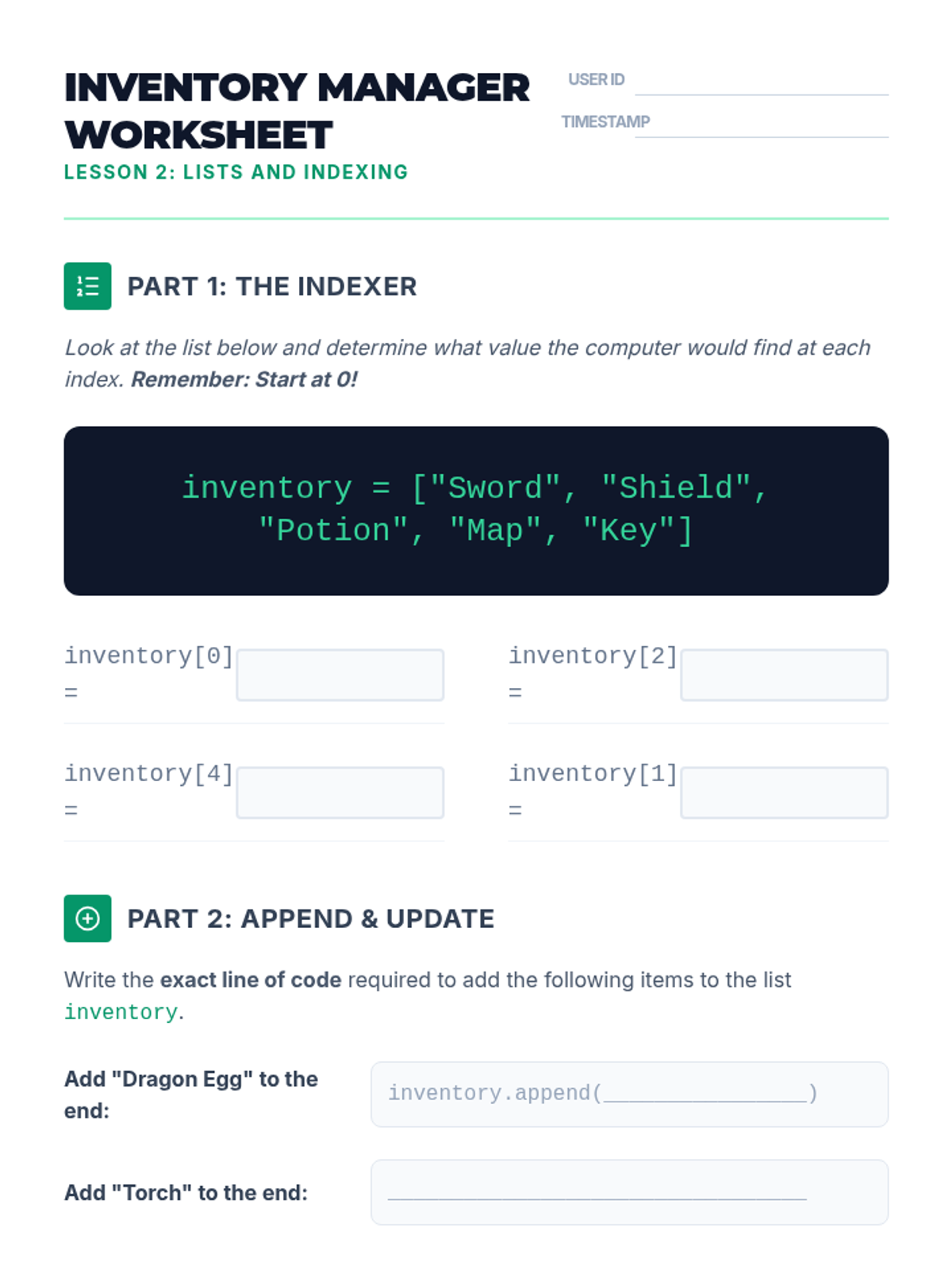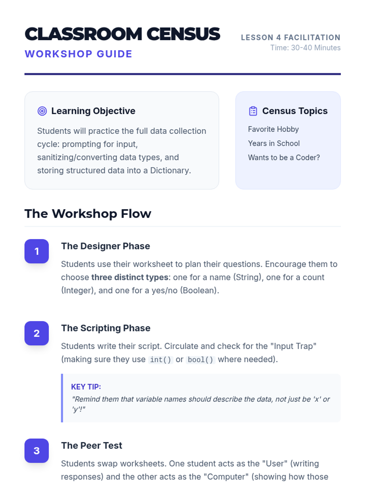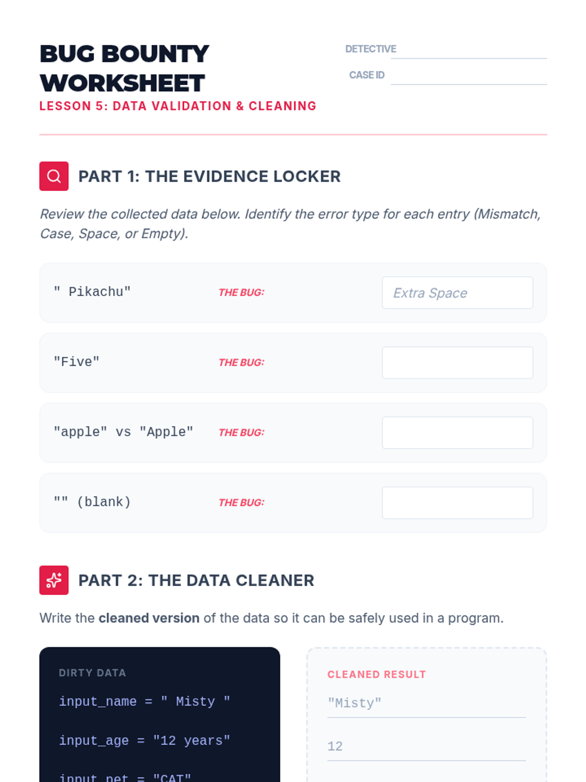 An introductory sequence for 6th-grade students on computer science data structures. Students explore data types, lists, dictionaries, user input, and data validation through inquiry-based activities and skill-building exercises.