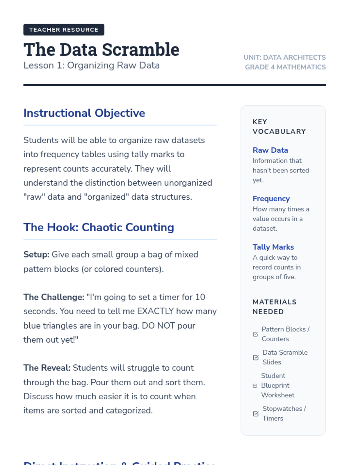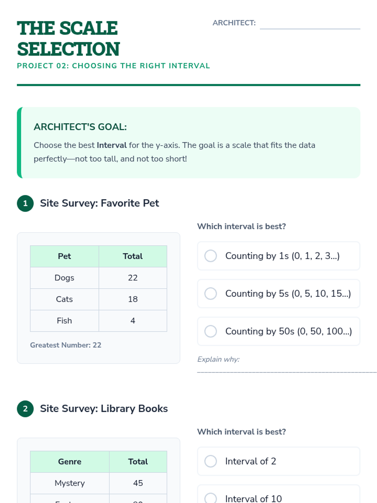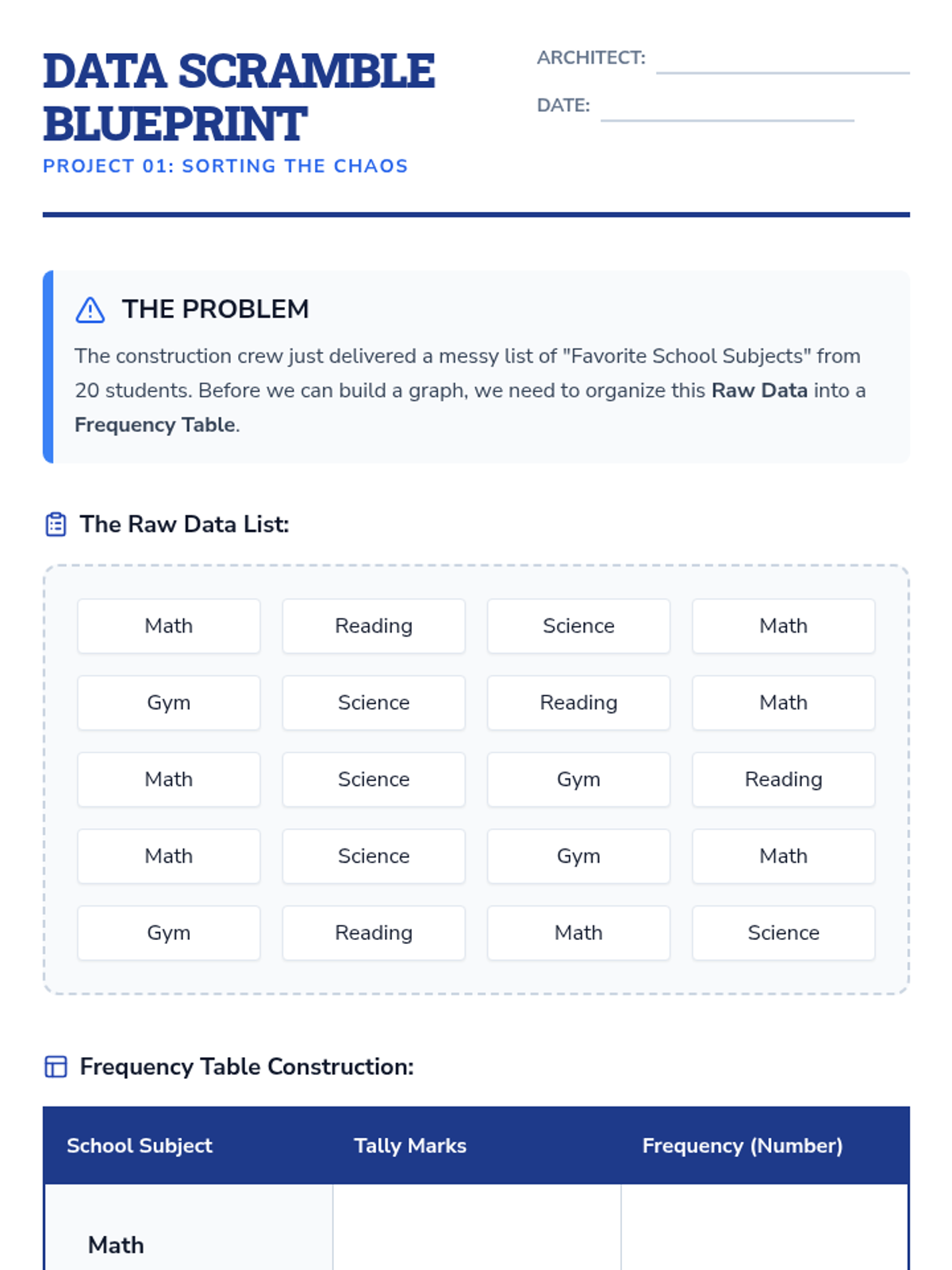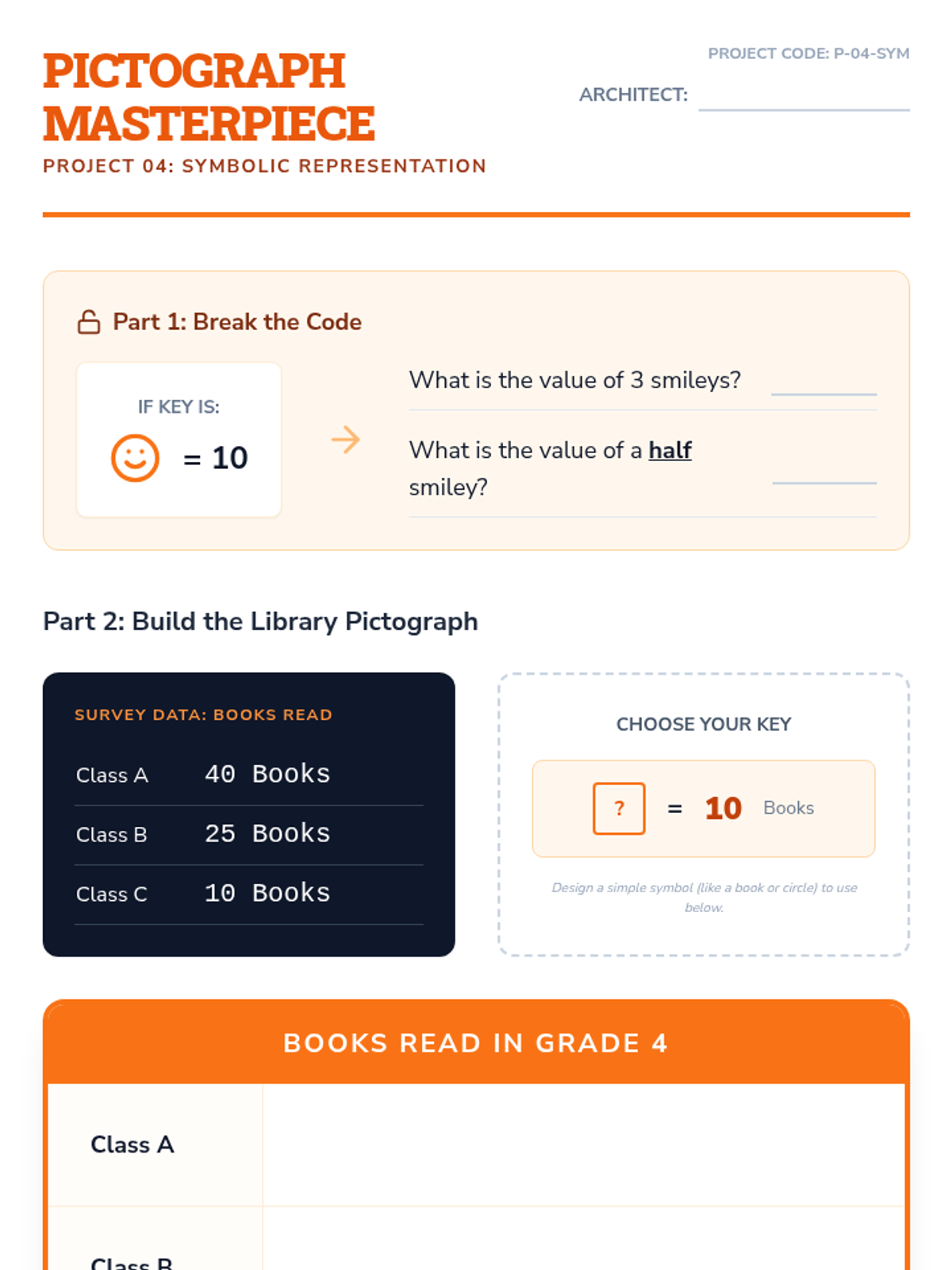 A comprehensive 4th Grade unit on organizing data, selecting scales, and constructing bar graphs and pictographs. Students transform into 'Data Architects,' learning to build visual structures from raw numbers.
