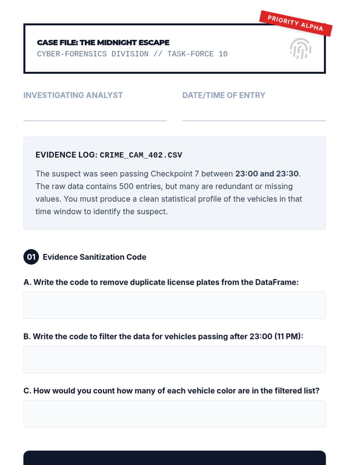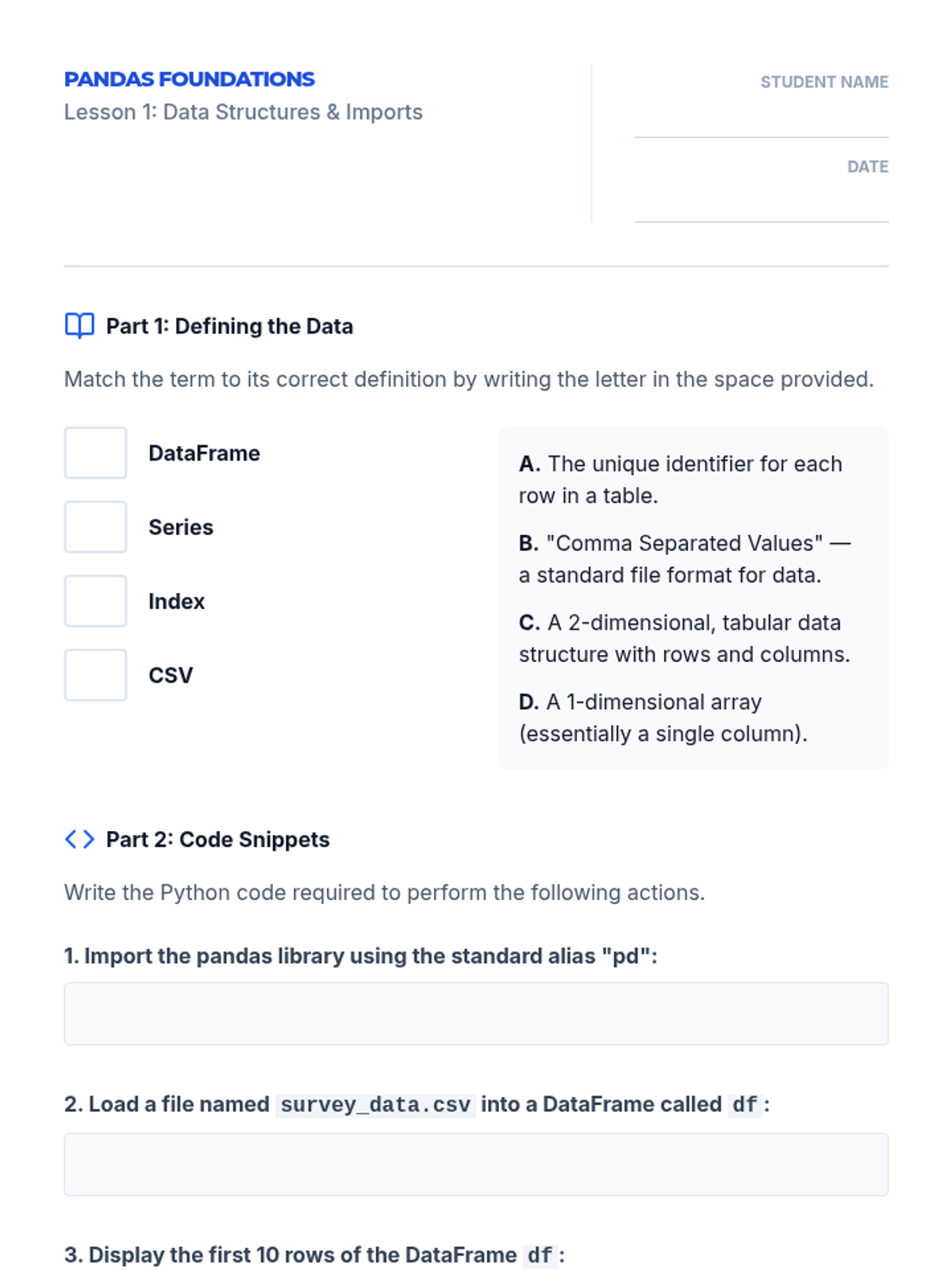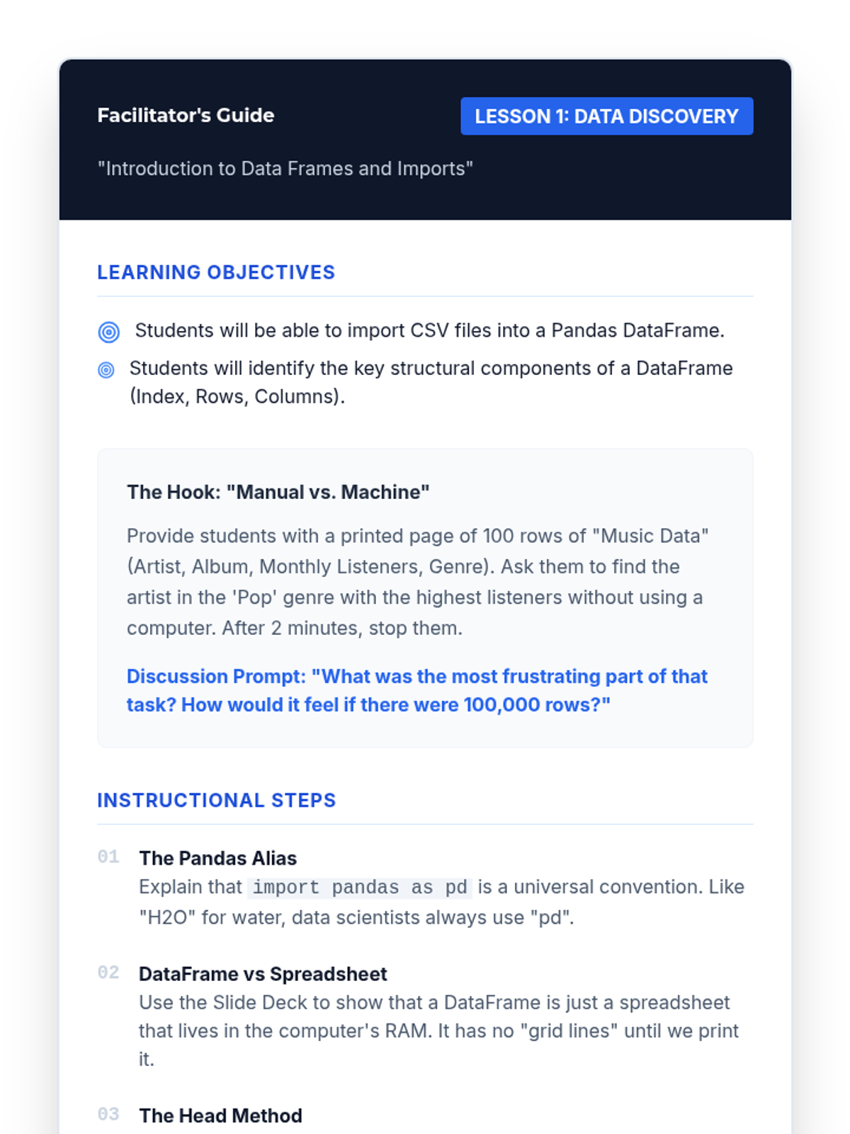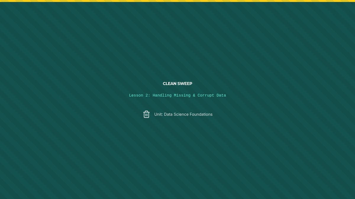 A comprehensive 10th-grade Computer Science sequence focused on data lifecycle management, from raw importation and cleaning to statistical summarization using Python/Pandas. Students progress from basic data frame navigation to solving complex 'data detective' scenarios by rectifying missing, corrupt, and inconsistent data.