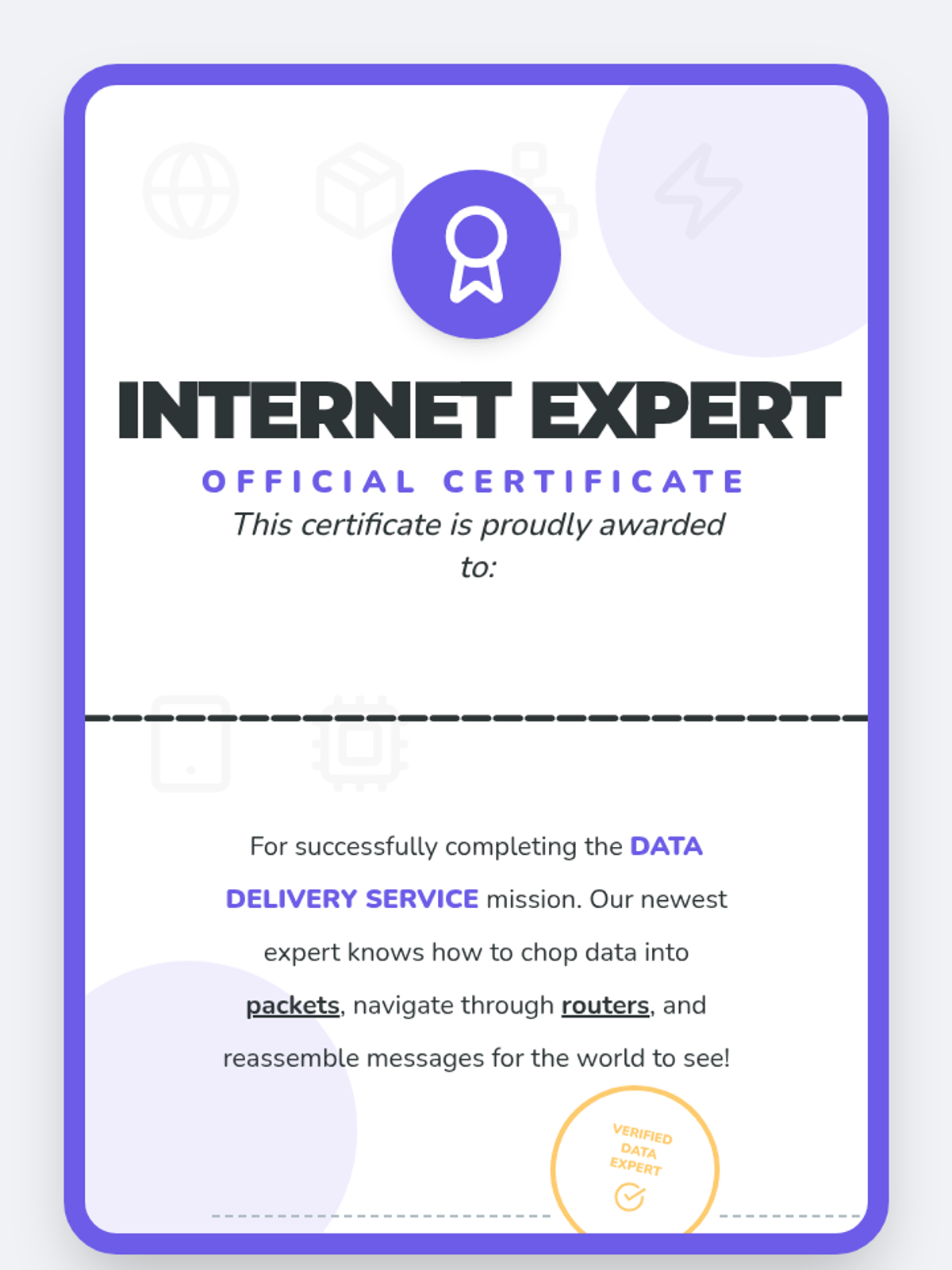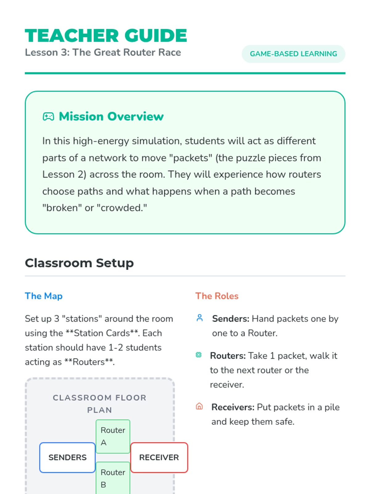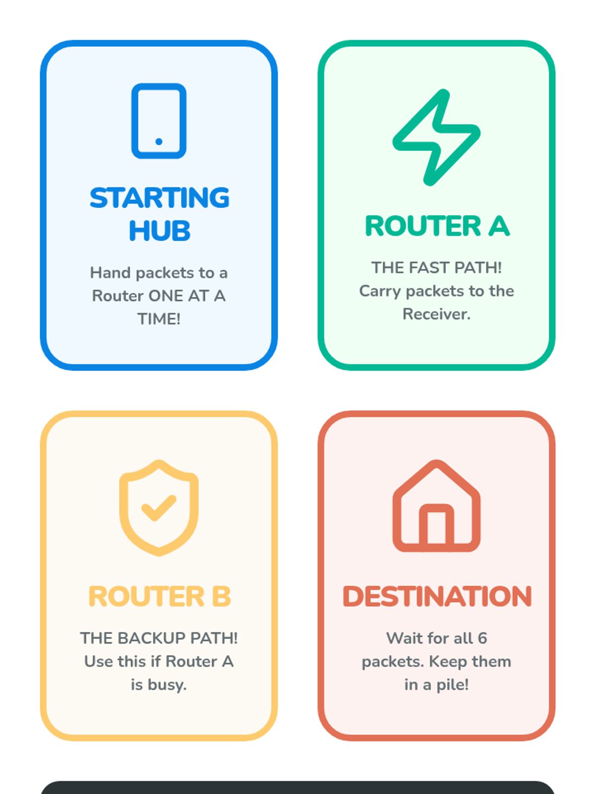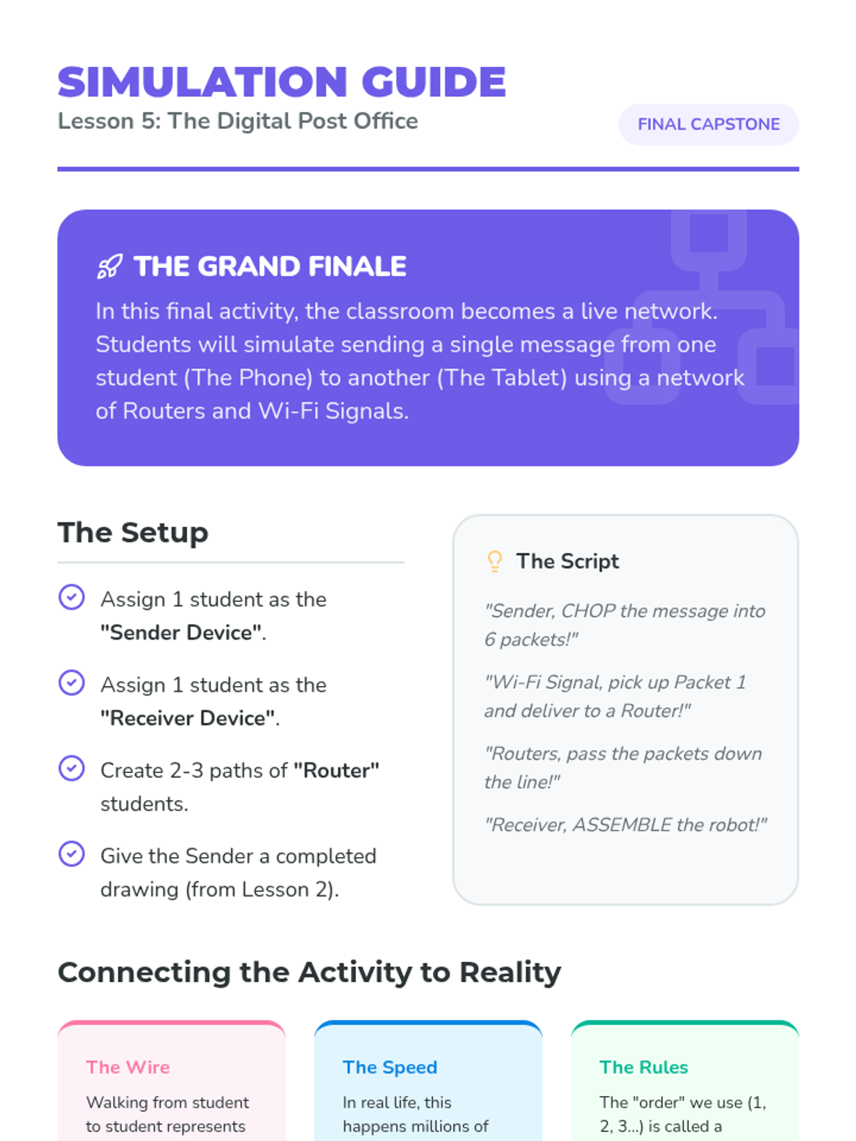 A 5-lesson unit where 1st graders explore how data travels across the internet using the 'Data Delivery Service' model. Students learn about breaking messages into packets, routing them through different paths, and reassembling them at the destination through physical simulations and games.