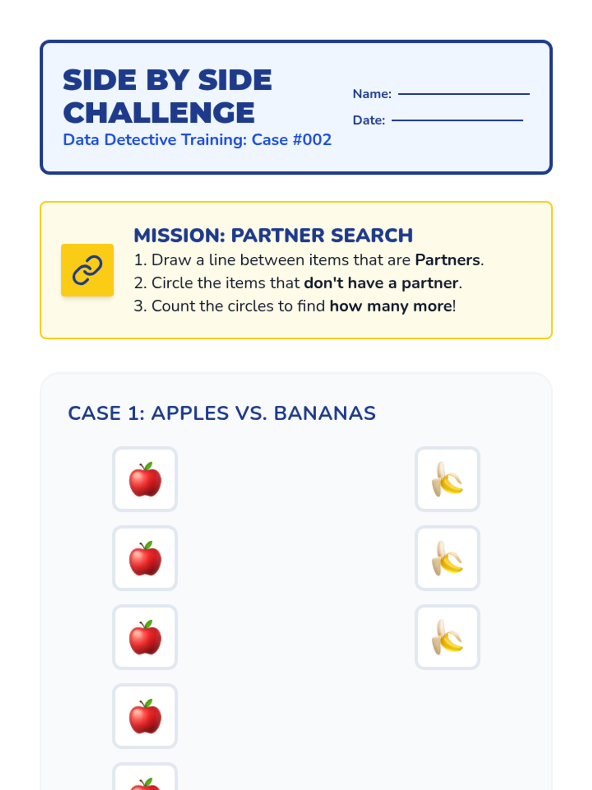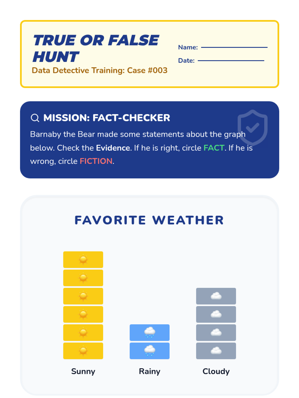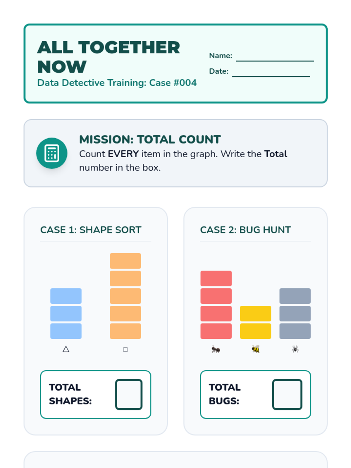 A Kindergarten sequence focused on the analytical side of data: identifying extremes, comparing categories, and finding totals to solve real-world problems. Students use a detective-themed lens to 'crack the code' of bar graphs and pictographs.