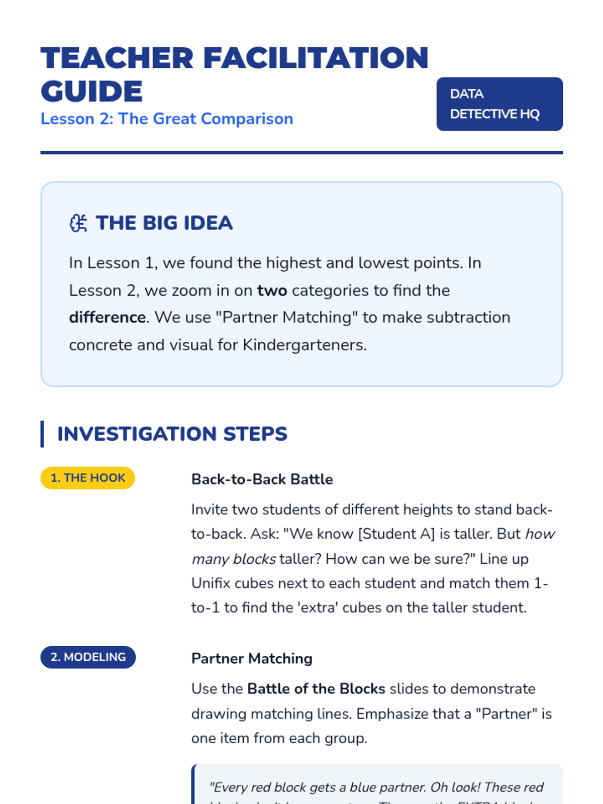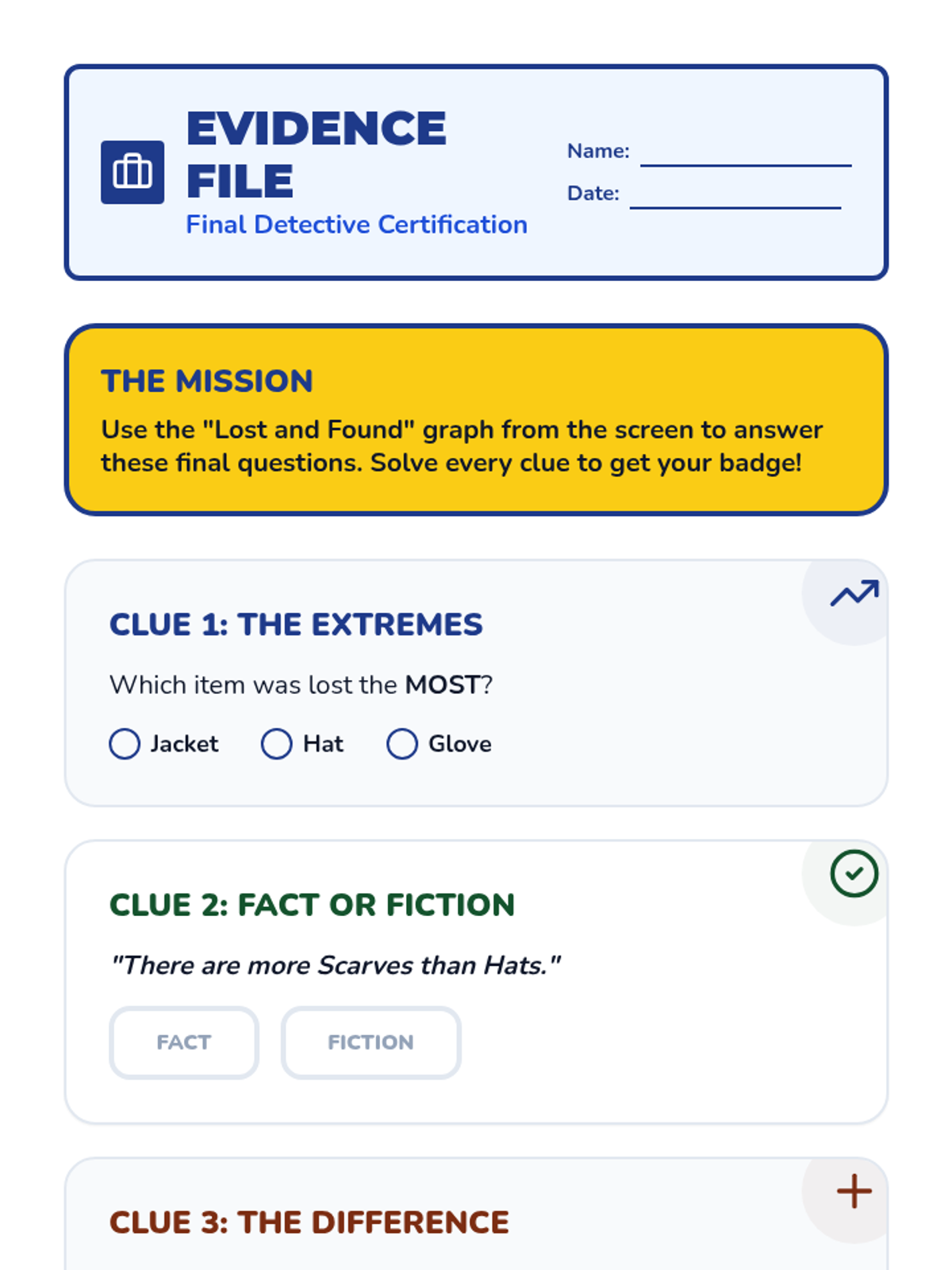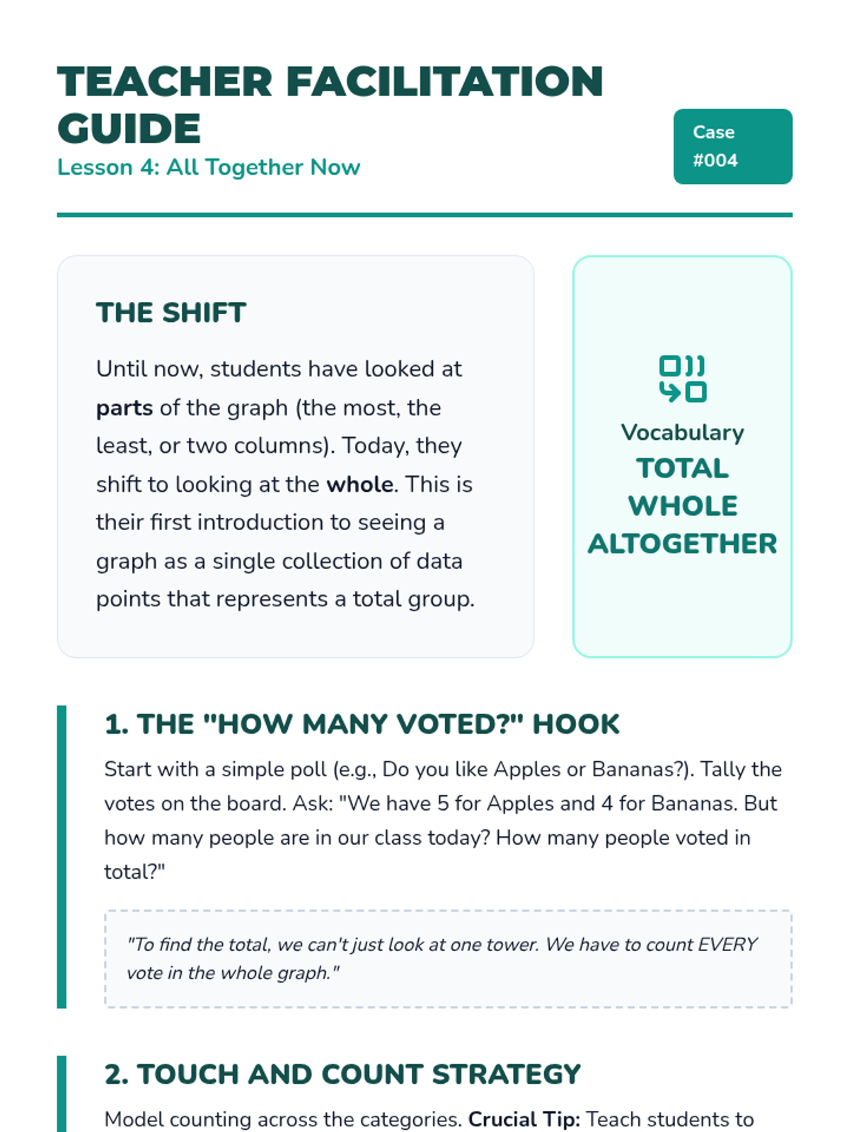 A Kindergarten sequence focused on the analytical side of data: identifying extremes, comparing categories, and finding totals to solve real-world problems. Students use a detective-themed lens to 'crack the code' of bar graphs and pictographs.