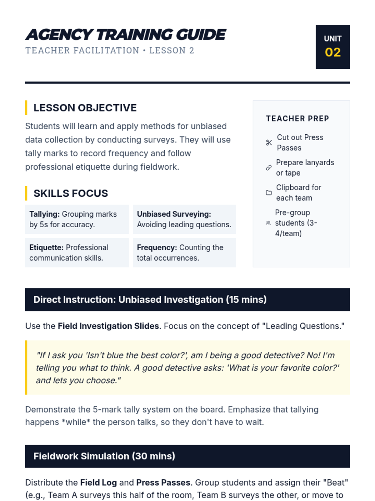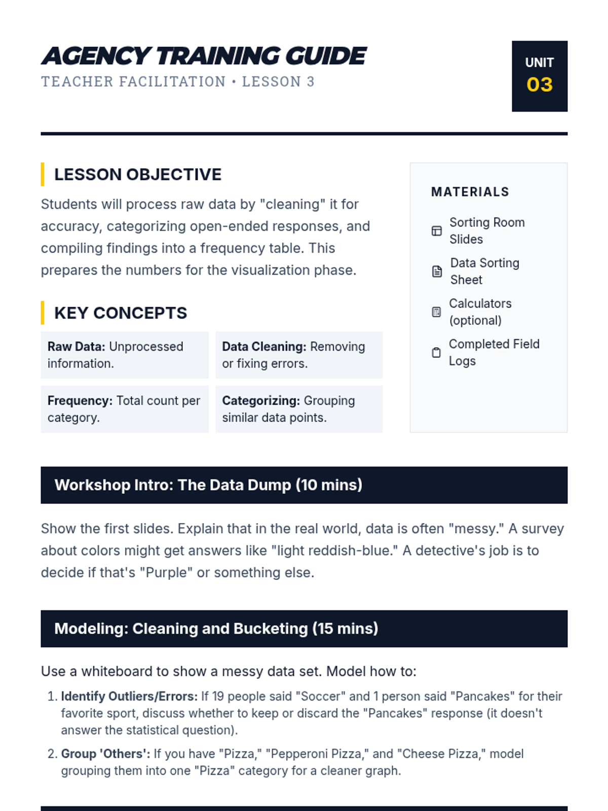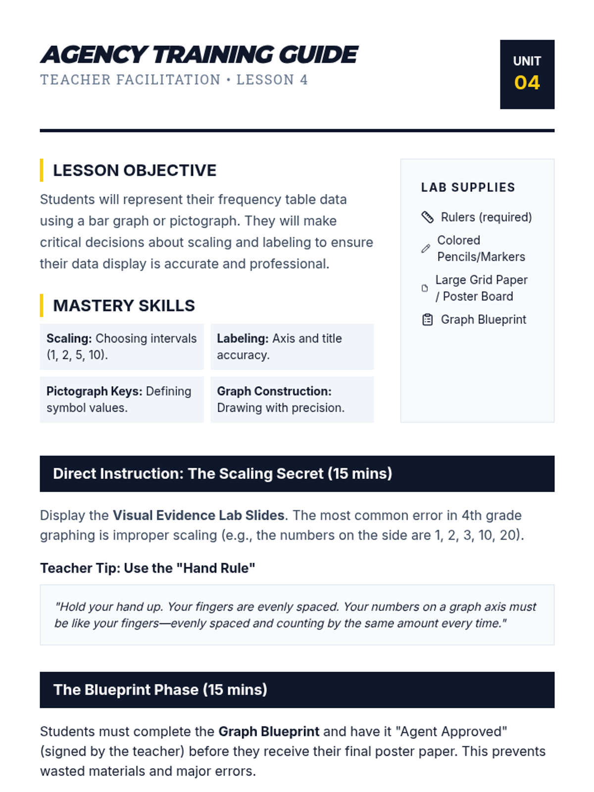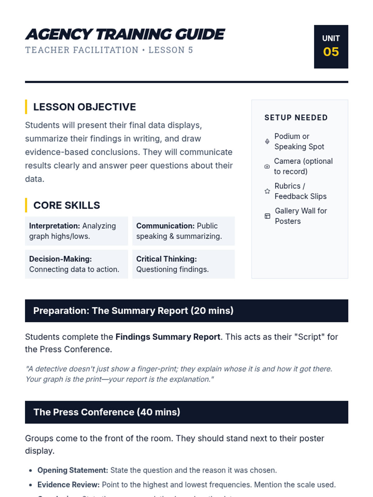 A project-based unit where 4th-grade students act as 'Data Detectives' to formulate questions, collect survey data, and present visual findings to make community decisions.