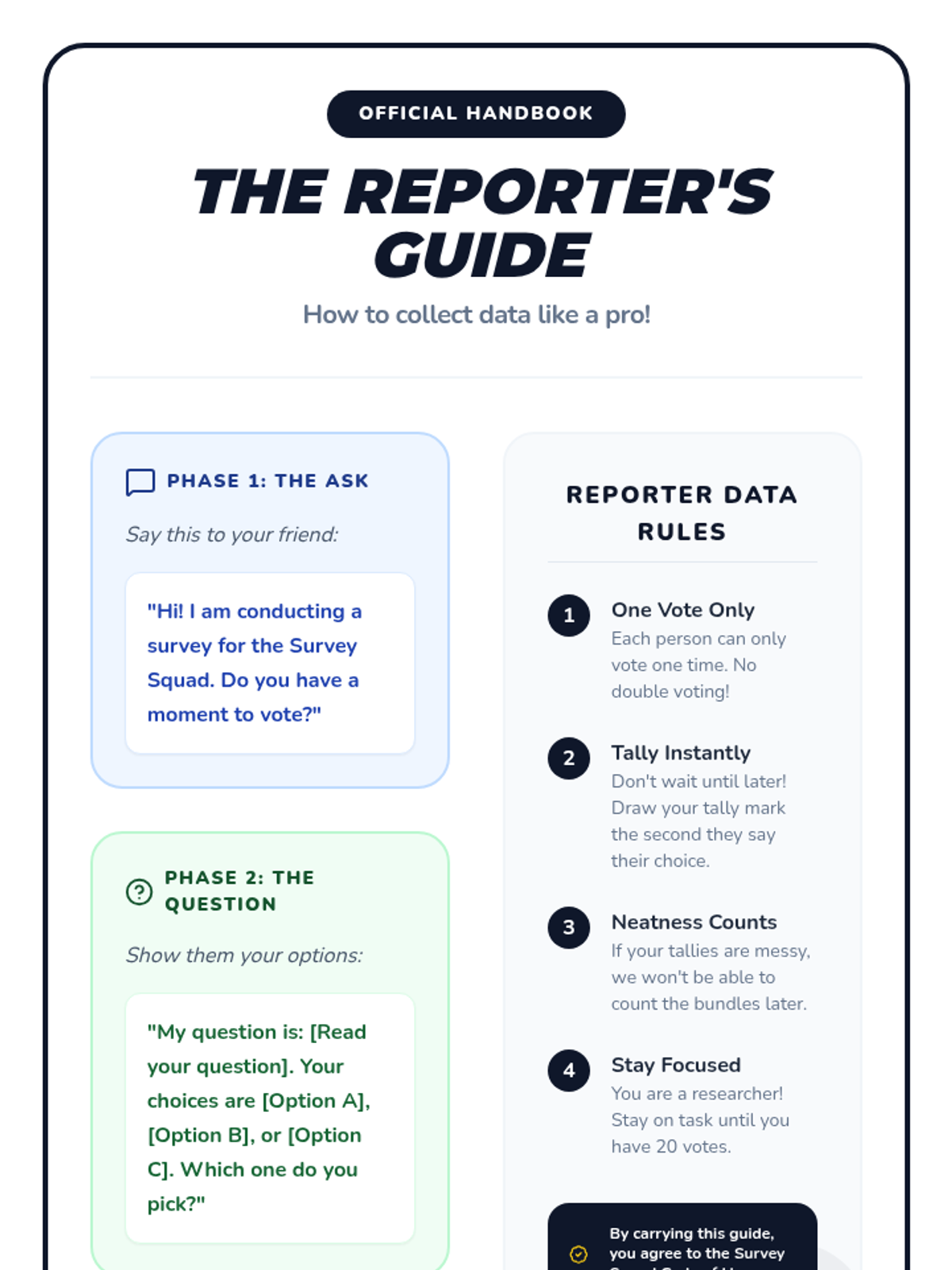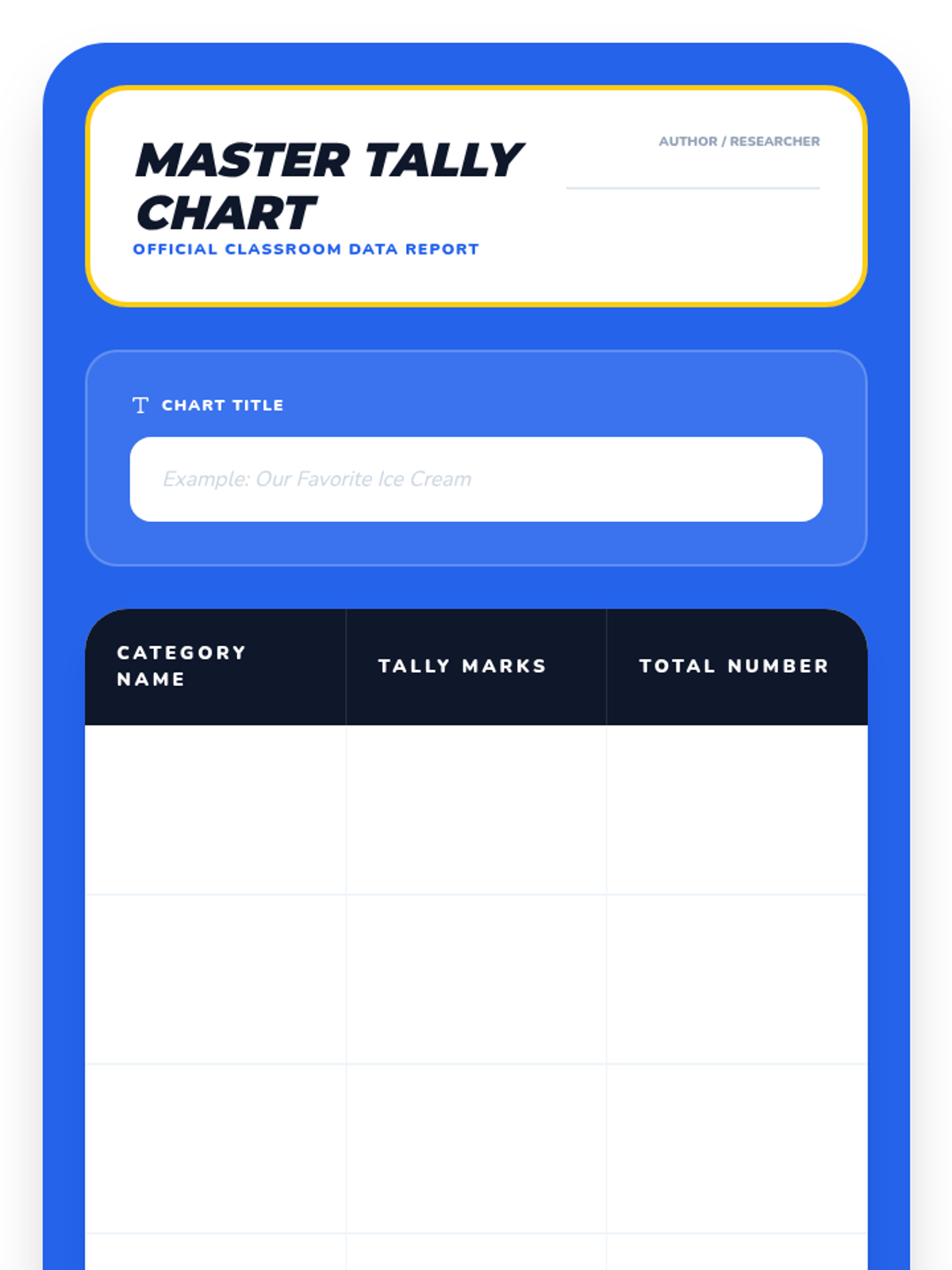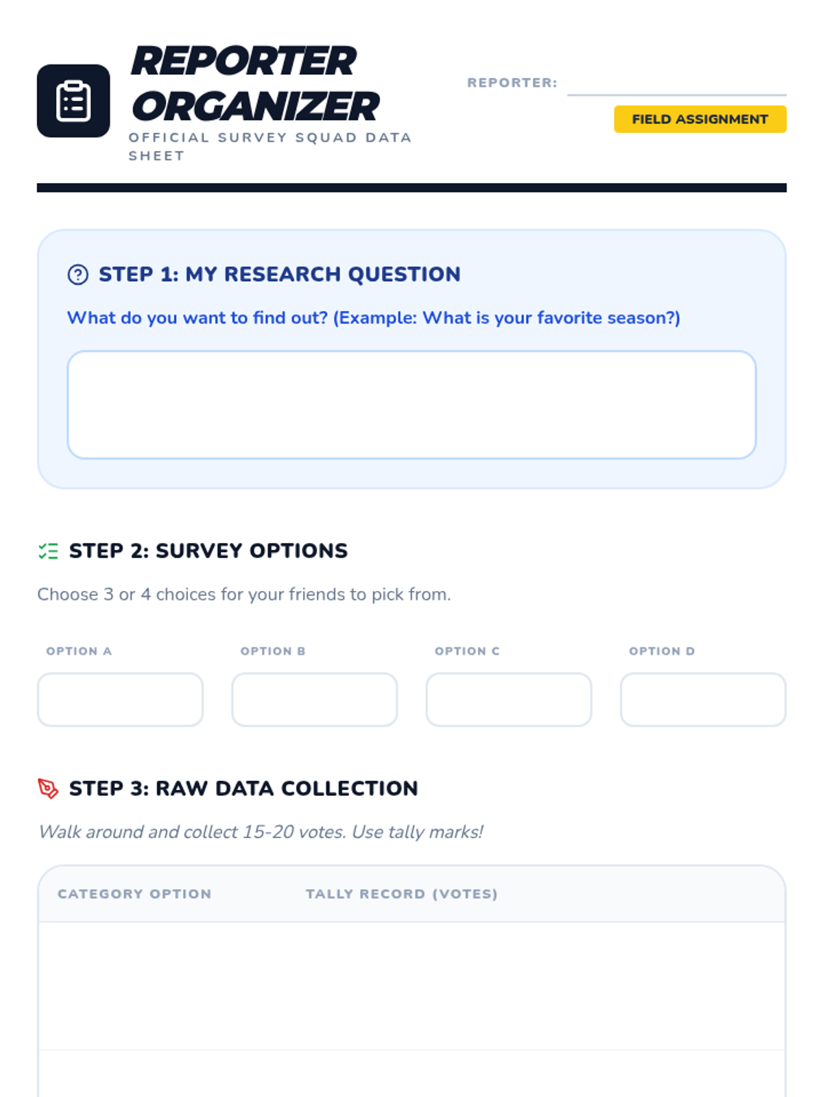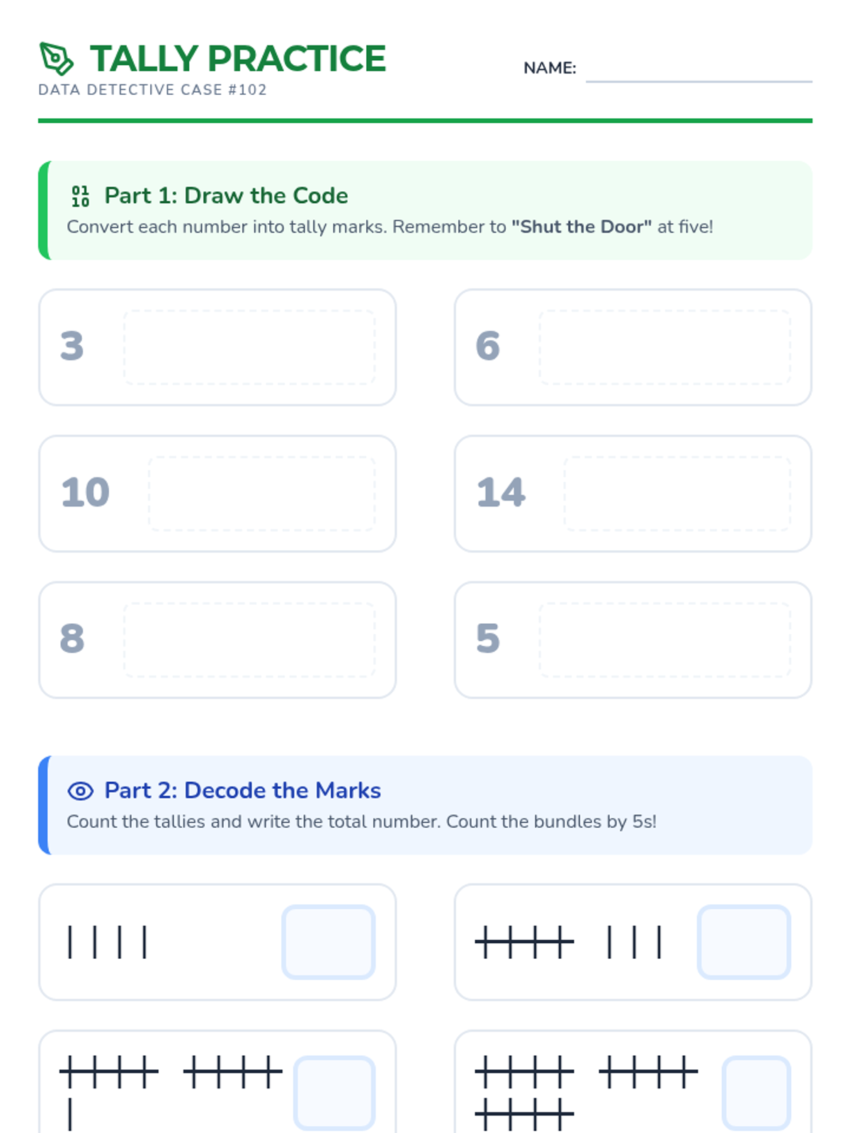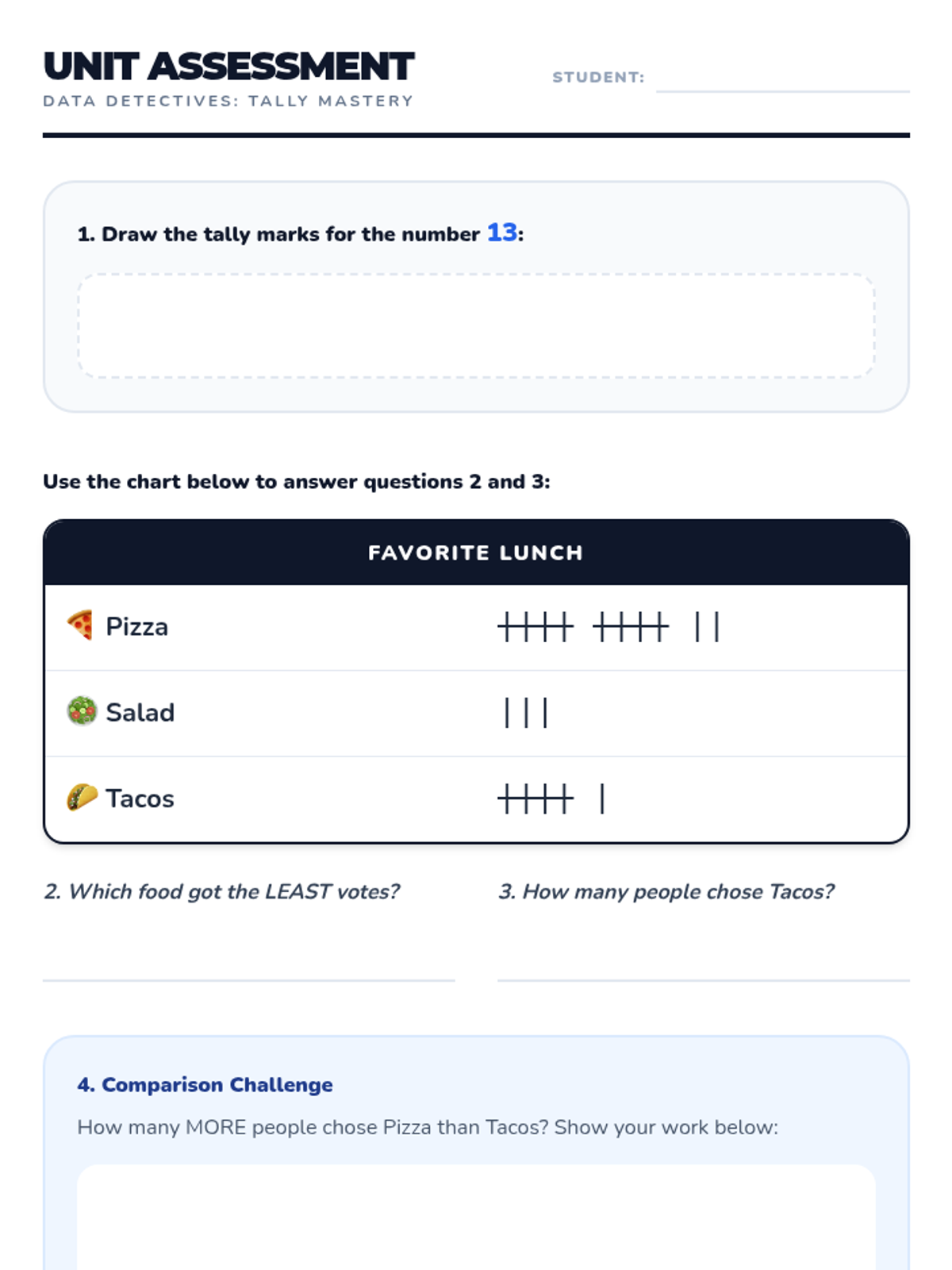 A foundational unit for 2nd graders to master categorical data collection. Students progress from sorting physical objects to using tally marks and creating formal charts to represent classroom survey data.