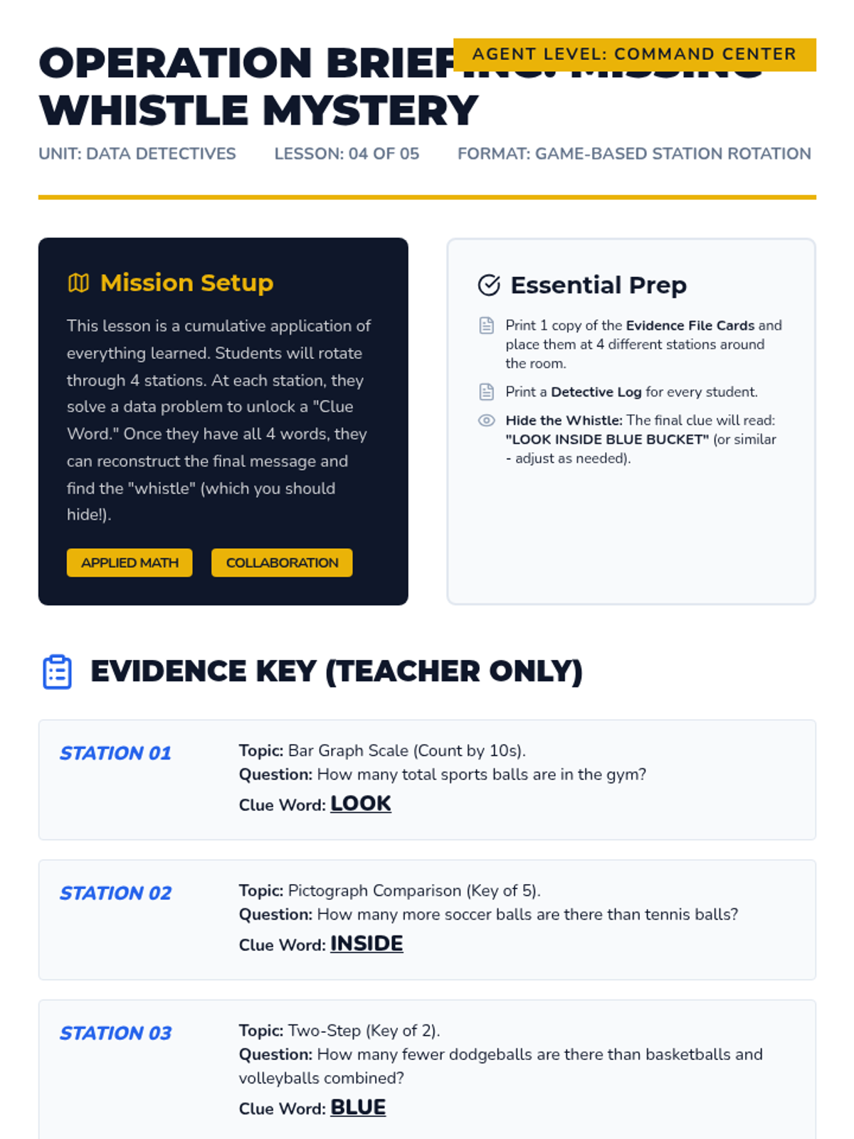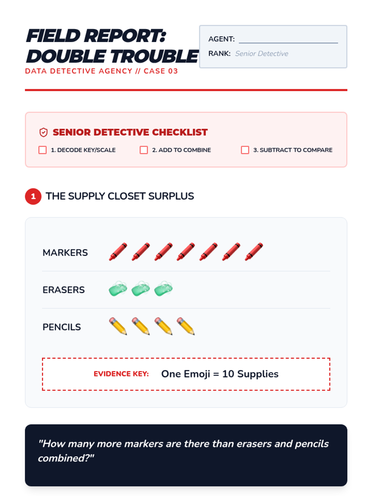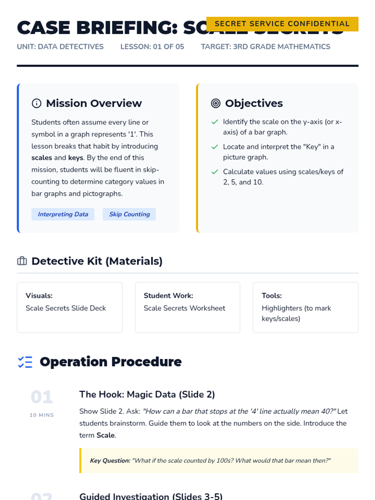 A 5-lesson unit for 3rd graders focused on interpreting bar and picture graphs with various scales to solve one- and two-step math problems. Students take on the role of 'Data Detectives' to decode scales, compare values, and solve a classroom mystery.