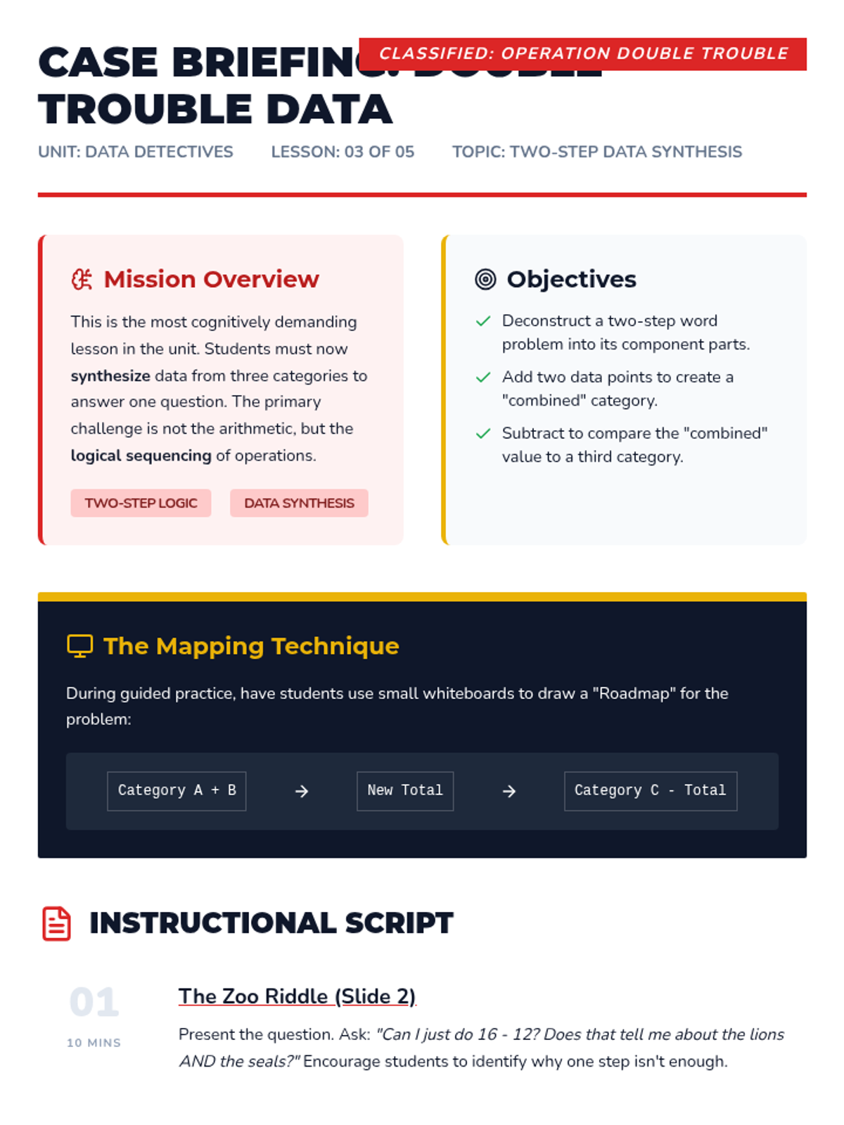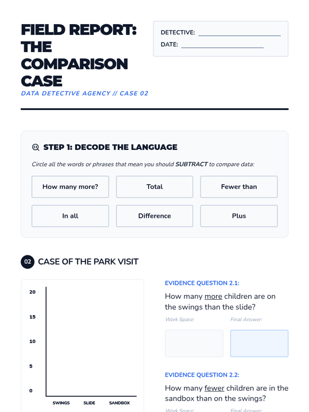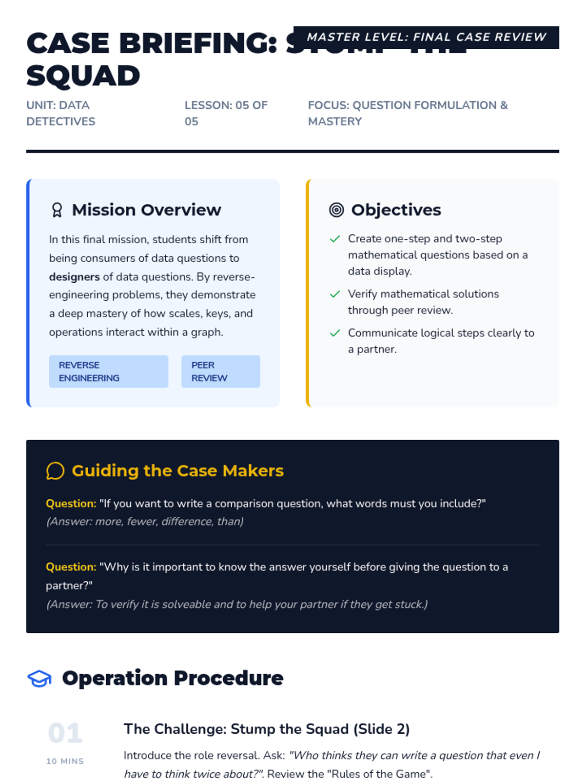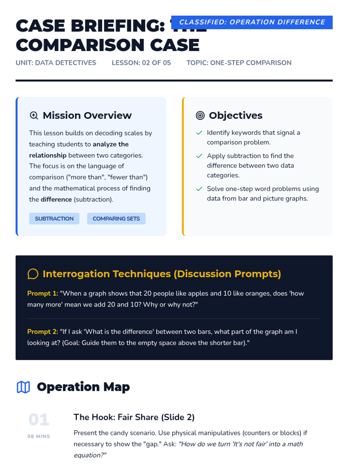A 5-lesson unit for 3rd graders focused on interpreting bar and picture graphs with various scales to solve one- and two-step math problems. Students take on the role of 'Data Detectives' to decode scales, compare values, and solve a classroom mystery.