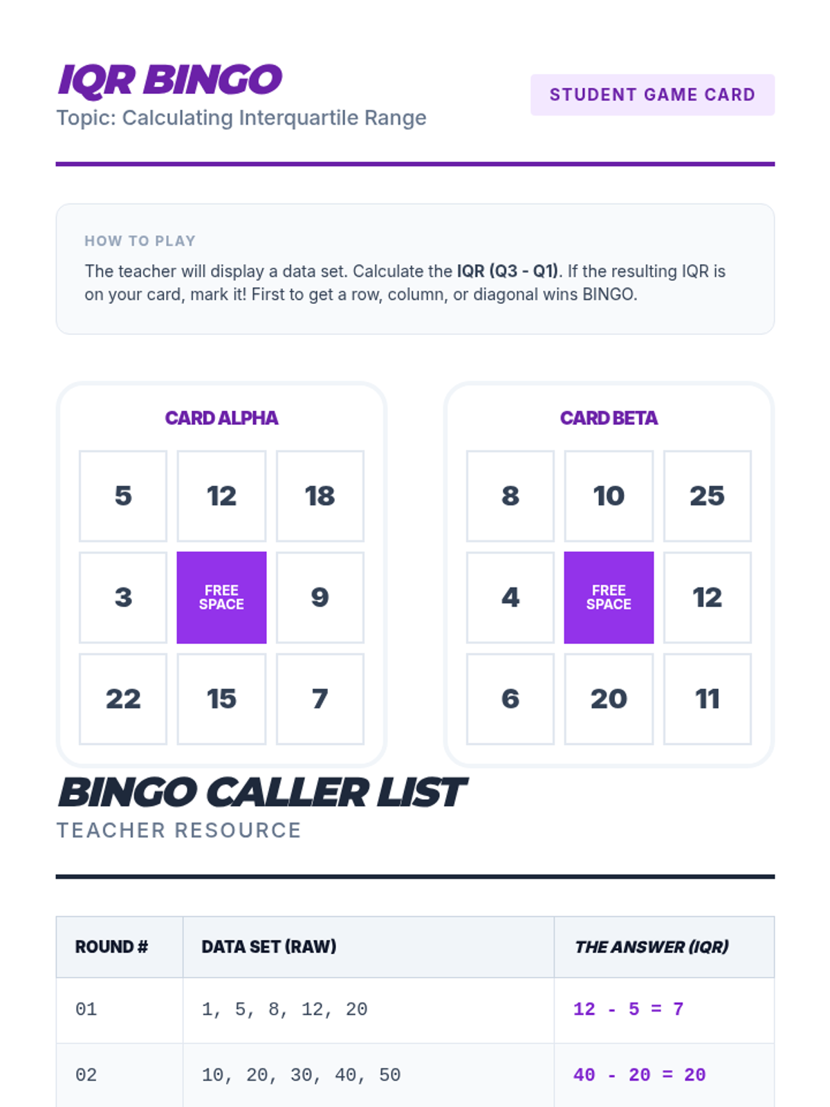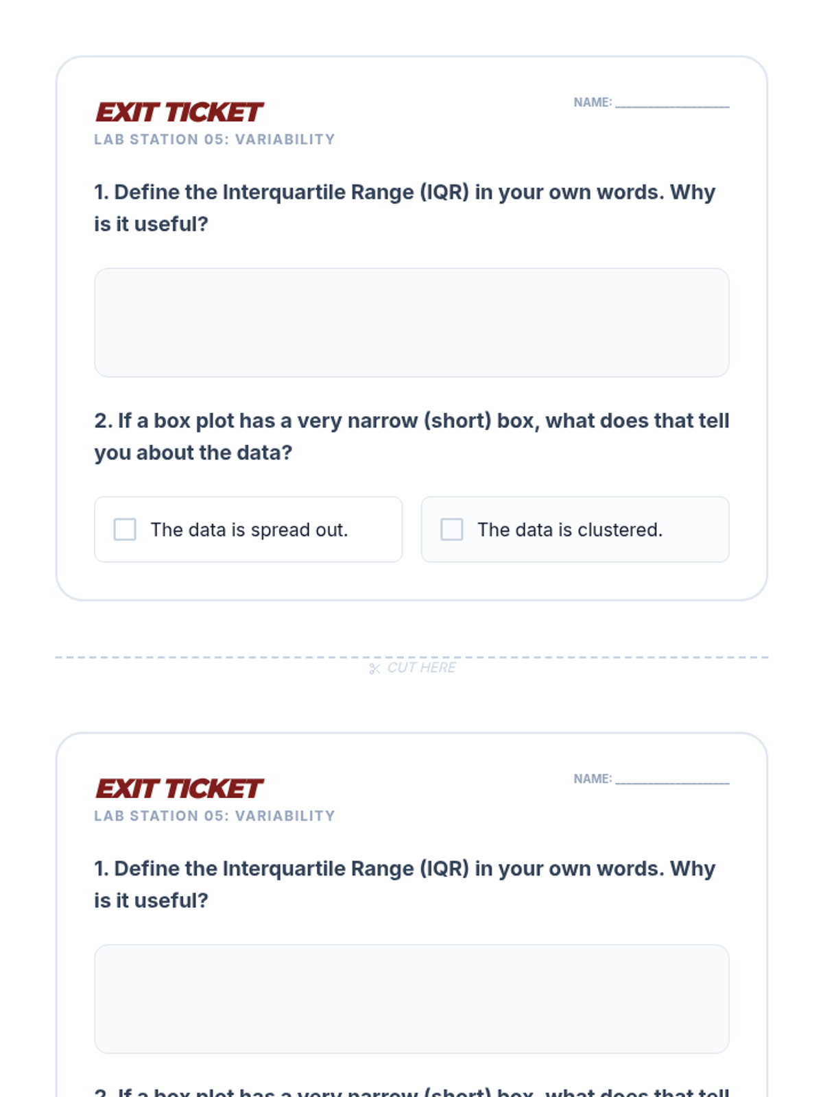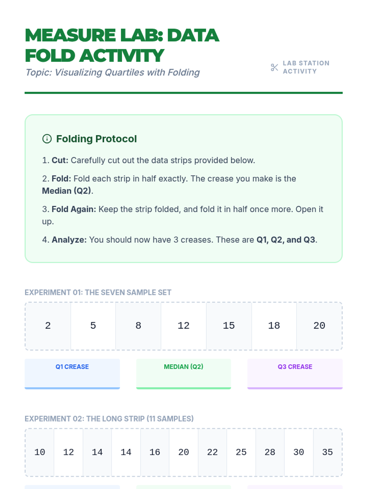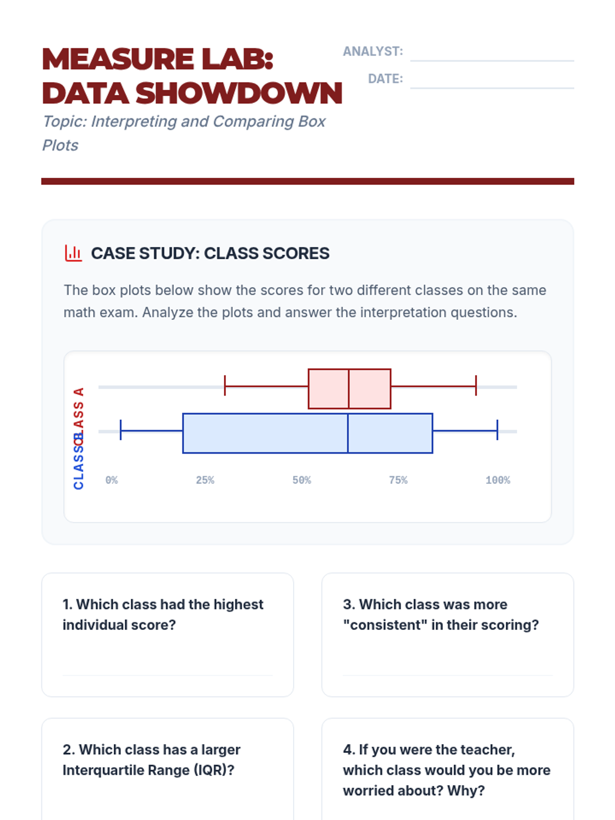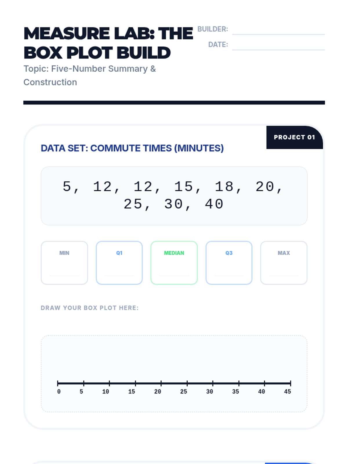 A comprehensive unit for 6th-grade students on statistical variability, focusing on quartiles, Interquartile Range (IQR), and the construction and interpretation of box plots. Students move from basic median splitting to complex data visualization and comparison.