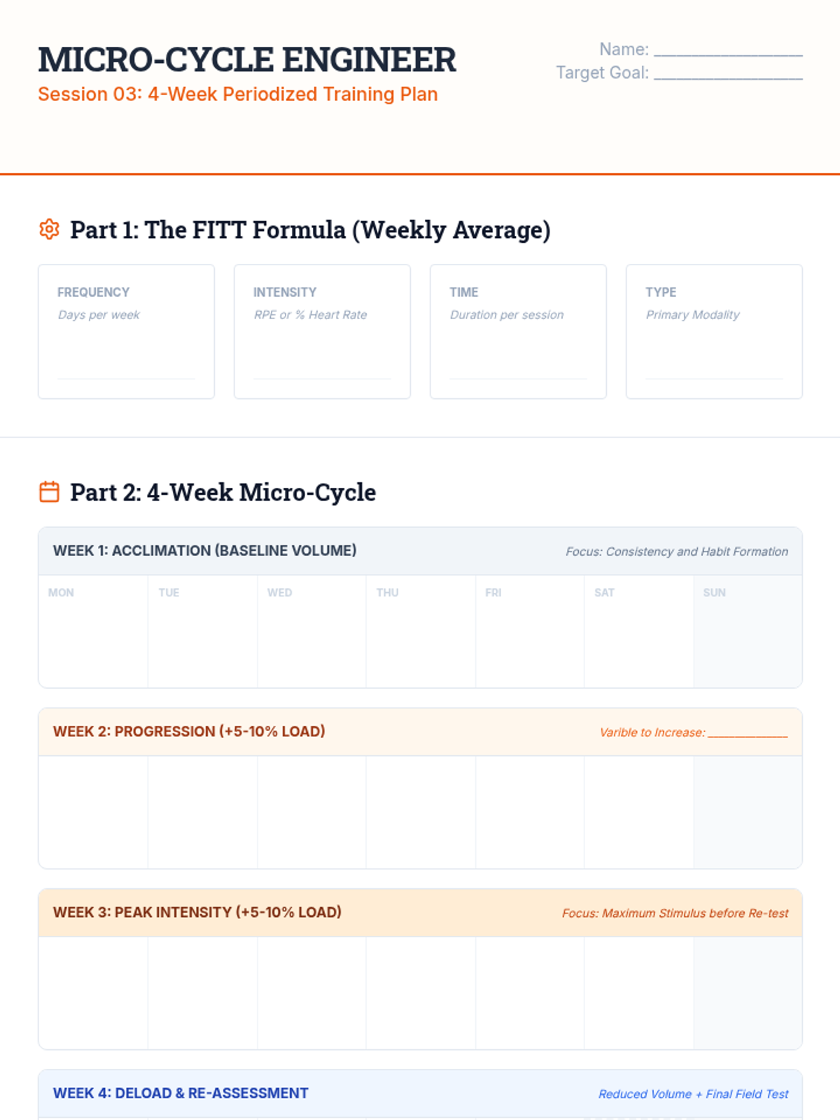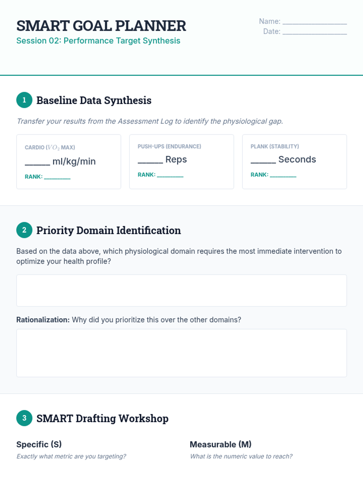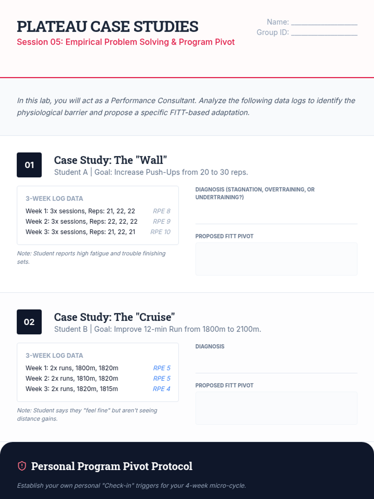 A comprehensive sequence for undergraduate students focused on the scientific application of data-driven fitness planning, assessment, and adjustment. students will develop a professional-grade fitness portfolio through empirical baseline testing, SMART goal formulation, and periodized training design.