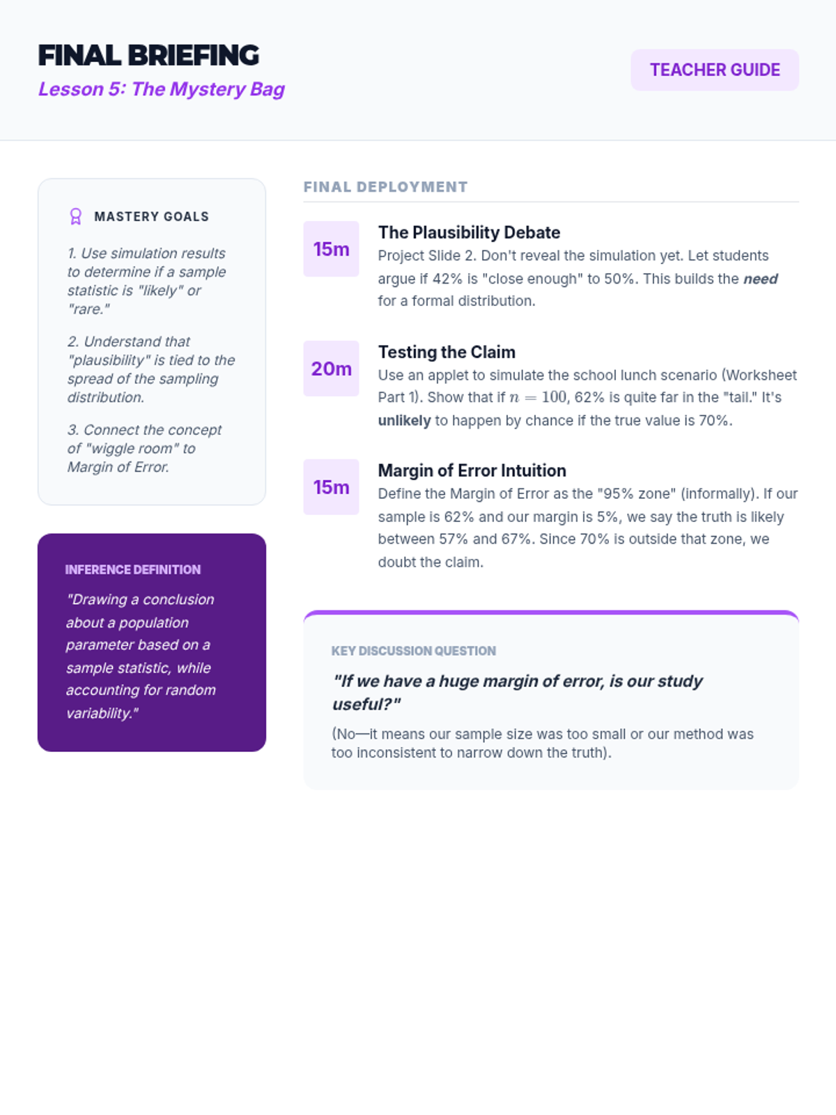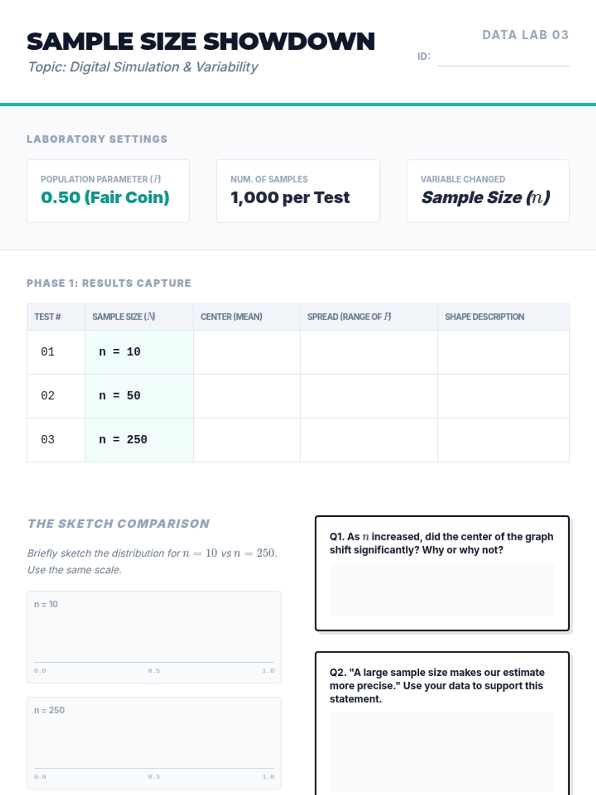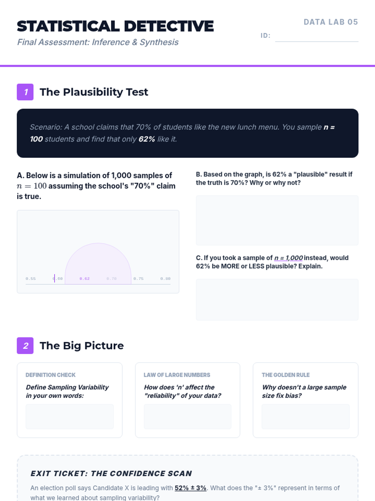 A simulation-based journey through statistical sampling, focusing on the Law of Large Numbers, variability, and the distinction between bias and precision. Students move from manual experiments to digital simulations to build intuition for statistical inference.