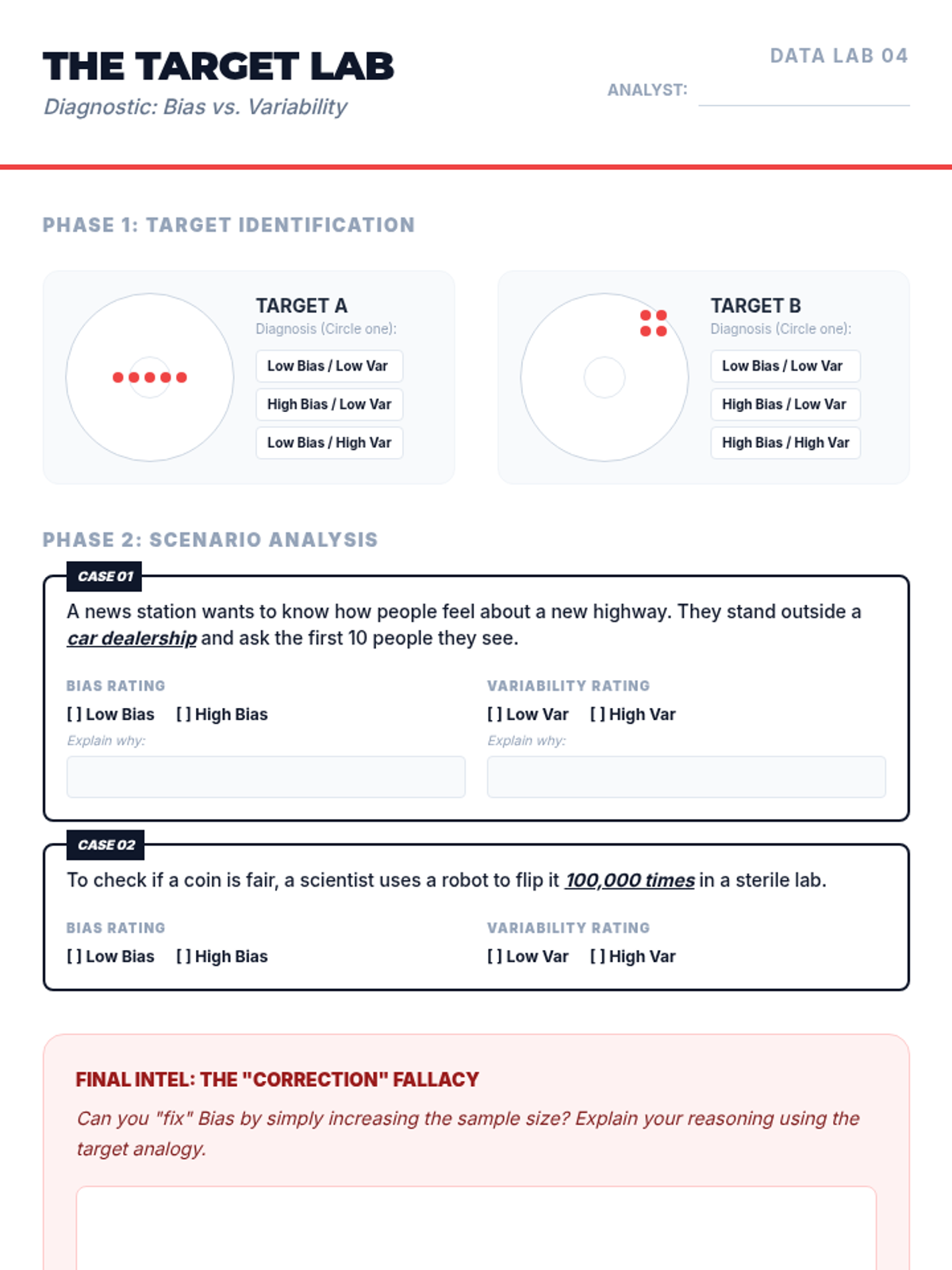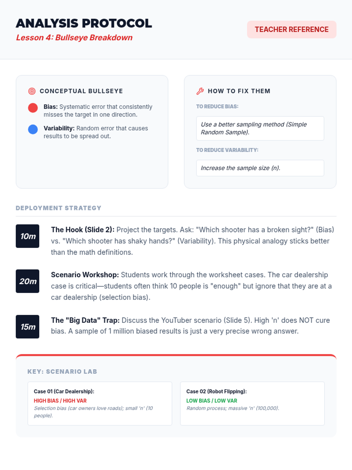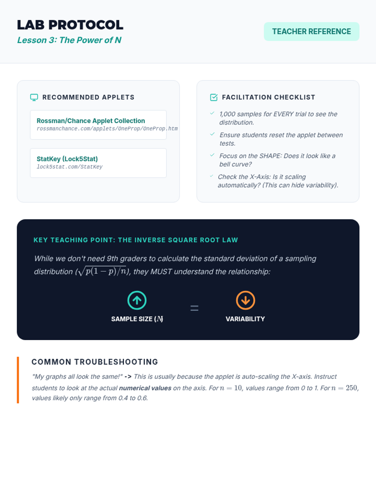 A simulation-based journey through statistical sampling, focusing on the Law of Large Numbers, variability, and the distinction between bias and precision. Students move from manual experiments to digital simulations to build intuition for statistical inference.
