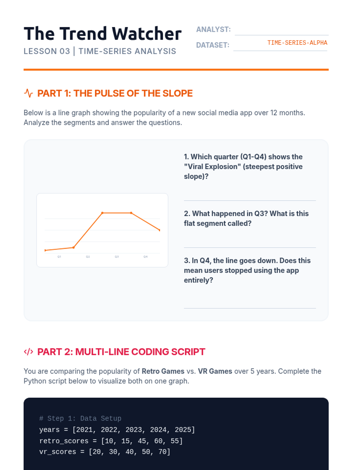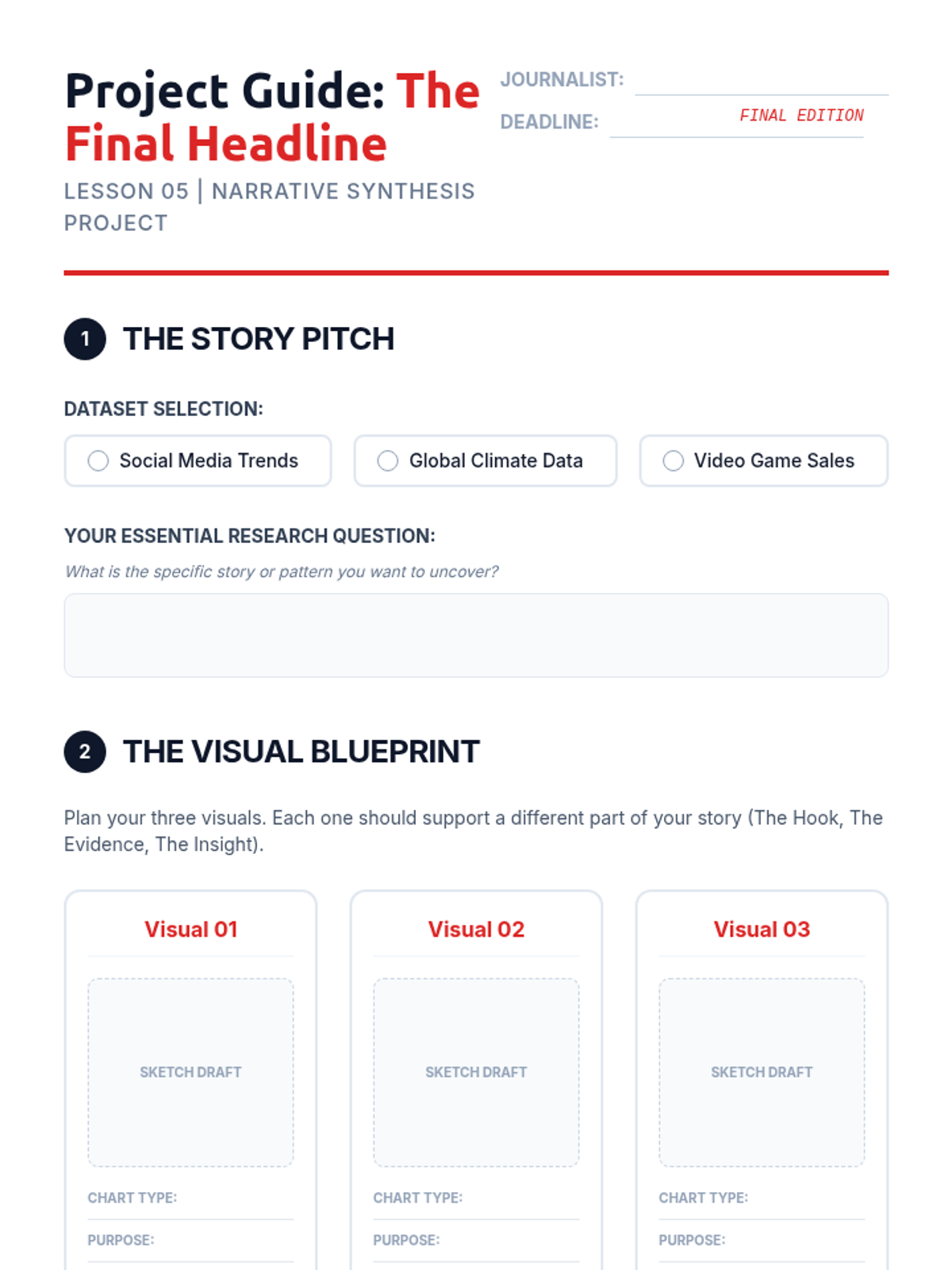 A project-based sequence for 8th-grade students exploring data analysis through Python-based visualization. Students learn to critique, code, and construct narratives using various chart types to answer the essential question of how visualization choices influence data storytelling.