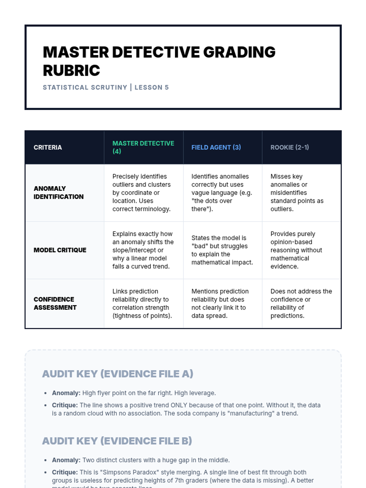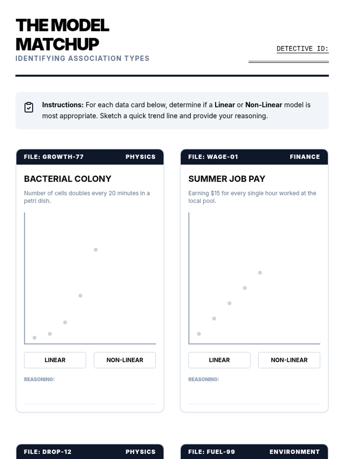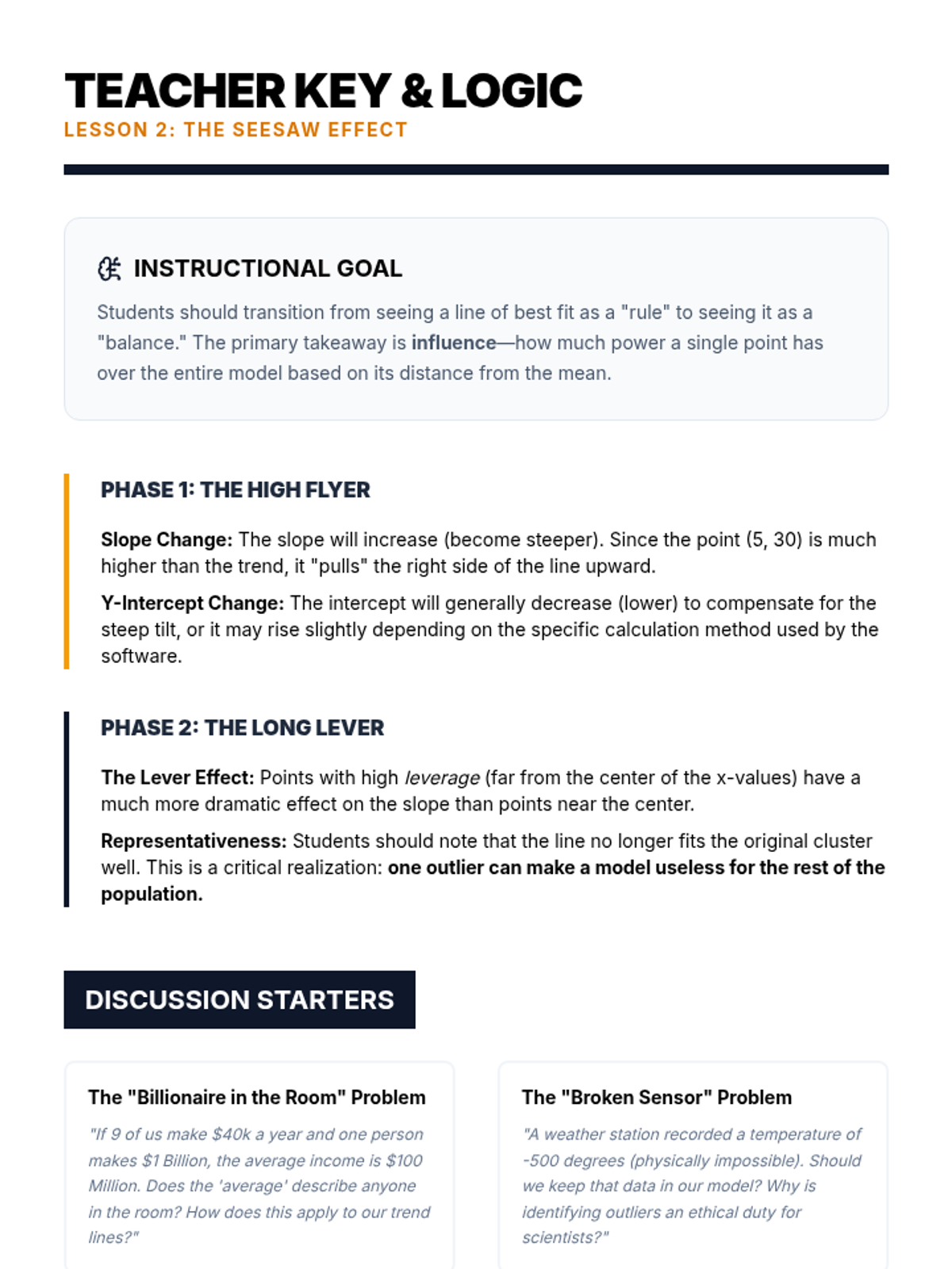 This sequence focuses on the critical analysis of data reliability, outliers, and the validity of linear associations. Students explore messy data, identify clusters and outliers, and evaluate when a linear model is appropriate versus when it might be misleading.