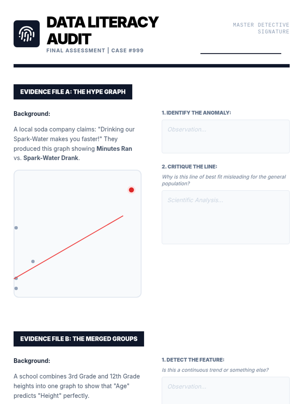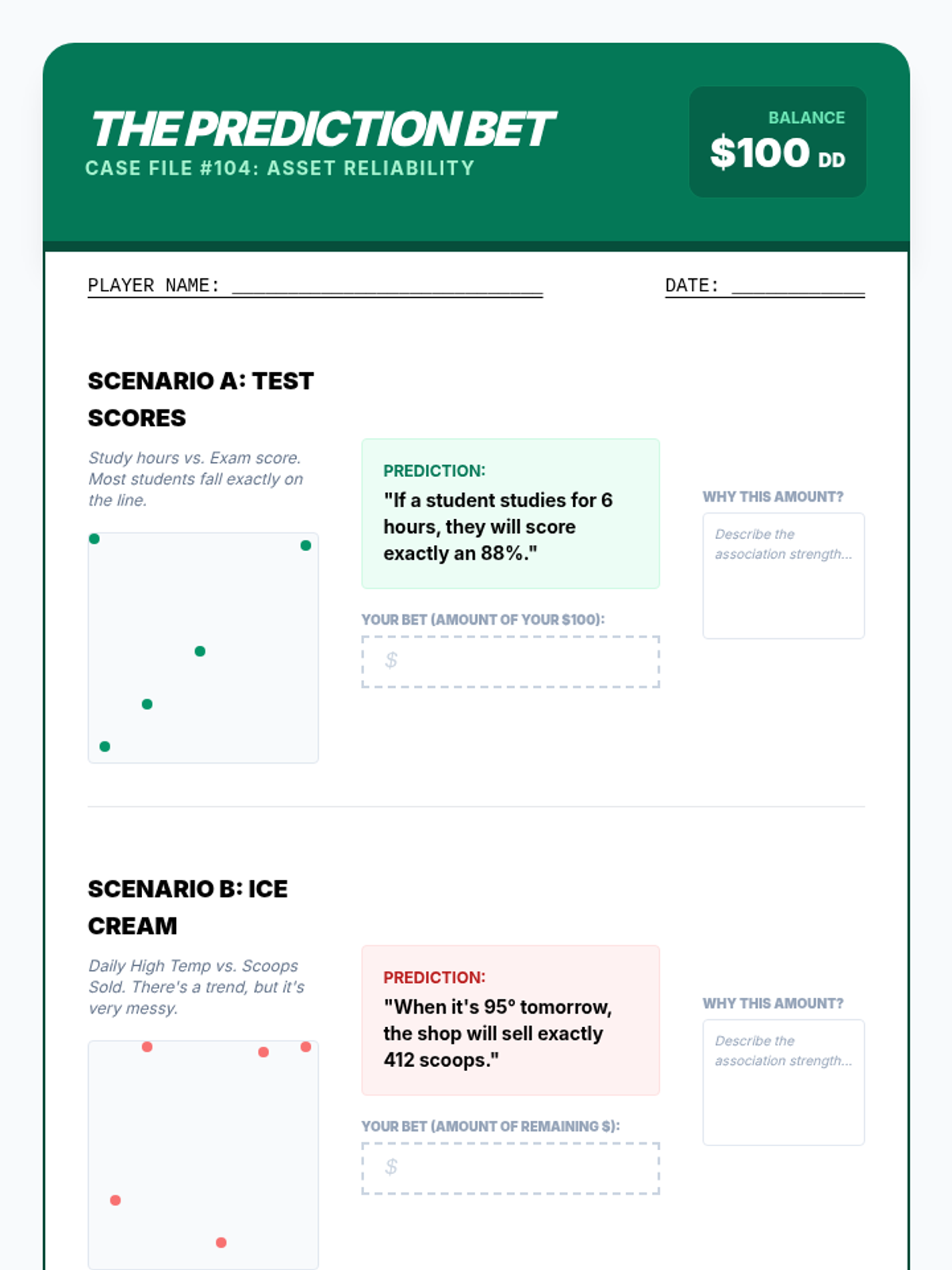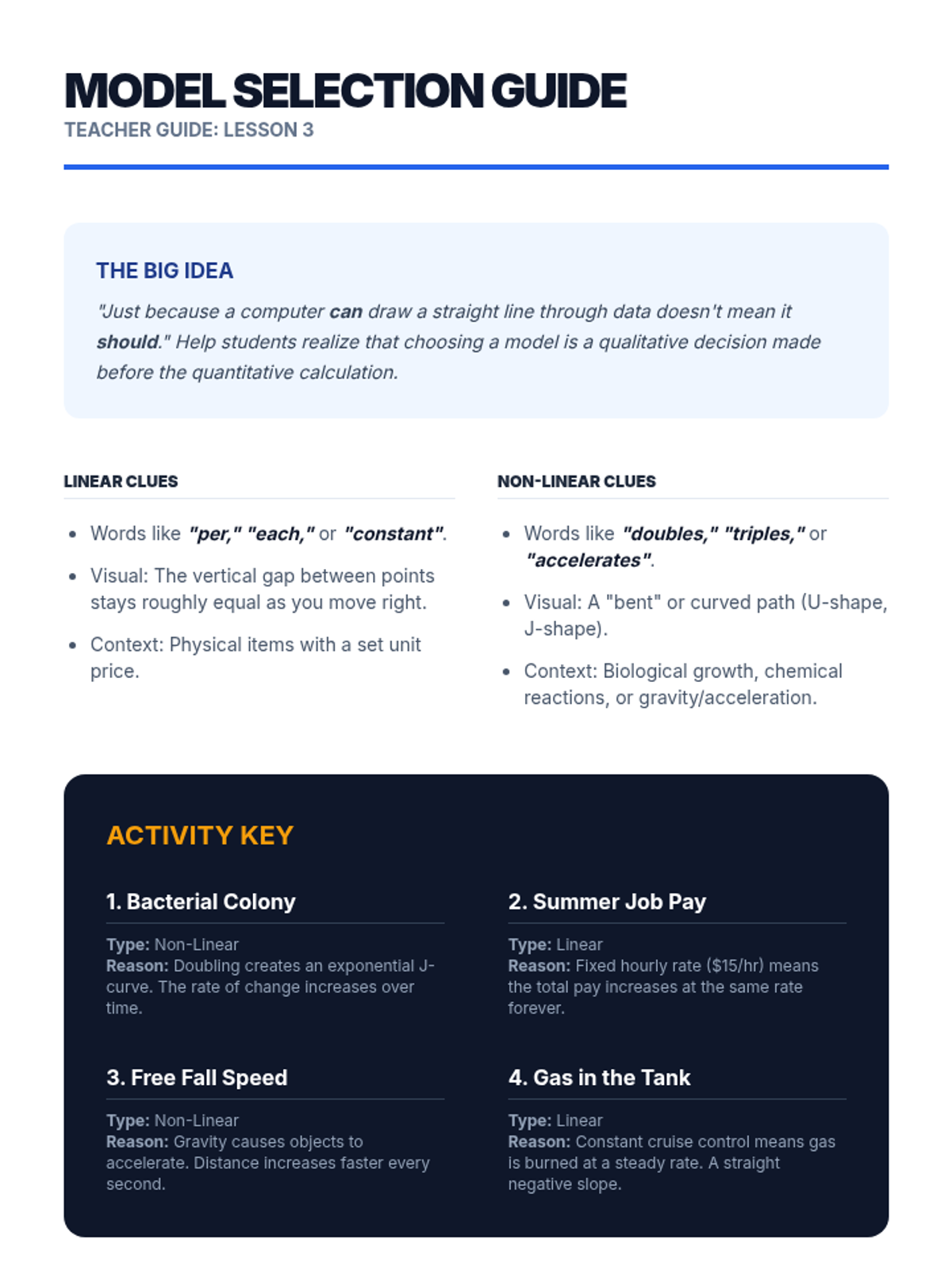 This sequence focuses on the critical analysis of data reliability, outliers, and the validity of linear associations. Students explore messy data, identify clusters and outliers, and evaluate when a linear model is appropriate versus when it might be misleading.