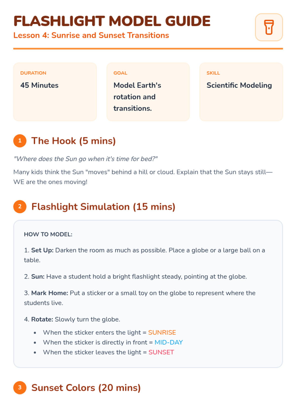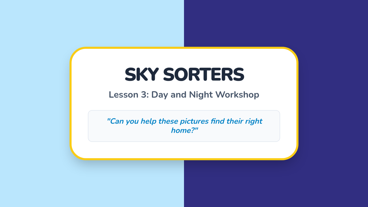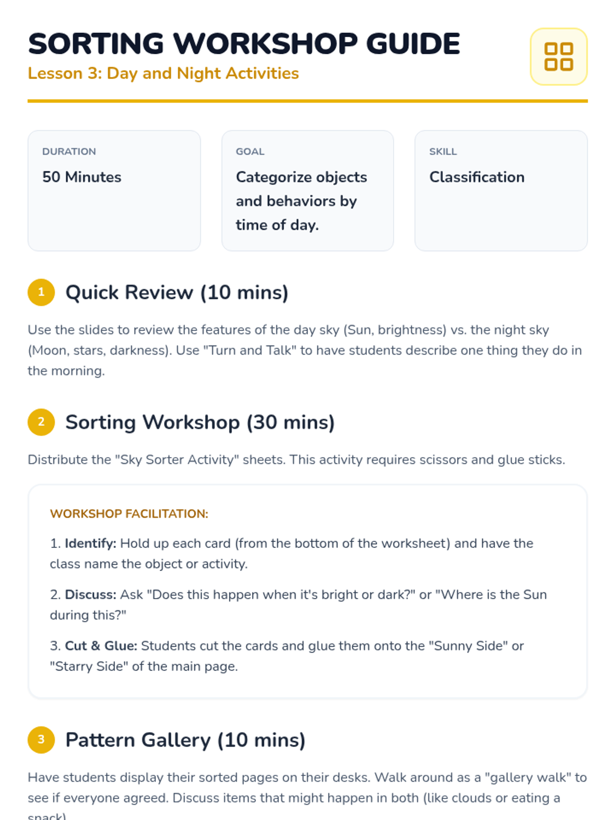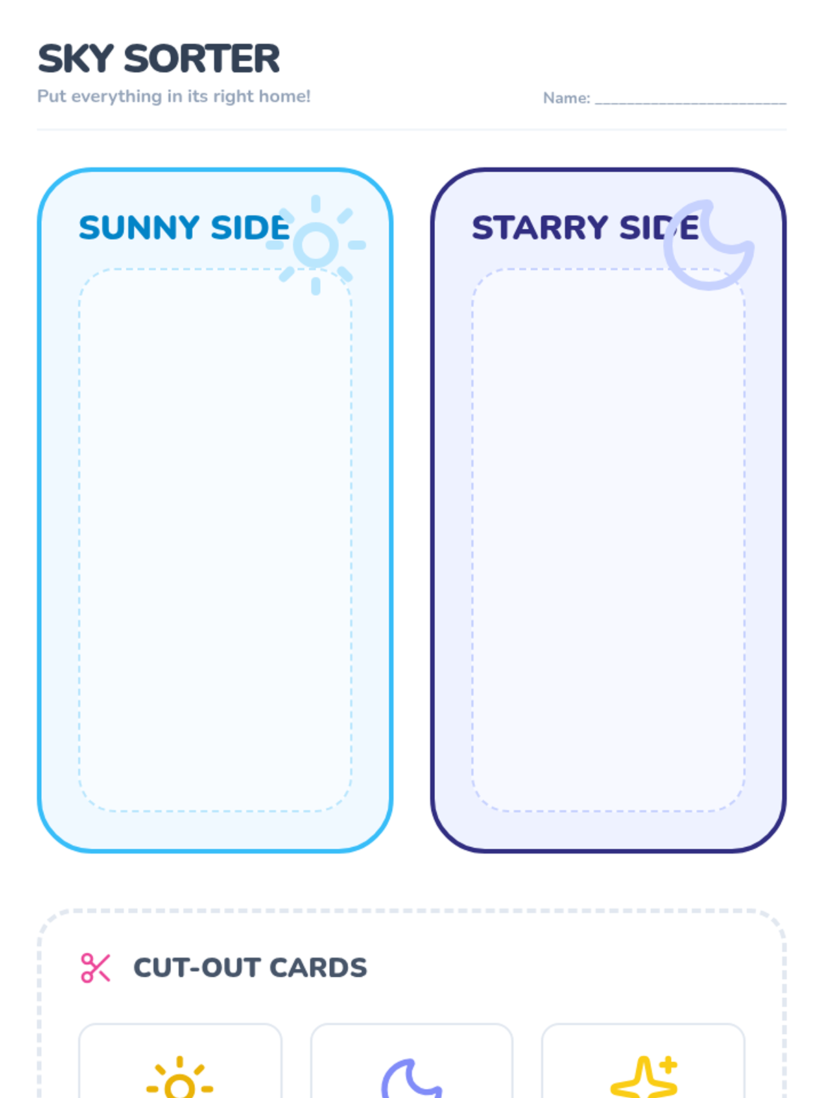 This sequence guides Kindergarten students through the fundamental observations of the daily cycle of light and dark. Students begin by identifying the primary celestial differences between day and night skies, focusing on the presence of the Sun versus the Moon and stars. Through observation and sorting activities, learners build an understanding that these changes happen in a predictable pattern. By the end of the sequence, students will be able to distinguish between daytime and nighttime celestial objects and describe the basic daily cycle.