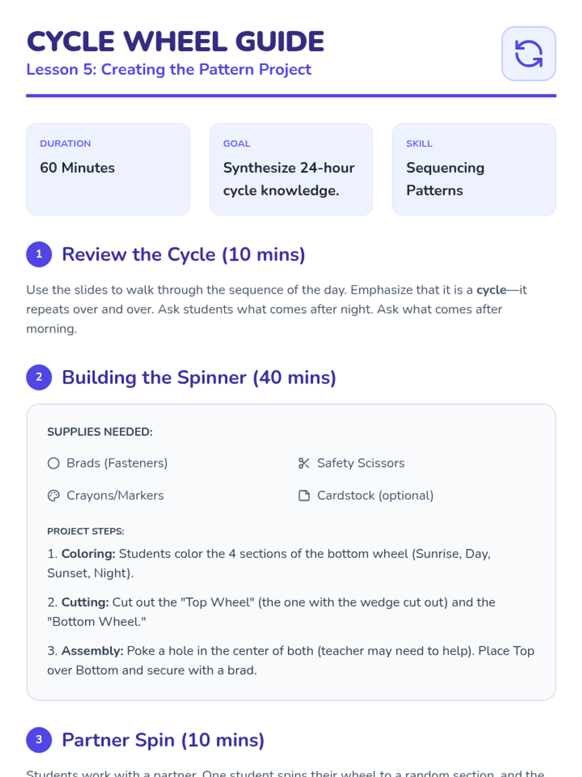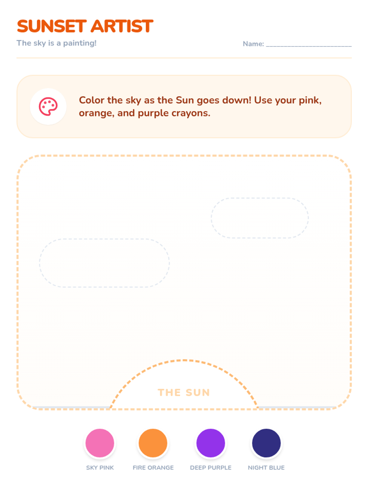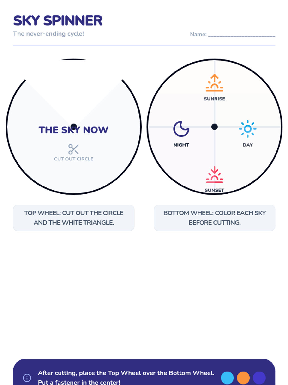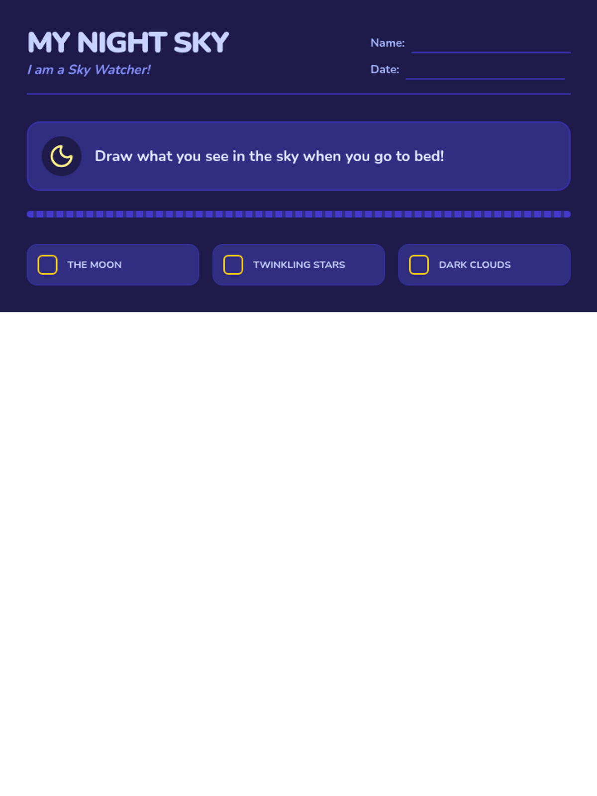 This sequence guides Kindergarten students through the fundamental observations of the daily cycle of light and dark. Students begin by identifying the primary celestial differences between day and night skies, focusing on the presence of the Sun versus the Moon and stars. Through observation and sorting activities, learners build an understanding that these changes happen in a predictable pattern. By the end of the sequence, students will be able to distinguish between daytime and nighttime celestial objects and describe the basic daily cycle.