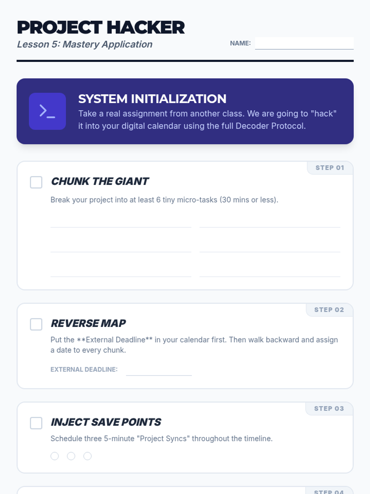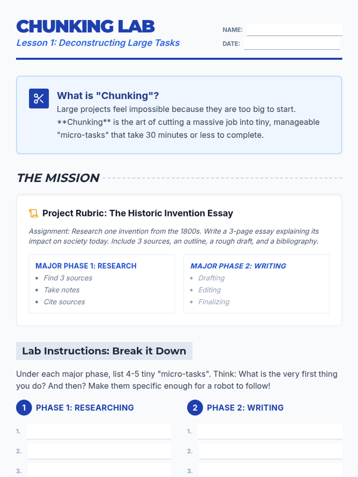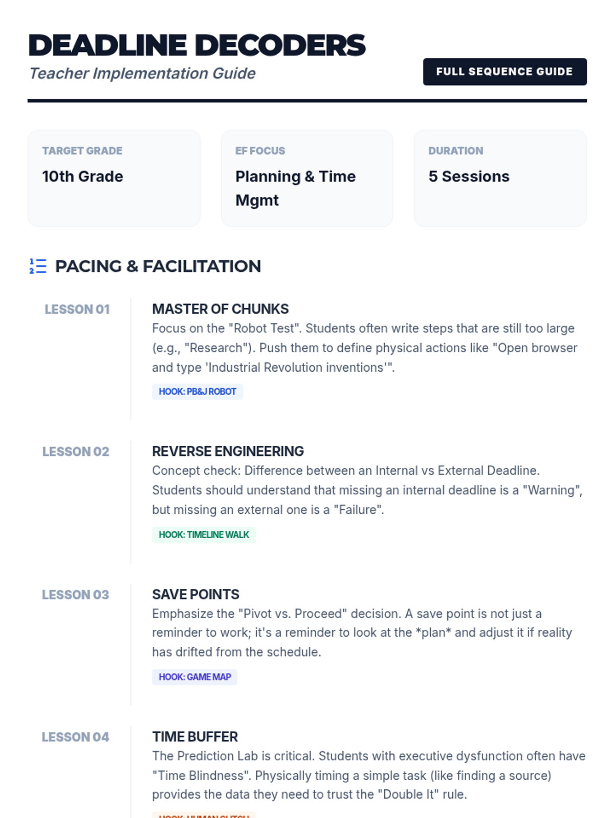This project-based sequence teaches 10th-grade students with executive functioning challenges how to use digital calendars to break down overwhelming long-term projects into manageable, scheduled tasks. Students learn backwards mapping, task chunking, and time estimation to transform deadlines into actionable steps.