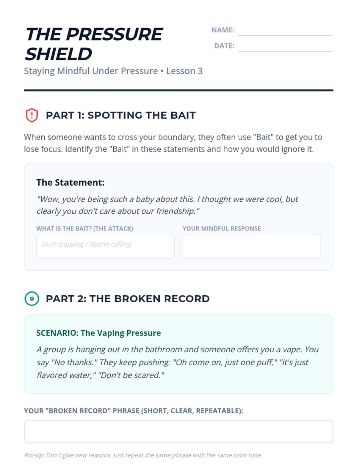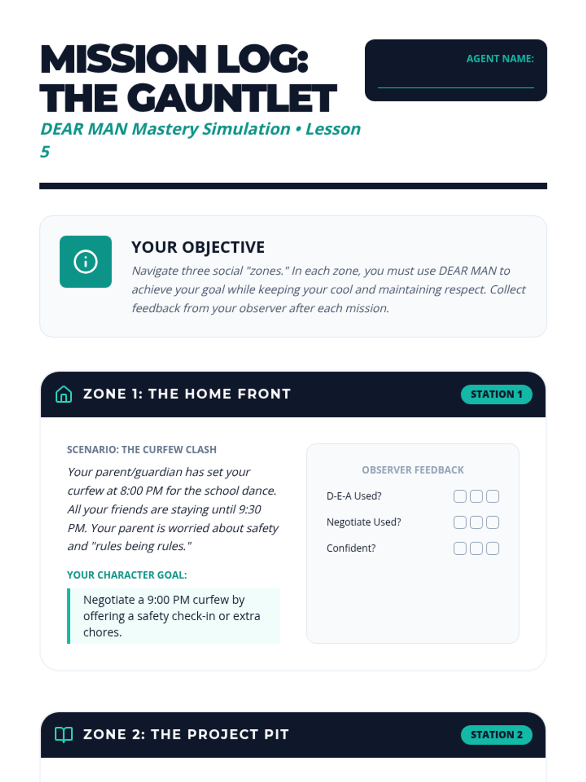 A comprehensive 5-lesson sequence for 7th graders on DEAR MAN communication skills, focusing on boundary setting, refusal techniques, and negotiation in peer conflicts.