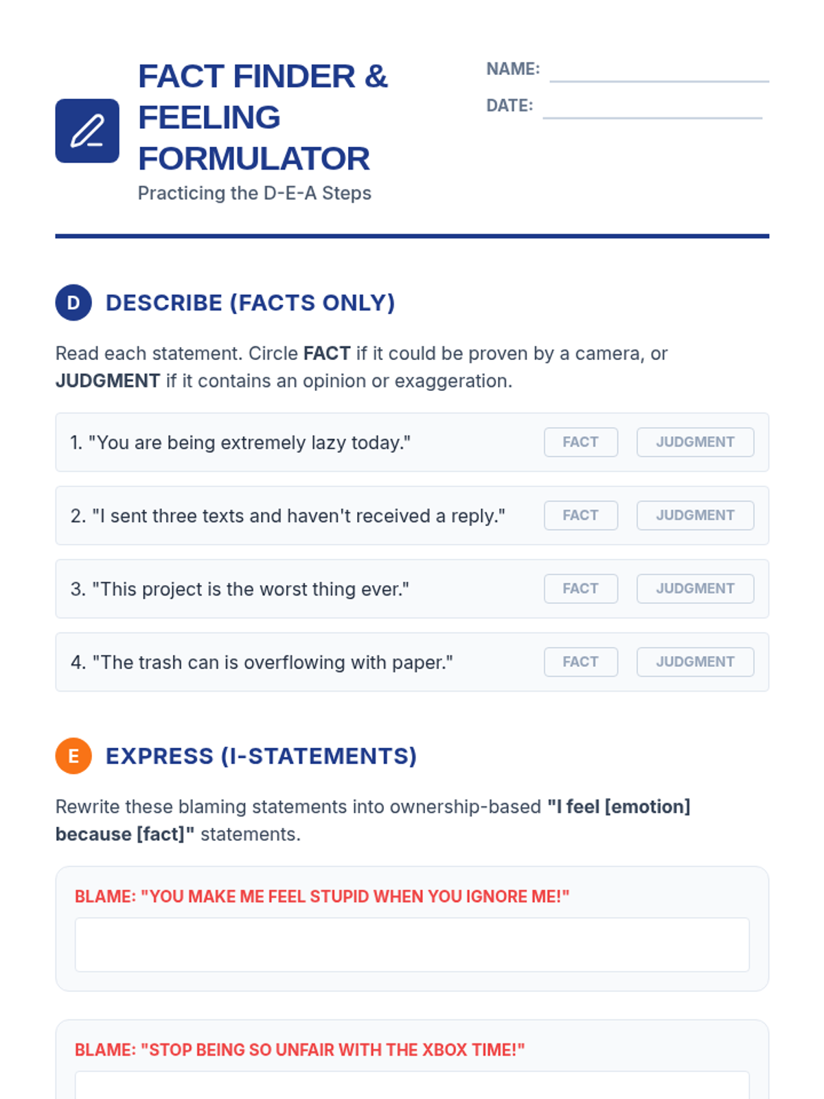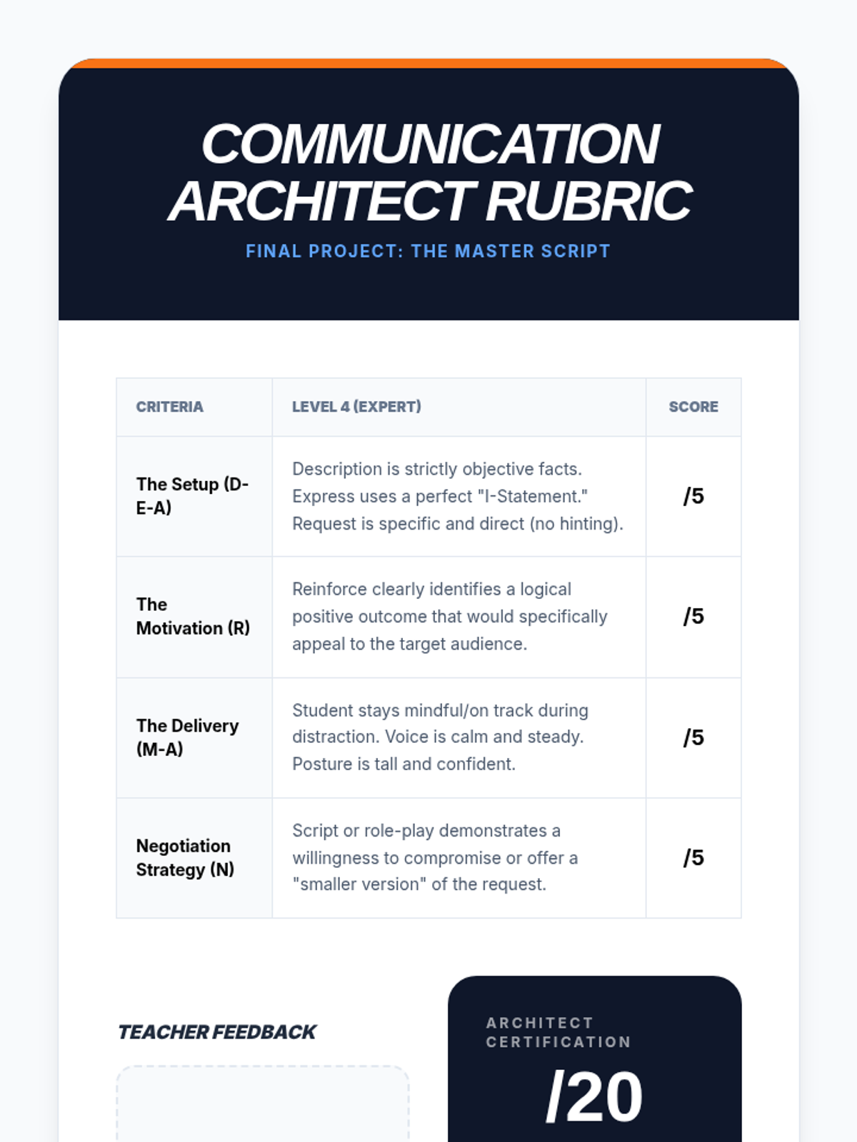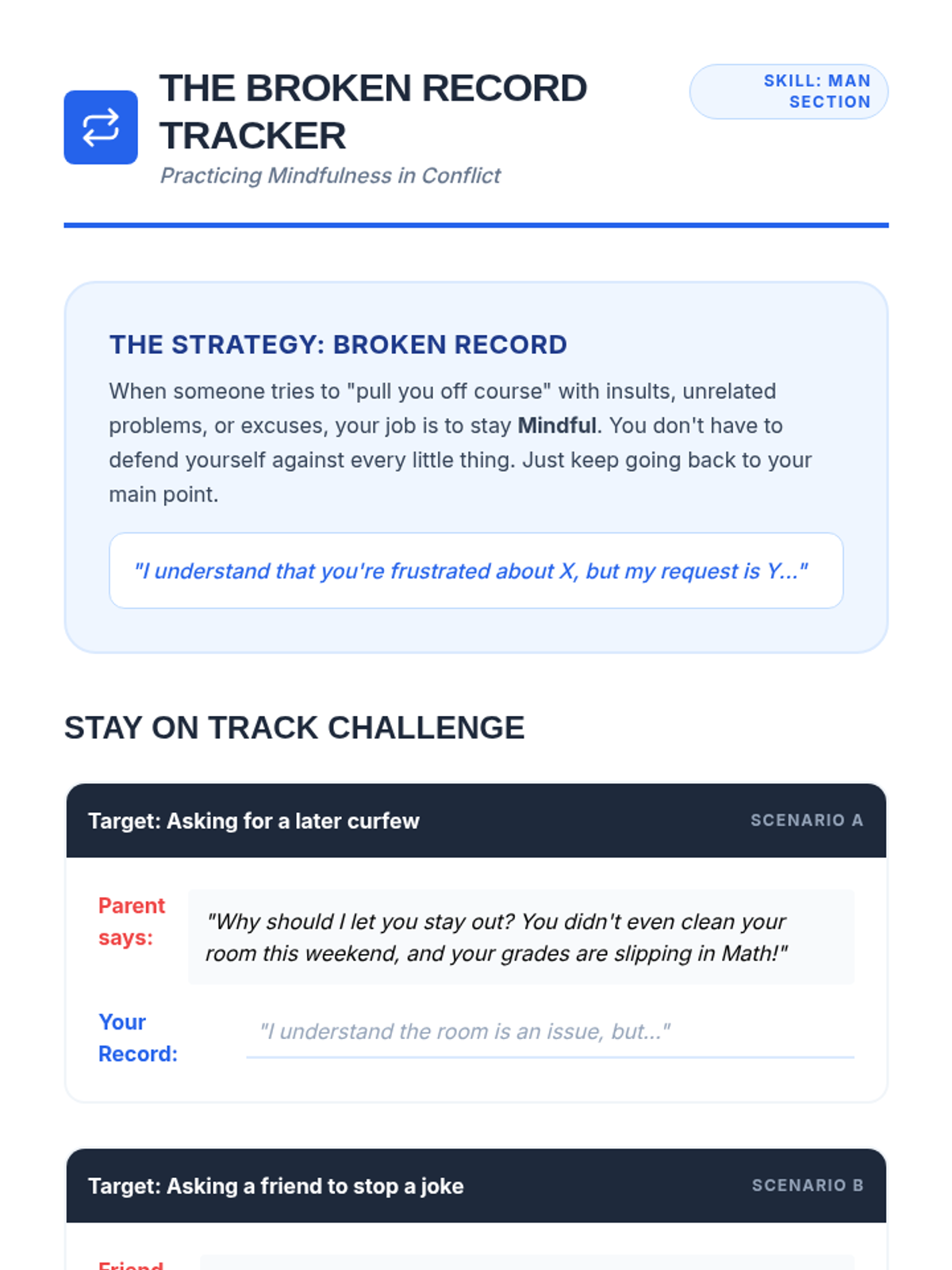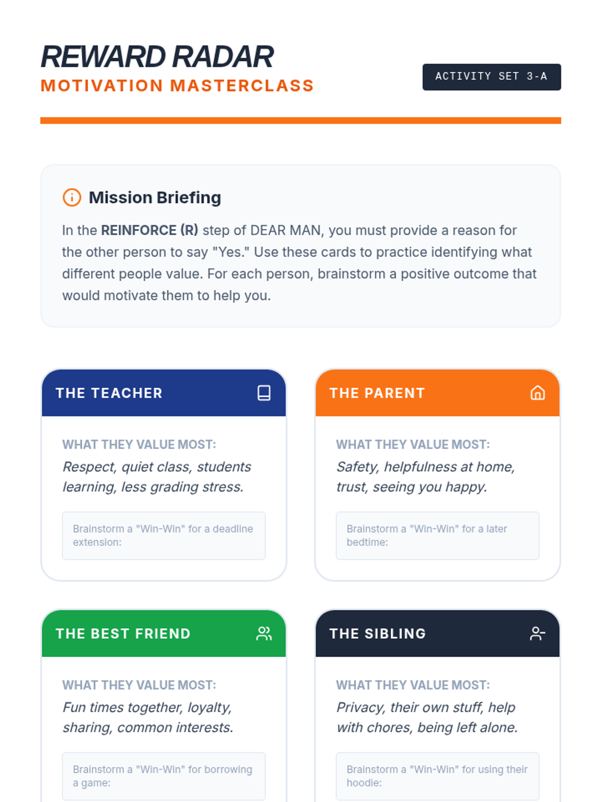A comprehensive sequence for 7th graders on the DEAR MAN dialectical behavior therapy skill, teaching students to structure assertive requests effectively. Students progress from identifying communication styles to drafting and delivering polished scripts for real-life needs.