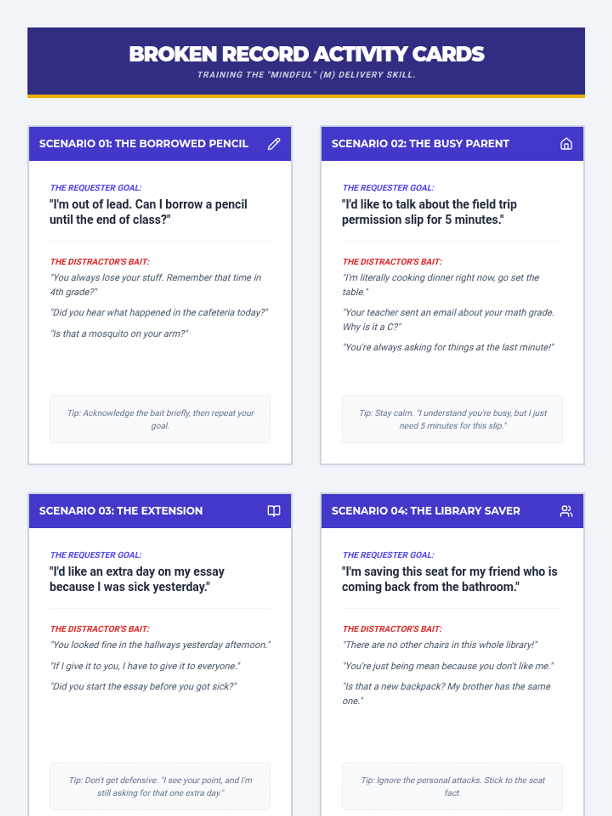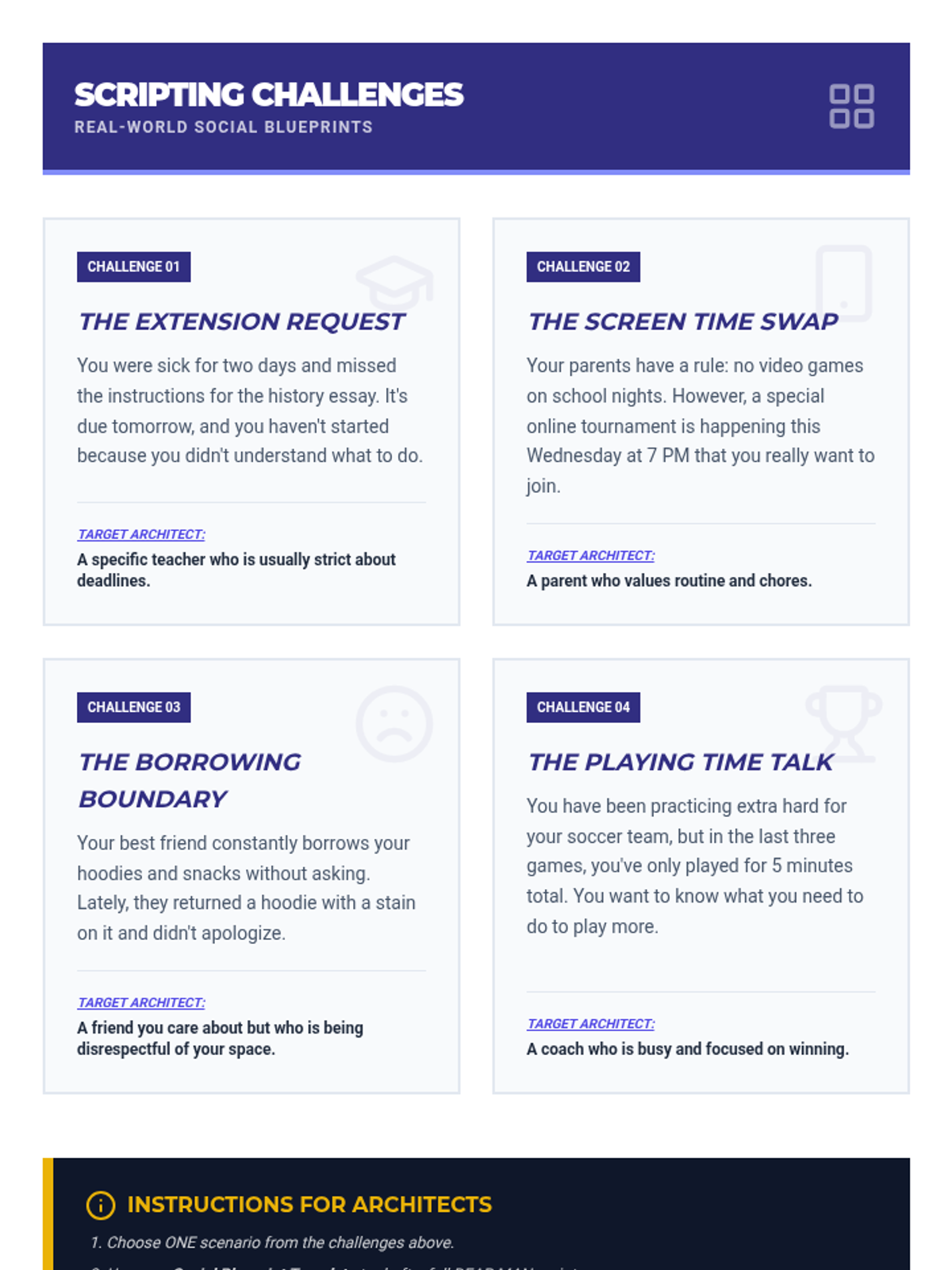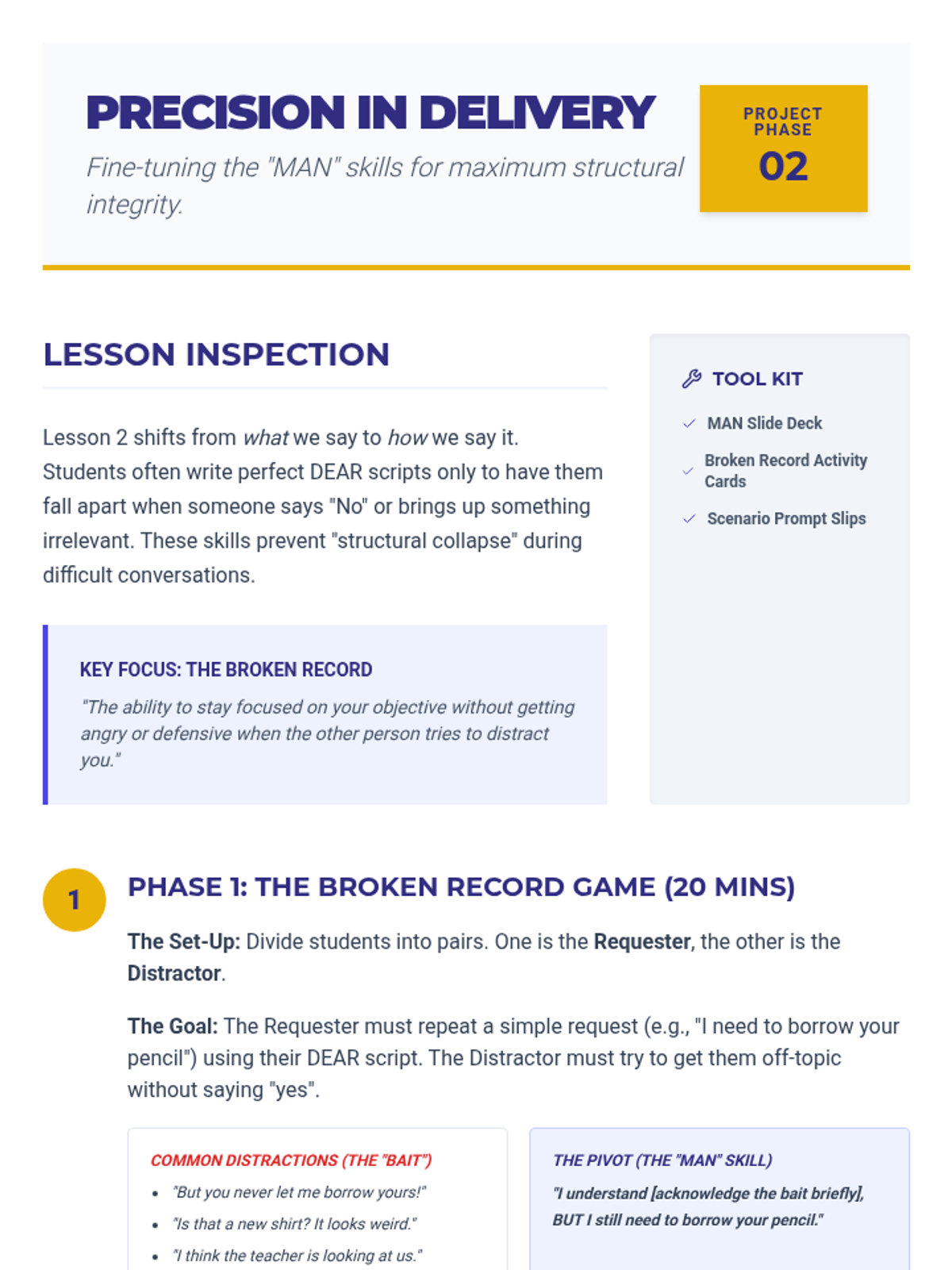 A comprehensive 5-lesson unit for 6th graders on the DBT DEAR MAN framework, teaching assertive communication, boundary setting, and negotiation skills through architectural-themed 'blueprints' for social success.