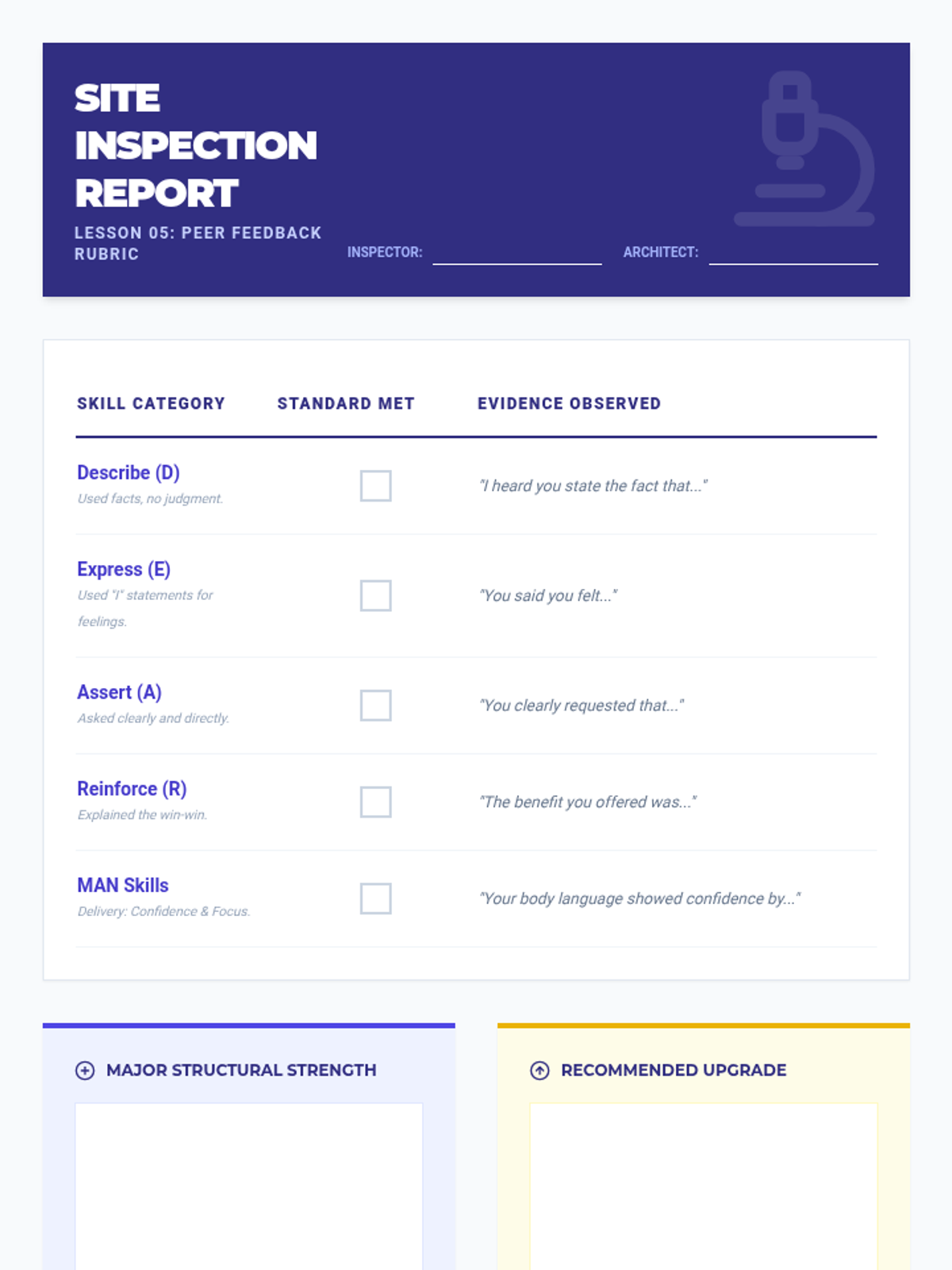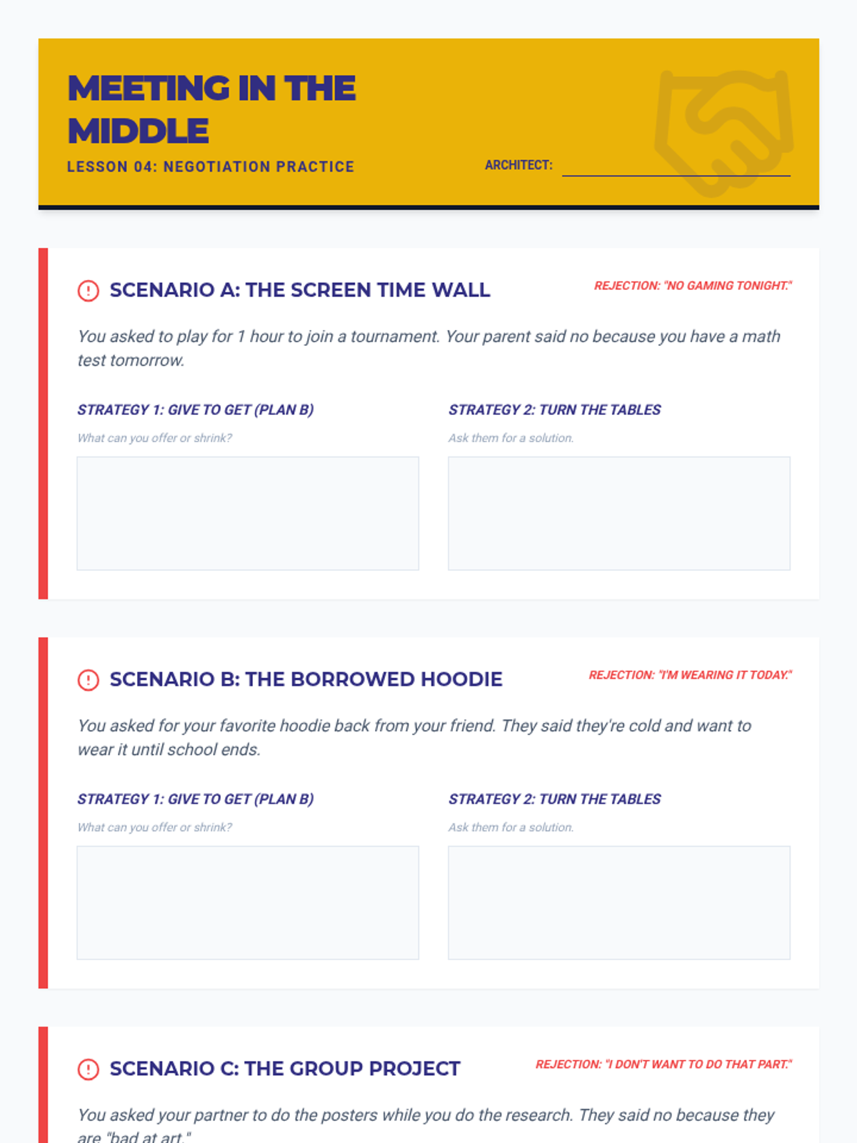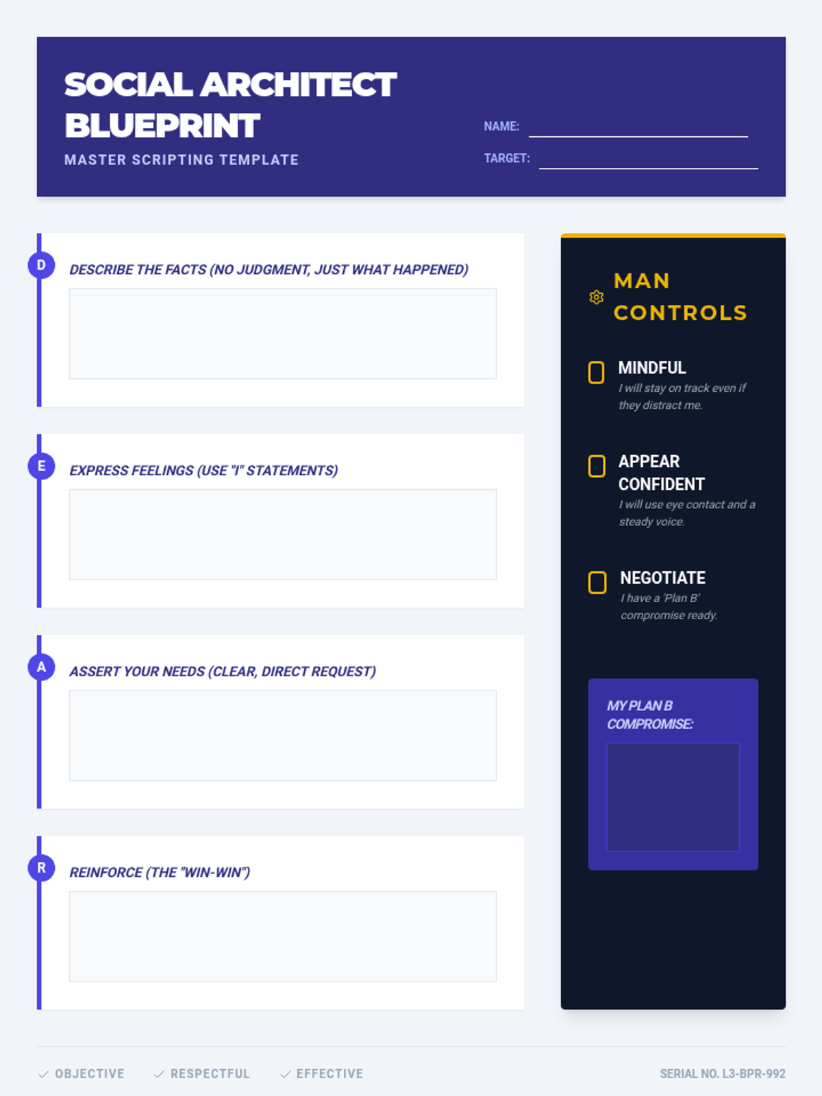 A comprehensive 5-lesson unit for 6th graders on the DBT DEAR MAN framework, teaching assertive communication, boundary setting, and negotiation skills through architectural-themed 'blueprints' for social success.