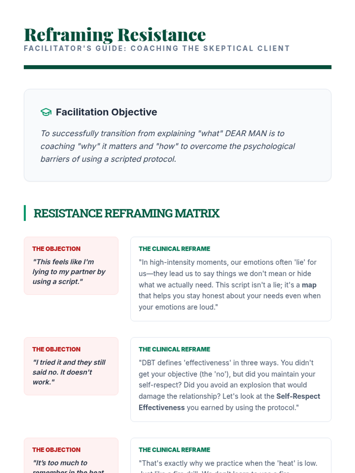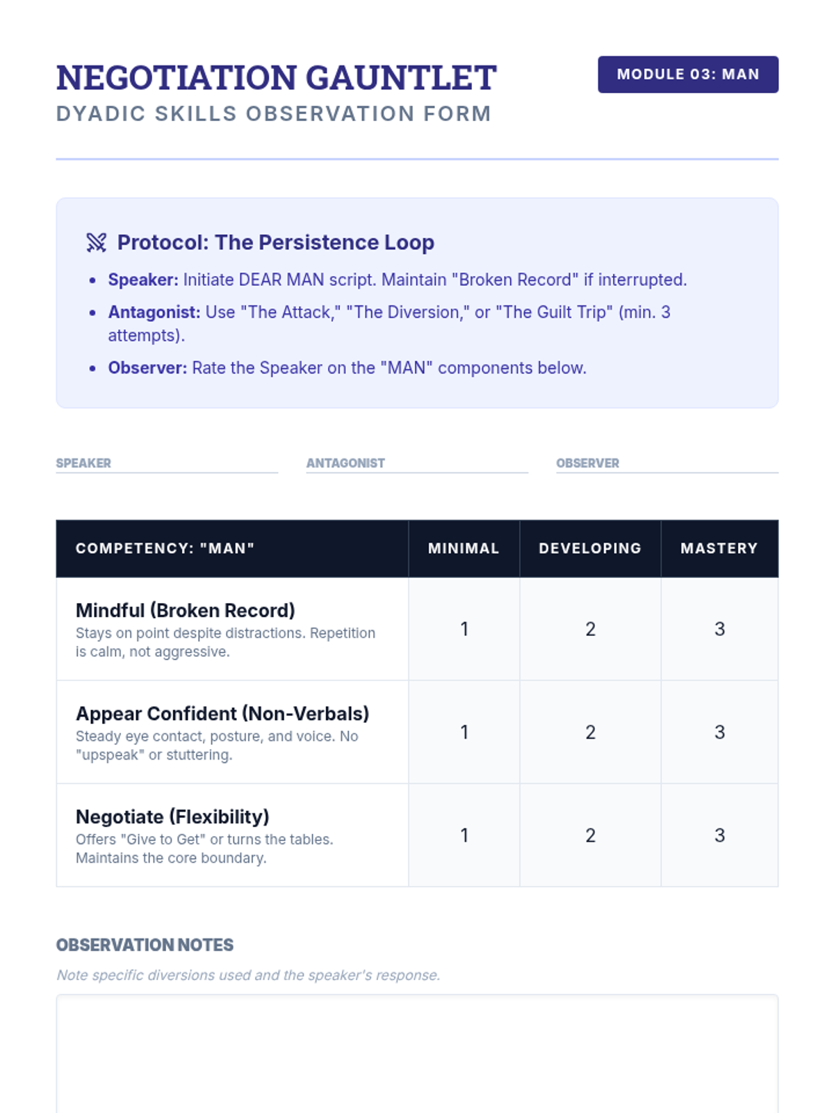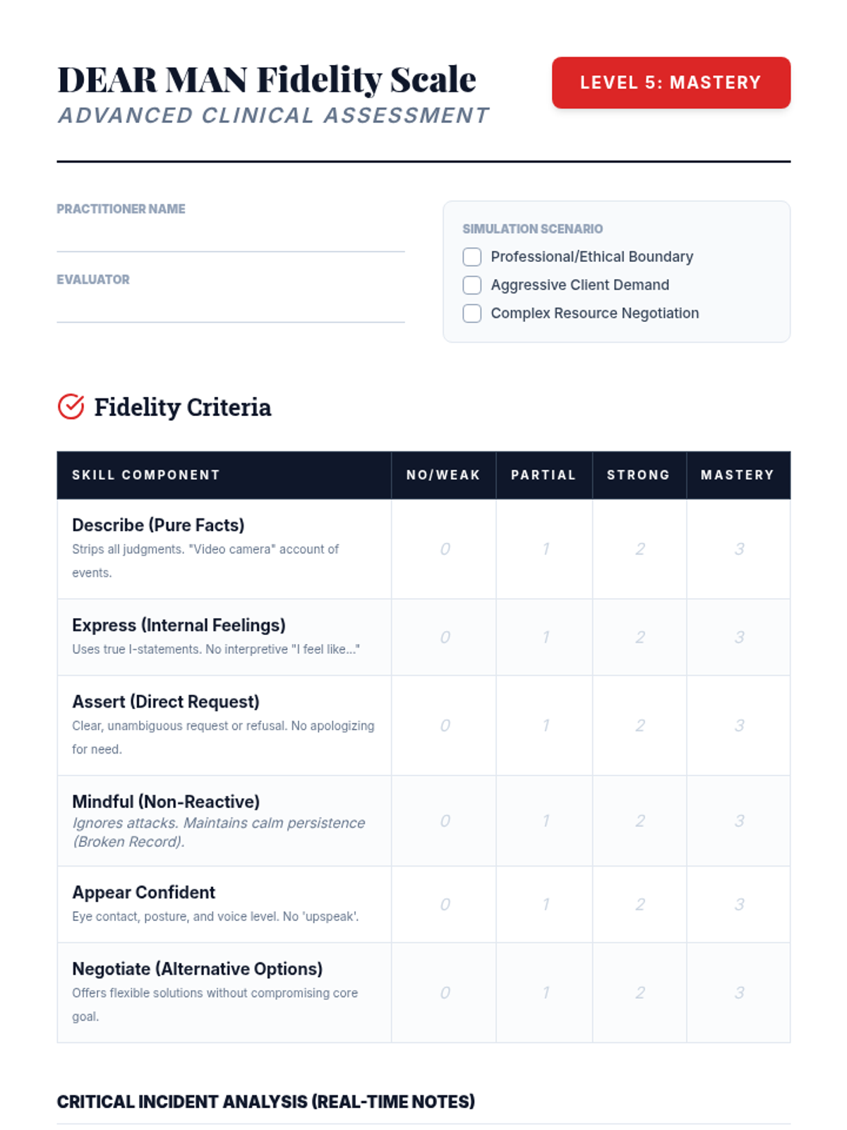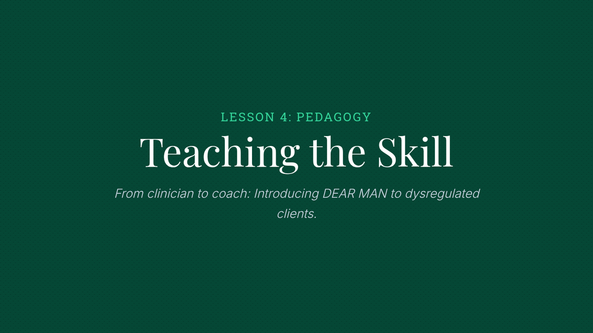 An advanced clinical training sequence for graduate students to master the DBT DEAR MAN communication protocol, focusing on theoretical depth, precise scripting, and high-fidelity simulation.