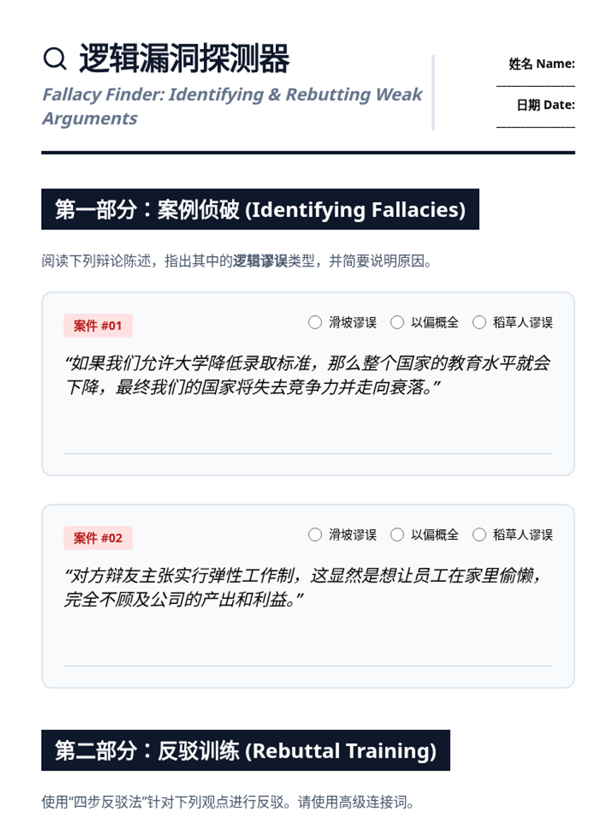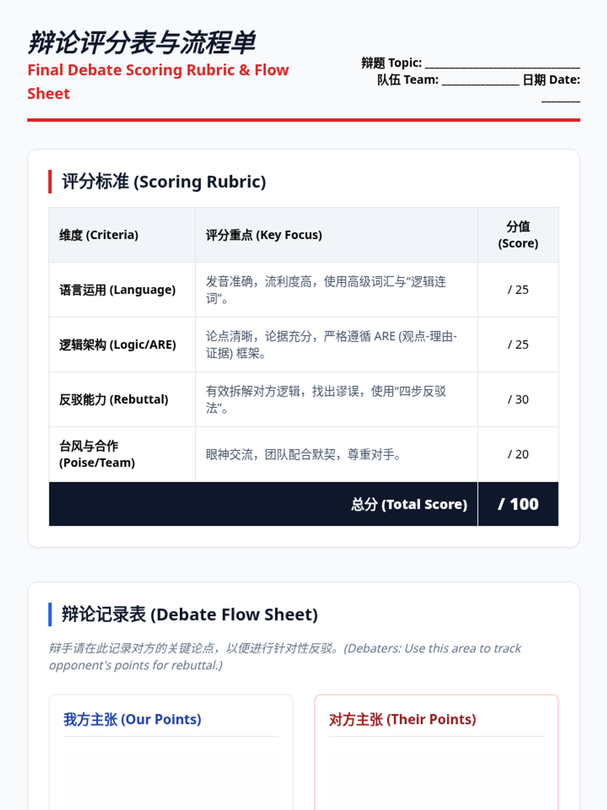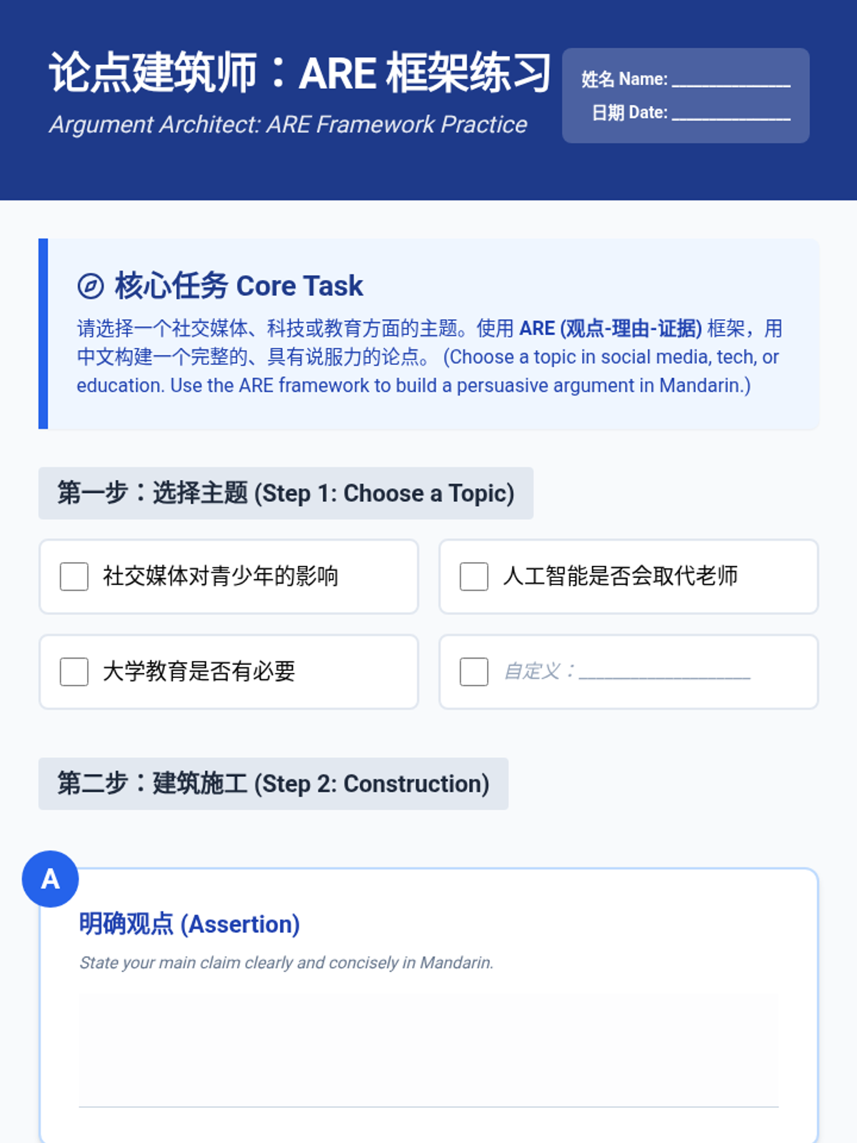 An advanced Mandarin Chinese sequence focused on developing rhetorical skills, logical argumentation, and formal debating techniques for contemporary social issues. Students progress from learning specific connectors and transitions to participating in a full structured debate.