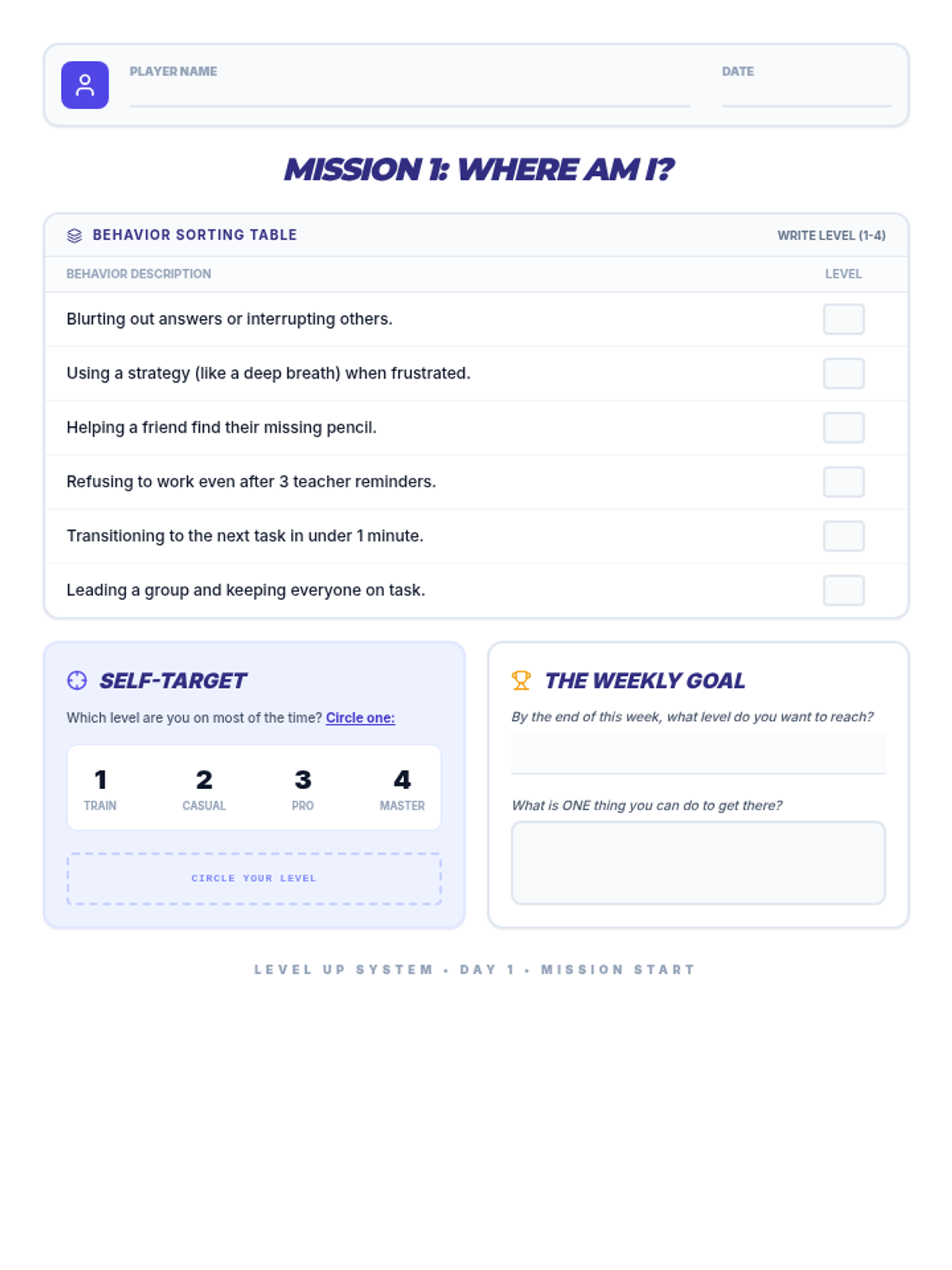 A 5-day SEL rollout sequence for middle schoolers, focusing on a simplified behavioral level system with three core focus areas: On-Task, Respect, and Safe Body. The system builds buy-in, defines expectations, and implements a consistent point-tracking scoreboard.
