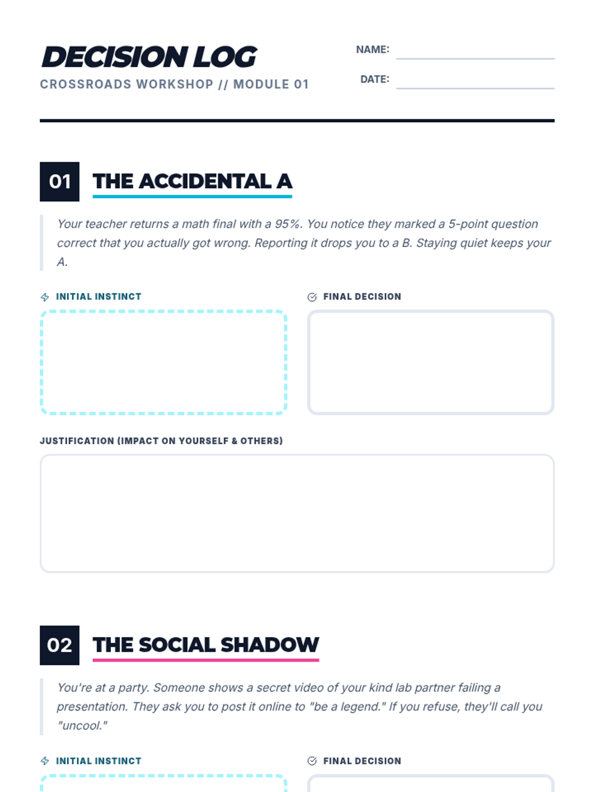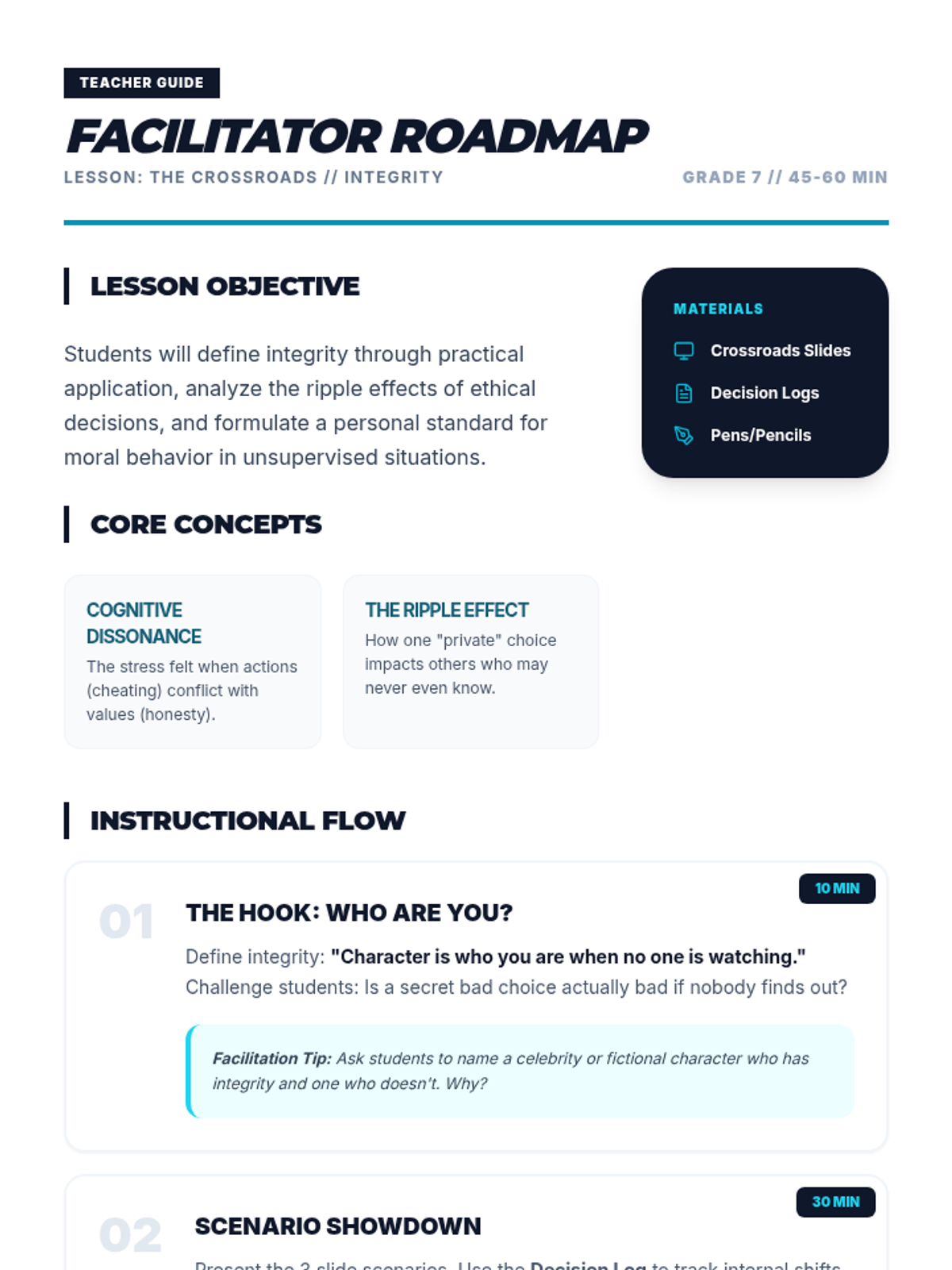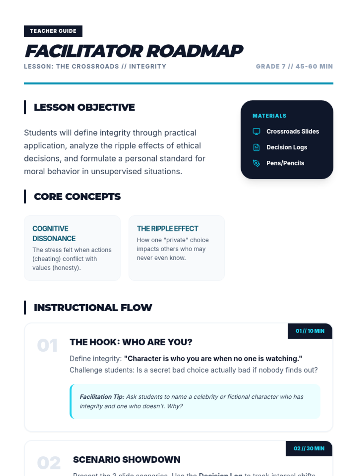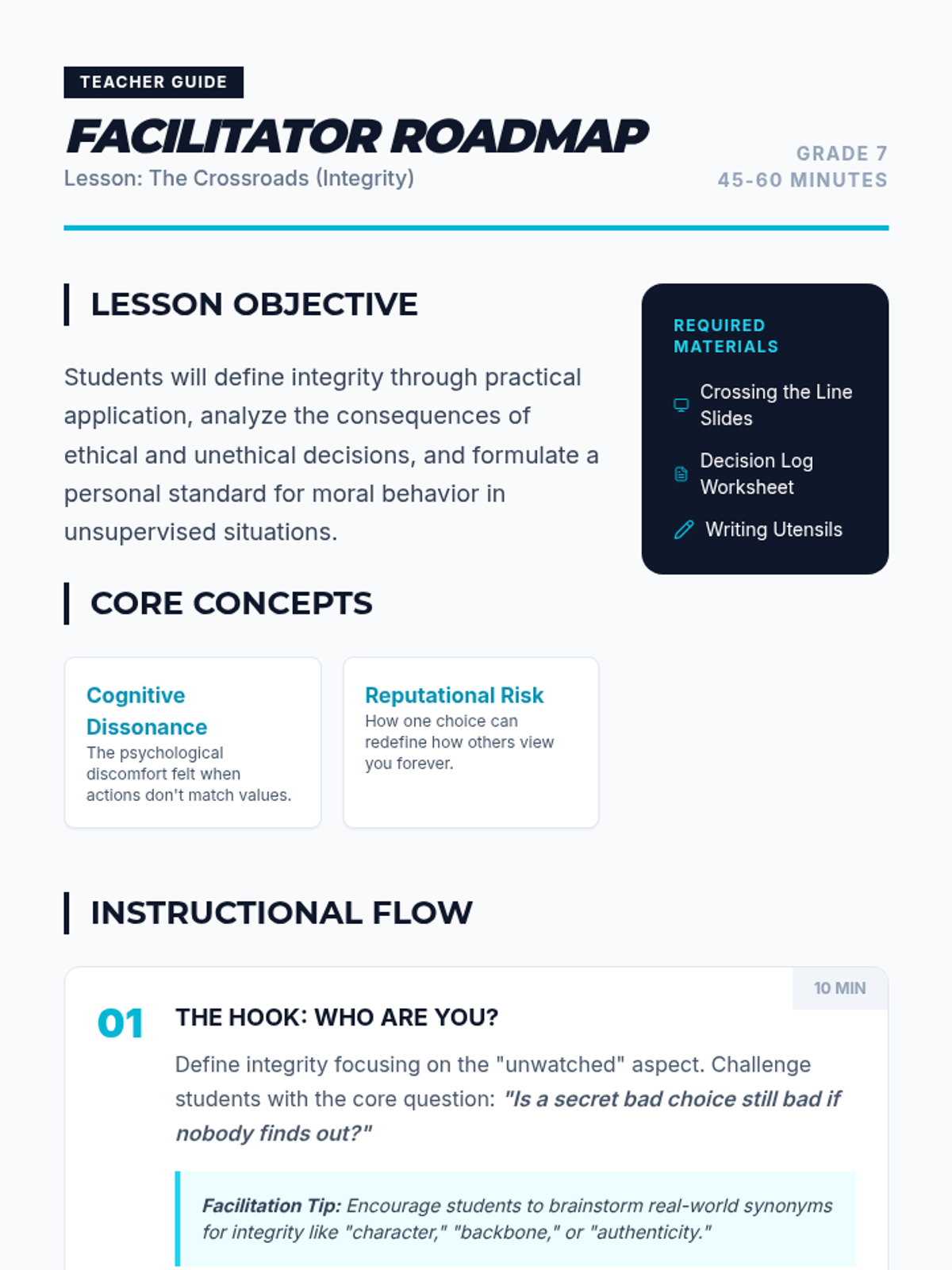 A series of lessons focused on character development and ethical decision-making for middle school students, starting with the core concept of integrity.