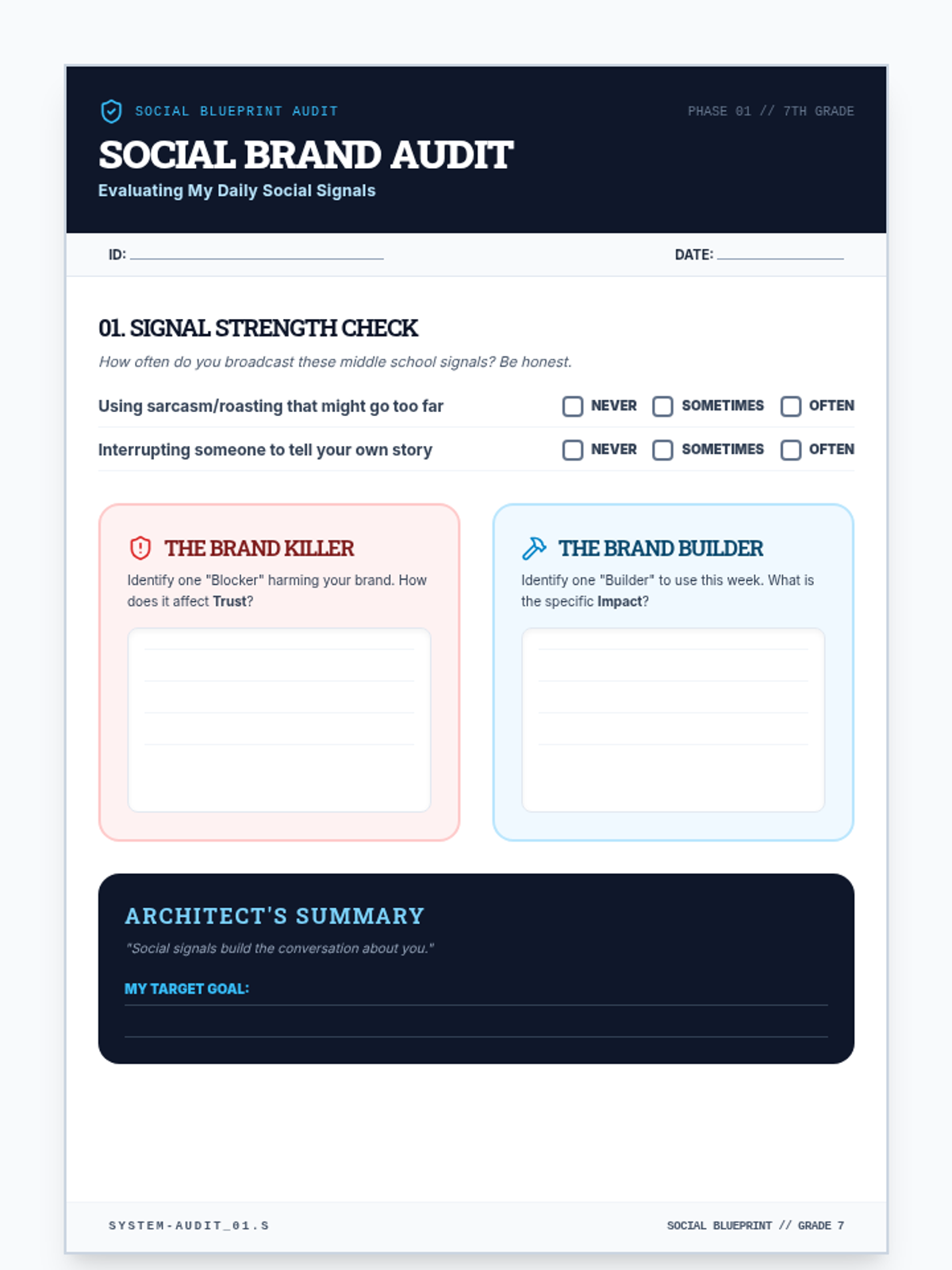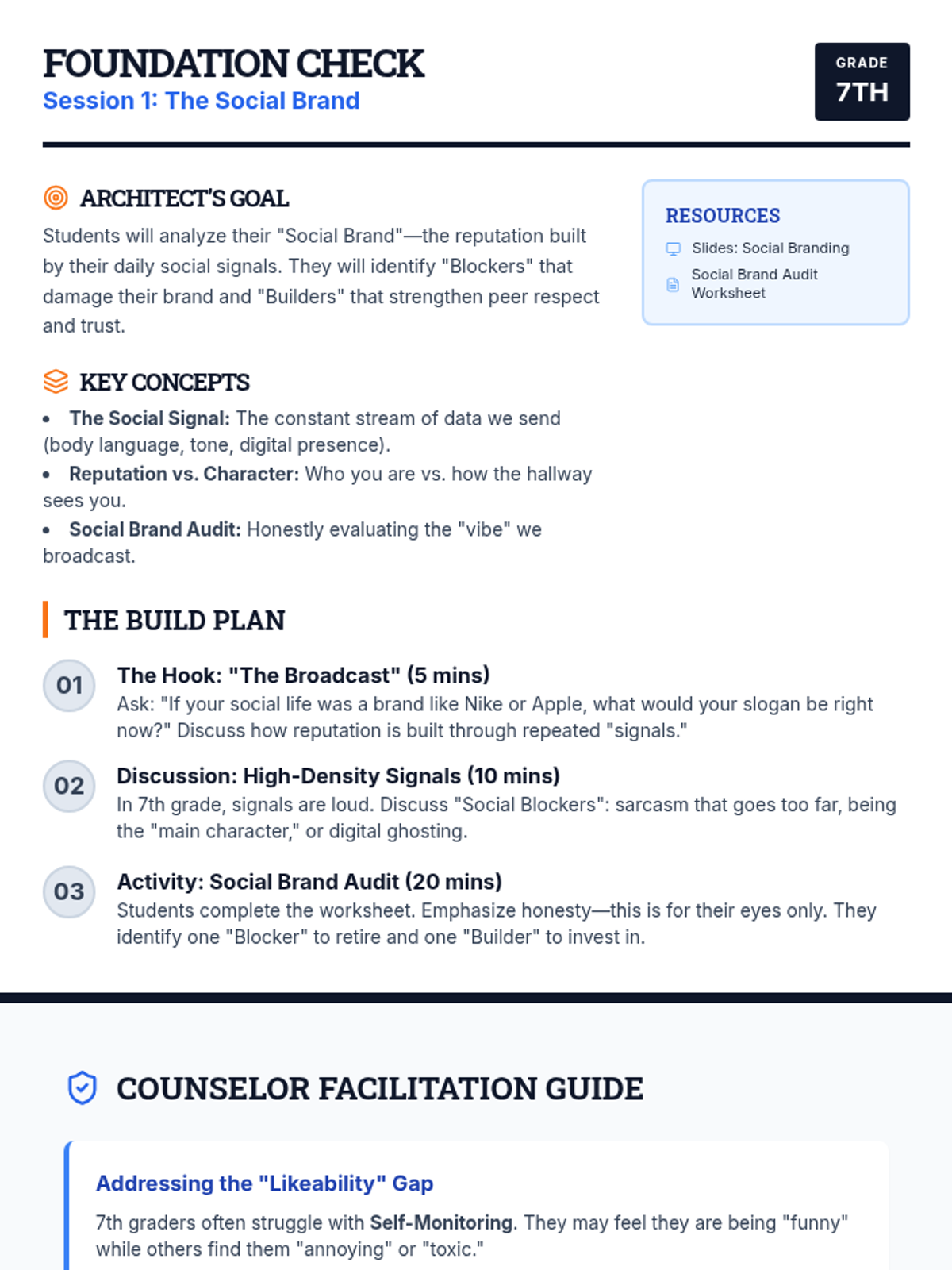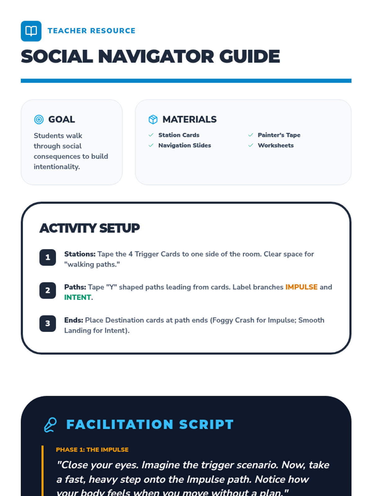 A tier 2 social skills curriculum for middle and high school students focusing on perspective taking, conflict resolution, and the intersection of digital and physical social interactions. It utilizes a 'Social Blueprint' theme to help students deconstruct and rebuild their social responses.
