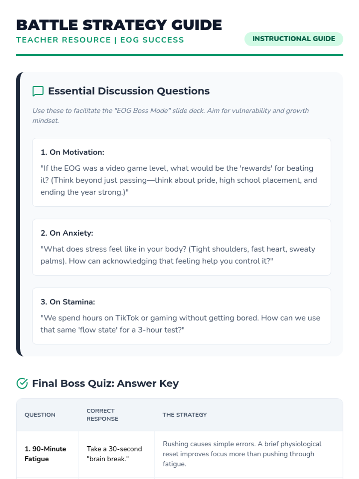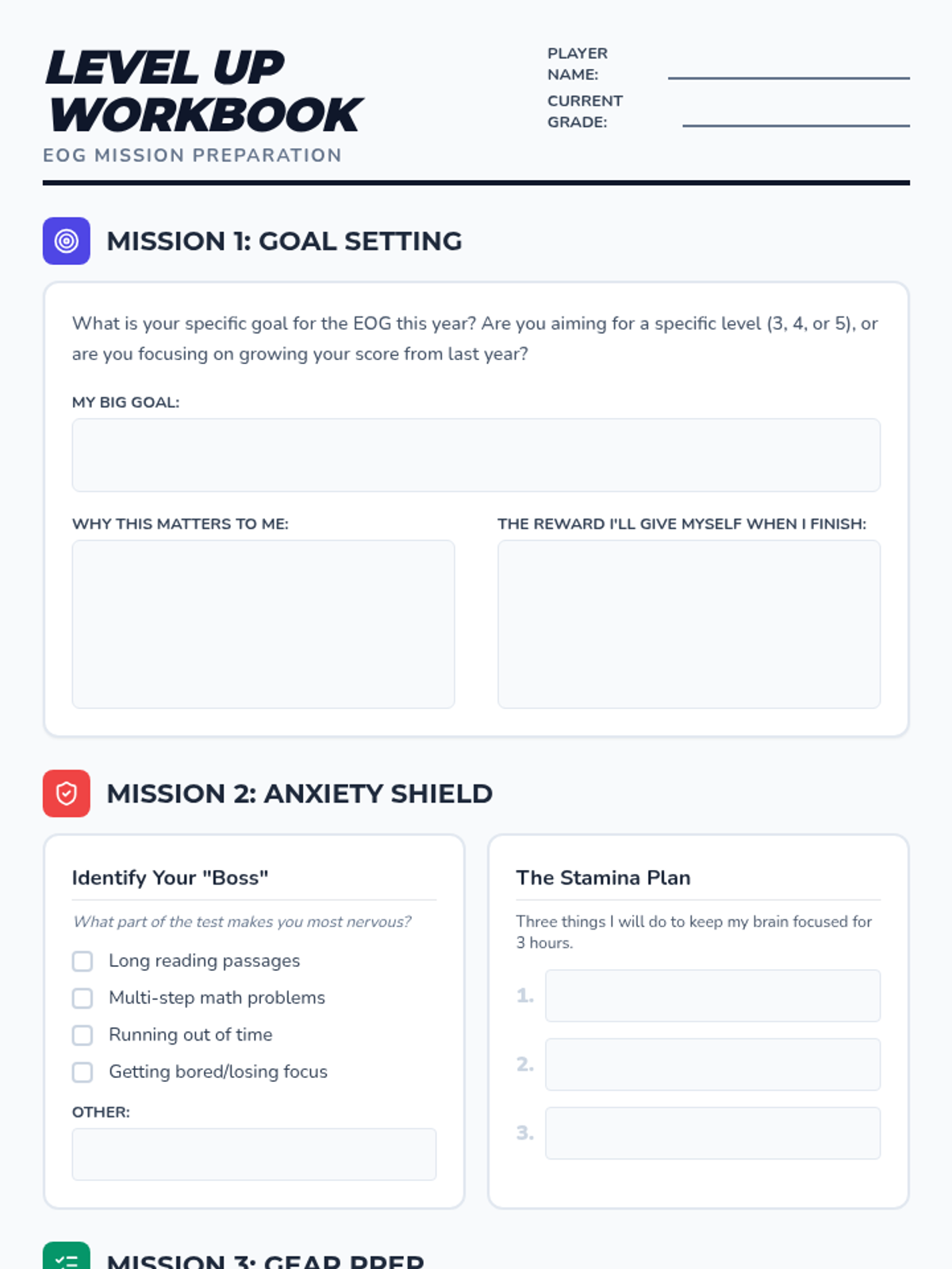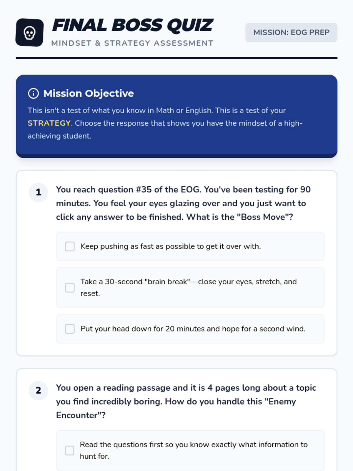 A comprehensive program designed to equip 6th, 7th, and 8th graders with the psychological and organizational tools needed to conquer End-of-Grade (EOG) testing. The sequence focuses on mindset, stamina, and practical executive functioning skills.