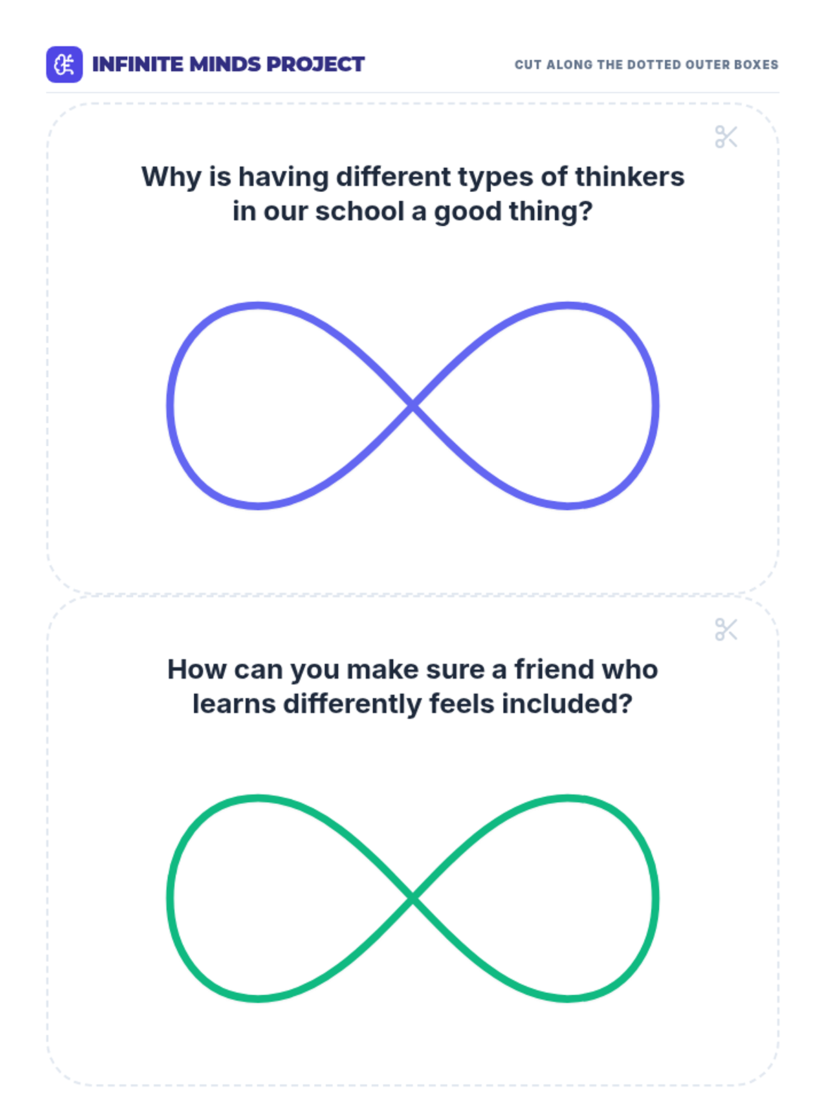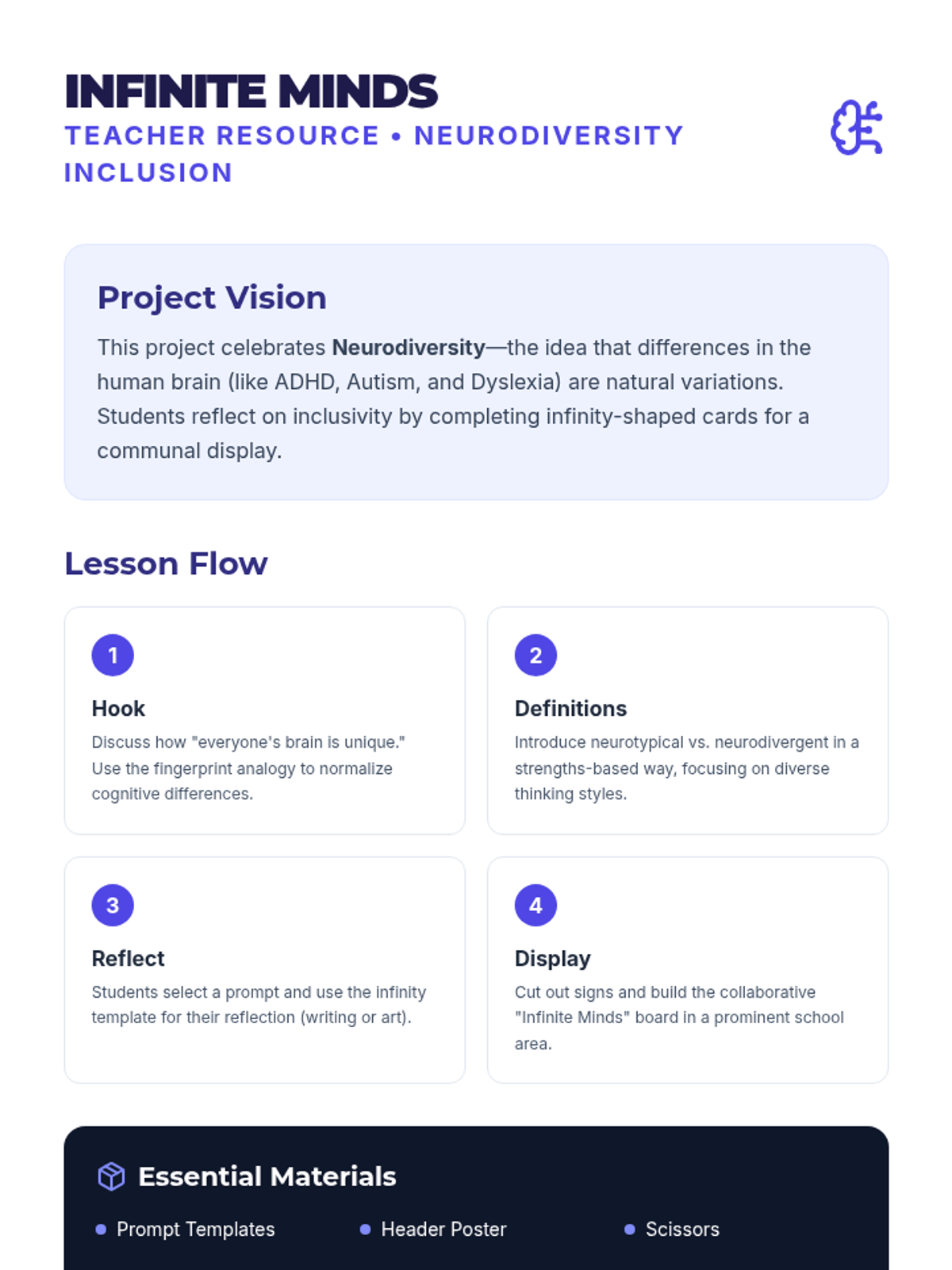 A collection of resources focused on neurodiversity inclusion for middle school students, featuring reflective writing prompts on infinity-shaped templates for a bulletin board display.