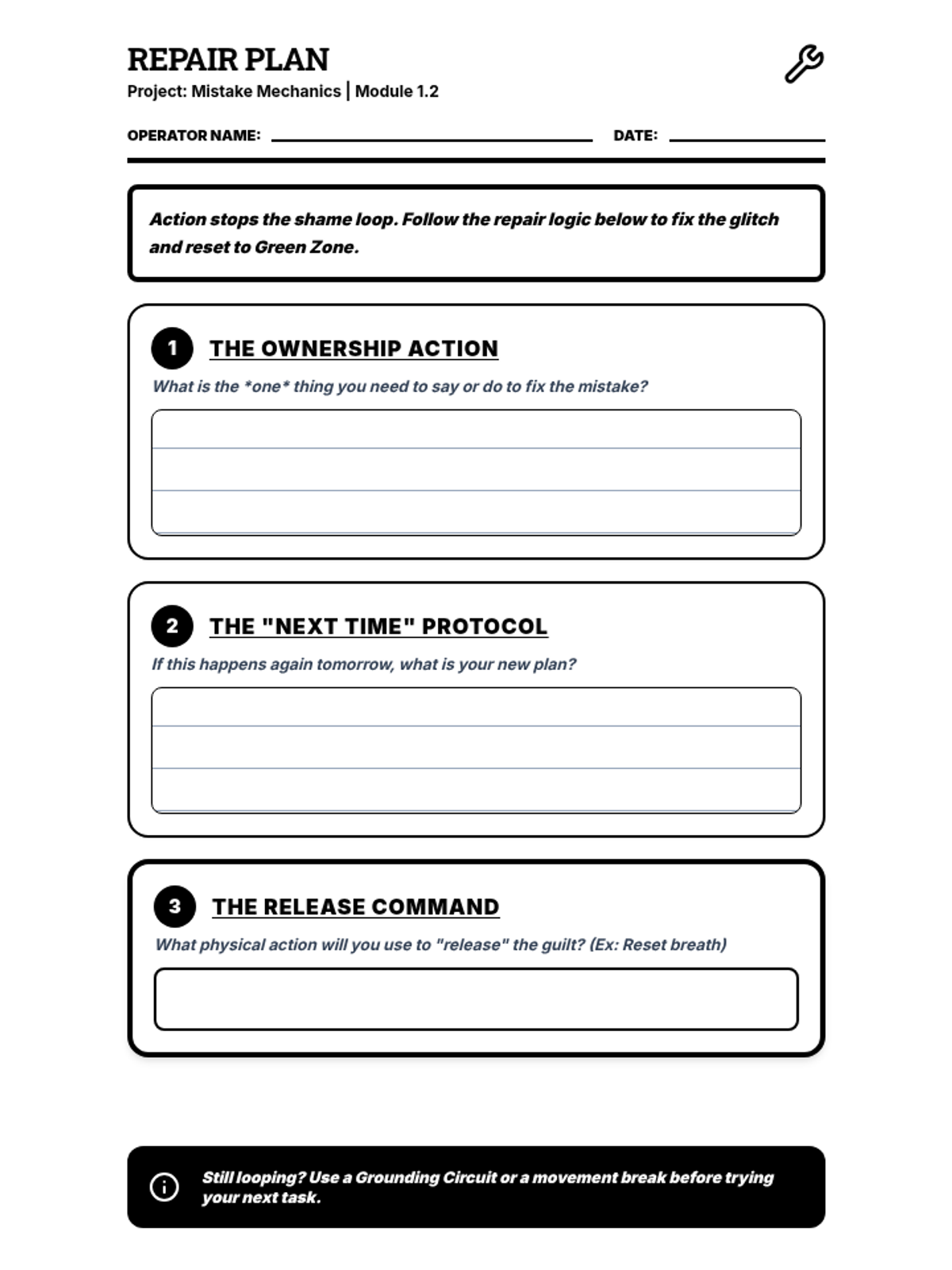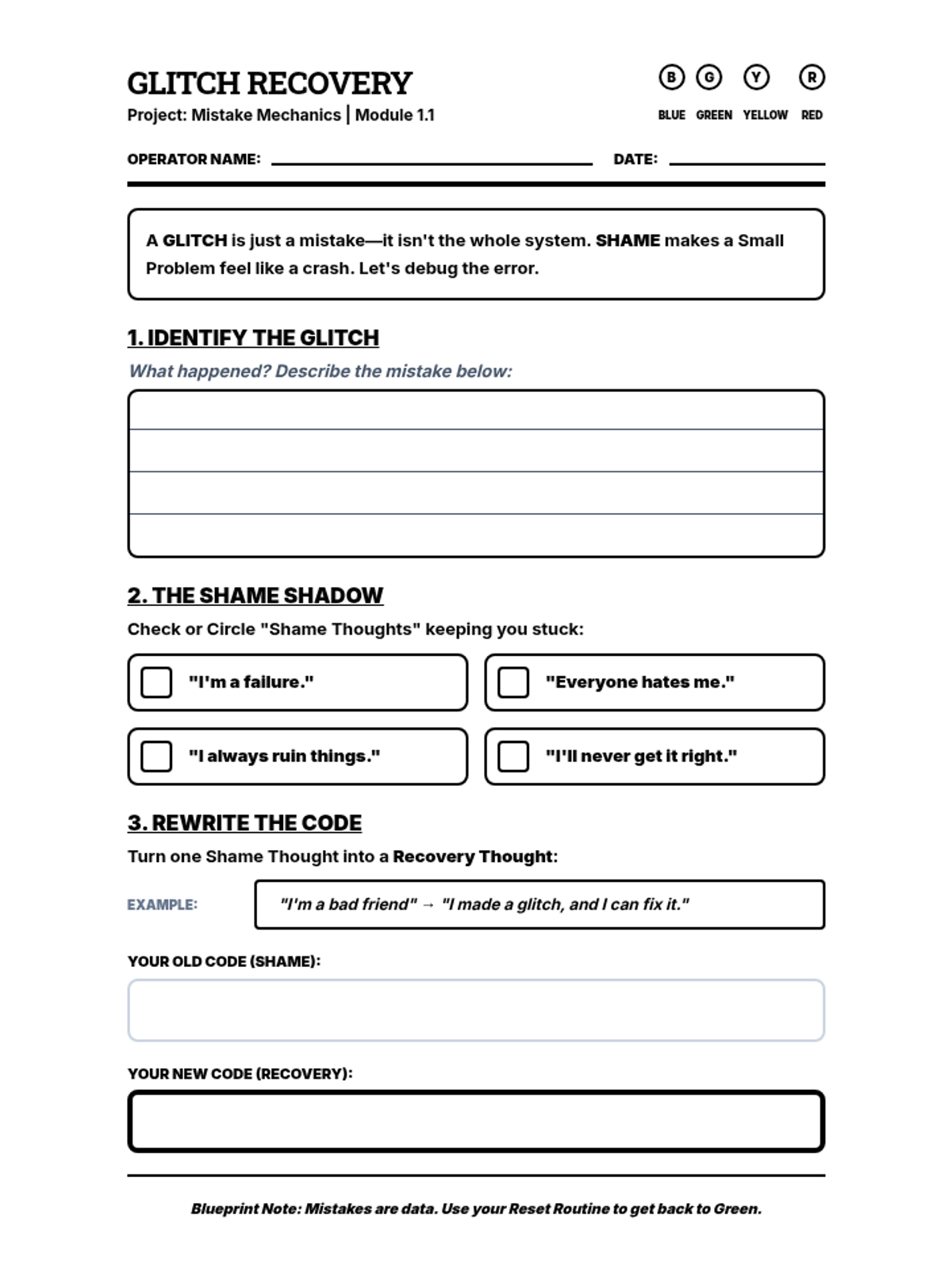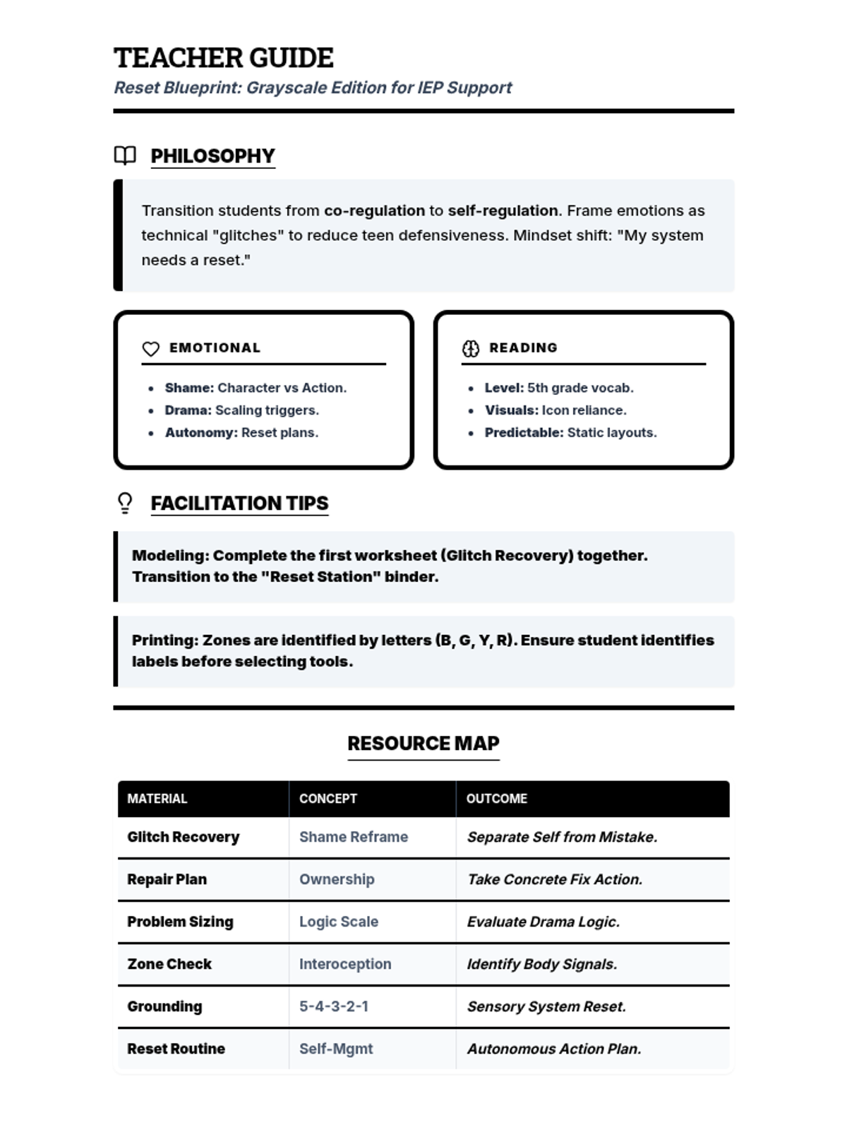 A comprehensive set of independent worksheets designed for a 13-year-old student to manage shame after mistakes, navigate peer drama using the Zones of Regulation, and apply grounding techniques for faster resetting. The materials use a 'Reset Blueprint' theme to make social-emotional learning feel like technical skill-building rather than therapy.