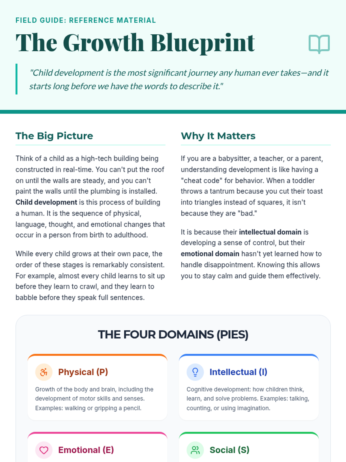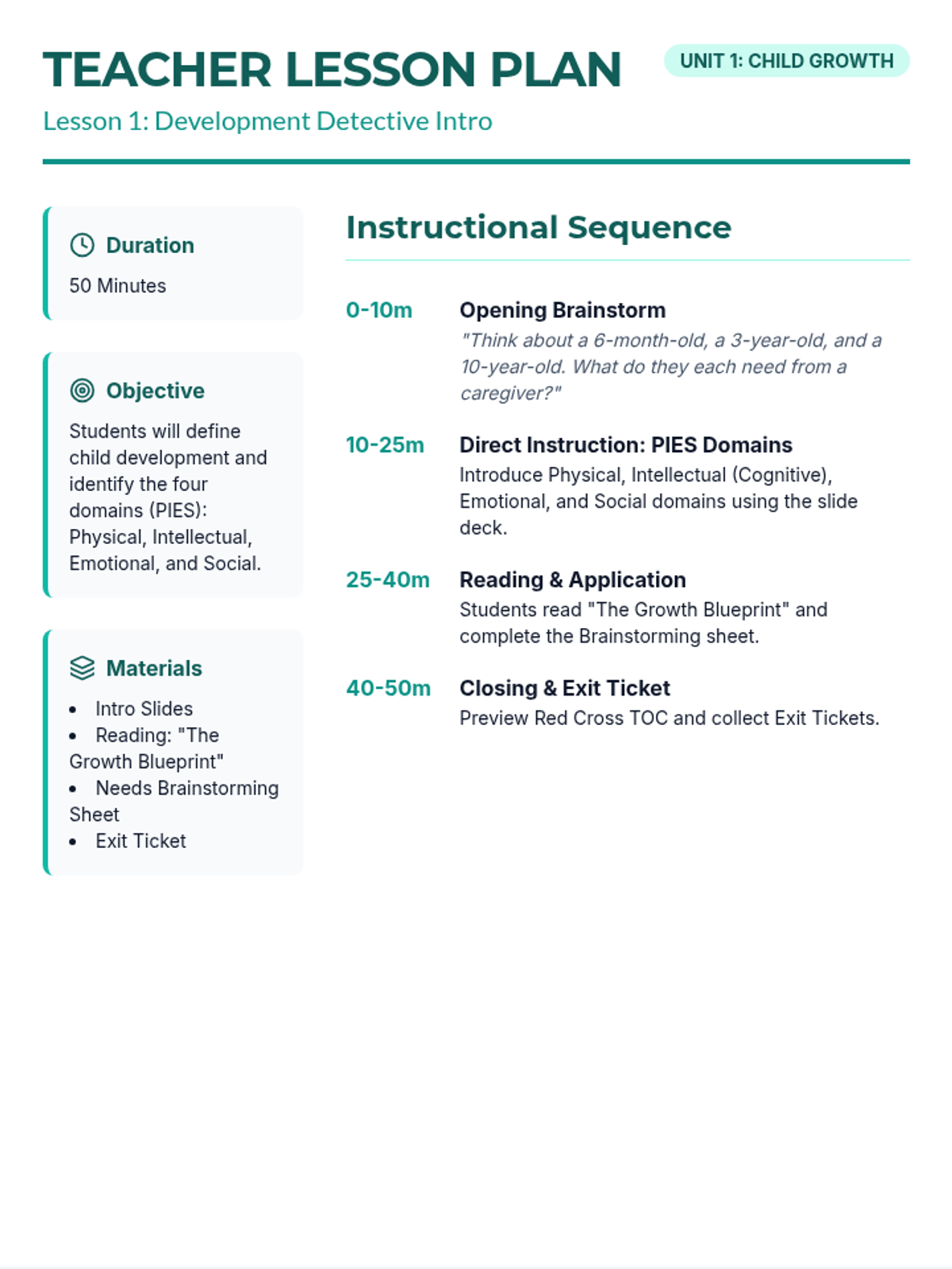 A comprehensive 7th-grade child development course focused on safety, basic caregiving, developmental milestones, and professional babysitting business skills. The curriculum is designed for 45-minute class periods and aligns with Urbandale CSD standards and proficiency scales.